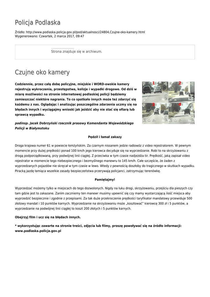 Policja Podlaska Źródło: http://www.podlaska.policja.gov.pl/pod/aktualnosci/24804,Czujne-oko-kamery.html Wygenerowano: Czwartek, 2 marca 2017, 09:47 Strona znajduje się w archiwum. Czujne oko kamery Codziennie, przez całą dobę policyjne, miejskie i WORD-owskie kamery rejestrują wykroczenia, przestępstwa, kolizje i wypadki drogowe. Od dziś w miarę możliwości na stronie internetowej podlaskiej policji będziemy zamieszczać niektóre nagrania. To co spotkało innych może też zdarzyć się każdemu z nas. Oglądając i analizując poszczególne zdarzenia uczmy się na błędach innych i wyciągajmy wnioski jak jeździć aby nie stać się ofiarą lub sprawcą wypadku. podinsp. Jacek Dobrzyński rzecznik prasowy Komendanta Wojewódzkiego Policji w Białymstoku Pędził i łamał zakazy Droga krajowa numer 61 w powiecie łomżyńskim. Za czarnym nissanem jedzie radiowóz z video rejestratorem. W pewnym momencie przy dużej prędkości ponad 100 km/h jego kierowca decyduje się na wyprzedzanie. Robi to na skrzyżowaniu z drogą podporządkowaną, przy podwójnej linii ciągłej. Z przeciwka w tym czasie nadjeżdża tir. Prędkość, jaką zapisał video rejestrator w momencie tego niebezpiecznego i bezmyślnego manewru to 145 km/h. Całe szczęście, że żaden z wyprzedzanych pojazdów nie skręcał w tym czasie w lewo. Wtedy z pewnością doszłoby do tragicznego w skutkach wypadku. Piracką jazdę łamiąca wszelkie zasady bezpieczeństwa przerywają policjanci, zatrzymując terenówkę. Pamiętajmy! Wyprzedzać możemy tylko w miejscach do tego dozwolonych. Nigdy na łuku drogi, skrzyżowaniu, przejściu dla pieszych czy tam gdzie jest to zakazane. Zanim zaczniemy ten manewr musimy upewnić się czy mamy wystarczającą ilość miejsca aby wyprzedzić bezpiecznie i zgodnie z przepisami. Za tak duże przekroczenie prędkości taryfikator mandatowy przewiduje 500 złotowy mandat i 10 punktów karnych. Wyprzedzanie na skrzyżowaniu może „kosztować” kierowcę 300 zł i 5 punktów, a wyprzedzanie na podwójnej linii ciągłej to koszt 200 złotych i 5 punktów karnych. Obejrzyj film i ucz się na błędach innych. * wykorzystując zawarte na stronie treści, zdjęcia lub filmy, proszę powoływać się na źródło informacji: www.podlaska.policja.gov.pl ZAŁĄCZNIKI DO STRONY Film zarejestrowany przez policyjny radiowóz 356.99 KB Ocena: 0/5 (0) Tweetnij