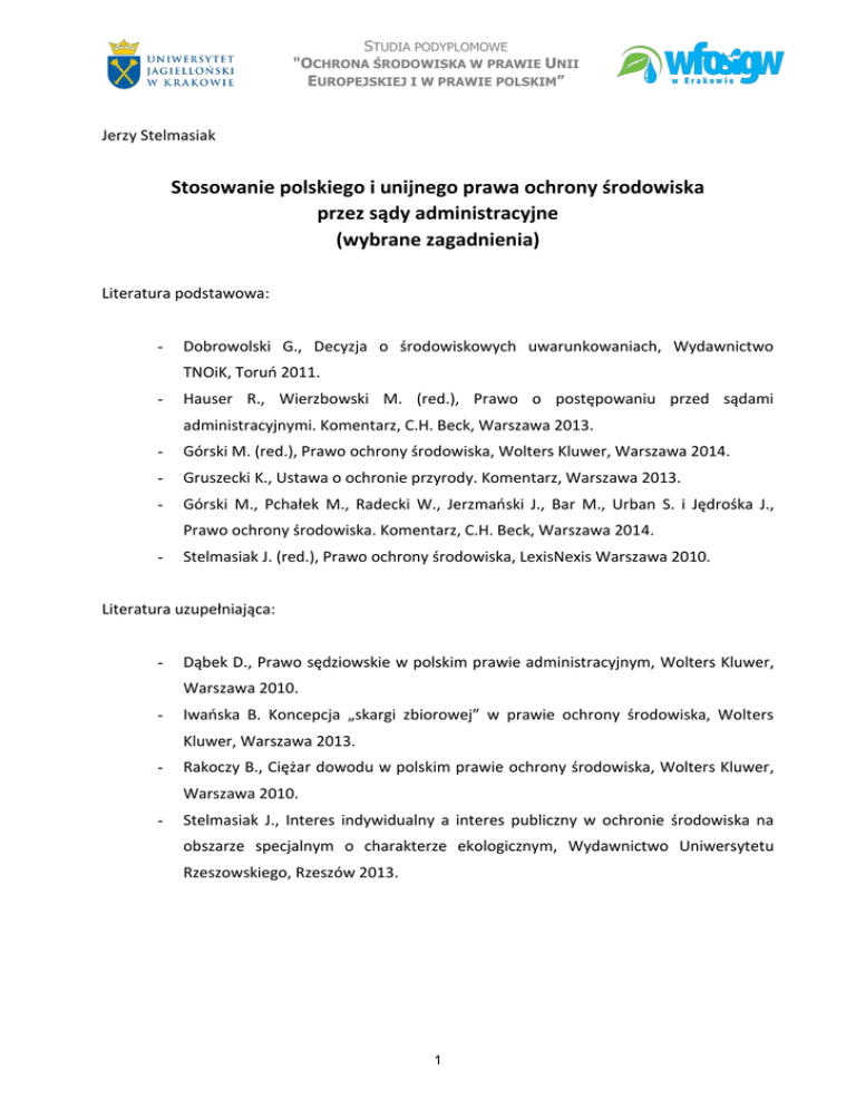 STUDIA PODYPLOMOWE "OCHRONA ŚRODOWISKA W PRAWIE UNII EUROPEJSKIEJ I W PRAWIE POLSKIM” Jerzy Stelmasiak Stosowanie polskiego i unijnego prawa ochrony środowiska przez sądy administracyjne (wybrane zagadnienia) Literatura podstawowa: - Dobrowolski G., Decyzja o środowiskowych uwarunkowaniach, Wydawnictwo TNOiK, Toruń 2011. - Hauser R., Wierzbowski M. (red.), Prawo o postępowaniu przed sądami administracyjnymi. Komentarz, C.H. Beck, Warszawa 2013. - Górski M. (red.), Prawo ochrony środowiska, Wolters Kluwer, Warszawa 2014. - Gruszecki K., Ustawa o ochronie przyrody. Komentarz, Warszawa 2013. - Górski M., Pchałek M., Radecki W., Jerzmański J., Bar M., Urban S. i Jędrośka J., Prawo ochrony środowiska. Komentarz, C.H. Beck, Warszawa 2014. - Stelmasiak J. (red.), Prawo ochrony środowiska, LexisNexis Warszawa 2010. Literatura uzupełniająca: - Dąbek D., Prawo sędziowskie w polskim prawie administracyjnym, Wolters Kluwer, Warszawa 2010. - Iwańska B. Koncepcja „skargi zbiorowej” w prawie ochrony środowiska, Wolters Kluwer, Warszawa 2013. - Rakoczy B., Ciężar dowodu w polskim prawie ochrony środowiska, Wolters Kluwer, Warszawa 2010. - Stelmasiak J., Interes indywidualny a interes publiczny w ochronie środowiska na obszarze specjalnym o charakterze ekologicznym, Wydawnictwo Uniwersytetu Rzeszowskiego, Rzeszów 2013. 1 STUDIA PODYPLOMOWE "OCHRONA ŚRODOWISKA W PRAWIE UNII EUROPEJSKIEJ I W PRAWIE POLSKIM” Orzecznictwo: - Uchwała składu siedmiu sędziów Naczelnego Sądu Administracyjnego z 12 grudnia 2011 r., II OPS 2/11 ONSAiWSA 2012/2/22, LEX nr 1074802, Prok.i Pr.wkł. 2013/4/42. - Uchwała składu siedmiu sędziów Naczelnego Sądu Administracyjnego z 18 grudnia 2014 r., II OPS 1/14, nie publ. - Wyrok Naczelnego Sądu Administracyjnego z 2 października 2012 r., II OSK 1246/12, LEX nr 1233707 (implementacja prawa UE). - Wyrok Naczelnego Sądu Administracyjnego z 4 listopada 2010 r., II OSK 984/09, LEX nr 746931 (status strony w sprawie pozwolenia zintegrowanego). - Wyrok Naczelnego Sądu Administracyjnego z 16 grudnia 2014 r., II OSK 2957/12, nie publ., (status strony w sprawie pozwolenia wodnoprawnego). - Wyrok Naczelnego Sądu Administracyjnego z 3 lipca 2012 r., II OSK 616/11, LEX nr 1252127 (udział społeczeństwa). - Wyrok Naczelnego Sądu Administracyjnego z 29 maja 2012 r., II OSK 444/11, LEX nr 1252074 (status organizacji ekologicznej). - Wyrok Naczelnego Sądu Administracyjnego z 13 marca 2014 r., II OSK 2525/12, LEX 1488189 (legitymacja procesowa stowarzyszenia zwykłego jako organizacji ekologicznej). - Wyrok Naczelnego Sądu Administracyjnego z 14 maja 2014 r., II OSK 2966/12, LEX 1488189 (legitymacja procesowa stowarzyszenia zwykłego jako organizacji ekologicznej). - Wyrok Naczelnego Sądu Administracyjnego z 30 września 2014 r., II OSK 729/13, LEX 1488189 (legitymacja procesowa stowarzyszenia zwykłego jako organizacji ekologicznej). - Wyrok Naczelnego Sądu Administracyjnego z 12 września 2014 r., II OSK 580/13, nie publ. (osnowa decyzji o środowiskowych uwarunkowaniach realizacji przedsięwzięcia). - Wyrok Naczelnego Sądu Administracyjnego z 13 marca 2014 r., II OSK 2480/12, nie publ. (ocena oddziaływania na środowisko). - Wyrok Naczelnego Sądu Administracyjnego z 6 marca 2013 r., II OSK 2147/11, LEX nr 1340201 (legalizacja samowoli budowlanej, a decyzja środowiskowa). - Wyrok Naczelnego Sądu Administracyjnego z 23 maja 2014 r., II OSK 3013/12, LEX nie publ. (legalizacja samowoli budowlanej, a decyzja środowiskowa). 2 STUDIA PODYPLOMOWE "OCHRONA ŚRODOWISKA W PRAWIE UNII EUROPEJSKIEJ I W PRAWIE POLSKIM” - Wyrok Naczelnego Sądu Administracyjnego z 3 lutego 2014 r., II OSK 2402/11, nie publ. (opinia a uzgodnienie w ramach oceny oddziaływania na środowisko). - Wyrok Naczelnego Sądu Administracyjnego z 6 maja 2014 r., II OSK 2904/12, LEX nr 1481942 (brak oceny oddziaływania na środowisko). - Wyrok Naczelnego Sądu Administracyjnego z 19 stycznia 2012 r., II OSK 615/11, LEX nr 1123134 (ocena raportu o oddziaływaniu przedsięwzięcia na środowisko). - Wyrok Naczelnego Sądu Administracyjnego z 25 marca 2014 r., II OSK 2594/12, LEX nr 1488194 (ocena raportu o oddziaływaniu przedsięwzięcia na środowisko). - Wyrok Naczelnego Sądu Administracyjnego z 28 stycznia 2014 r., II OSK 2029/12, LEX nr 1450852 (ocena raportu o oddziaływaniu przedsięwzięcia na środowisko). - Wyrok Naczelnego Sądu Administracyjnego z 26 marca 2014 r., II OSK 2599/12, nie publ. (warianty realizacji przedsięwzięcia w raporcie). - Wyrok Naczelnego Sądu Administracyjnego z 20 maja 2014 r., II OSK 2999/12, nie publ. (warianty realizacji przedsięwzięcia w raporcie). - Wyrok Naczelnego Sądu Administracyjnego z 20 marca 2014 r., II OSK 2564/12, LEX nr 1511156 (warianty realizacji przedsięwzięcia w raporcie). - Wyrok Naczelnego Sądu Administracyjnego z 26 kwietnia 2014 r., II OSK 2628/11, LEX nr 1337407 (plan miejscowy, a decyzja środowiskowa). - Wyrok Naczelnego Sądu Administracyjnego z 14 marca 2014 r., II OSK 2546/12, LEX nr 1458791 (miejscowy plan zagospodarowania przestrzennego a decyzja środowiskowa). - Wyrok Naczelnego Sądu Administracyjnego z 21 października 2014 r., II OSK 847/13, nie publ. (tzw. salami slicing czyli dzielenie, etapowanie przedsięwzięcia). - Wyrok Naczelnego Sądu Administracyjnego z 9 września 2013 r., II OSK 2396/11, LEX 1337355 (status strony, a udział społeczeństwa). - Wyrok Naczelnego Sądu Administracyjnego z 11 lipca 2013 r., II OSK 639/13, LEX nr 1369033 (charakter prawny raportu o oddziaływaniu przedsięwzięcia na środowisko). 3 STUDIA PODYPLOMOWE "OCHRONA ŚRODOWISKA W PRAWIE UNII EUROPEJSKIEJ I W PRAWIE POLSKIM” Orzecznictwo - ochrona przyrody: - Wyrok Trybunału Konstytucyjnego z 1 lipca 2014 r., SK 6/12, Dz.U. z 2014 r., poz. 926 (administracyjna kara pieniężna za wycięcie drzew). - Wyrok Naczelnego Sądu Administracyjnego z 4 grudnia 2014 r., II OSK 2696/14, nie publ. (administracyjna kara pien