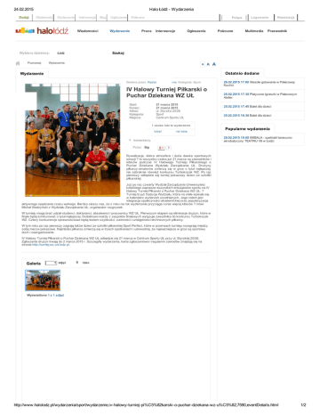 24.02.2015 Dodaj: Halo Łódź Wydarzenia Wiadomość Wydarzenie Interwencja Wiadomości Wybierz dzielnicę: Poznawaj Blog Ogłoszenie Polecane Wydarzenia Praca Połącz Interwencje Ogłoszenia Polecane Logowanie Multimedia Rejestracja Przewodnik Szukaj: Łódź Wydarzenia A A A Ostatnio dodane Wydarzenie Dodano przez: Wydzial_Zarzadzania, Kategoria: Sport IV Halowy Turniej Piłkarski o Puchar Dziekana WZ UŁ Start: Koniec: Adres: Kategoria: Miejsce: 21 marca 2015 21 marca 2015 ul. Styrska 20/26 Sport Centrum Sportu UŁ 1 osoba lubi to wydarzenie lubię! 0 nie lubię komentarzy 26.02.2015 17:00 Wesołe gotowanie w Pałacowej Kuchni 25.02.2015 17:30 Platyczne igraszki w Pałacowym Atelier 25.02.2015 17:45 Balet dla dzieci 25.02.2015 16:30 Balet dla dzieci Popularne wydarzenia 28.02.2015 18:00 IMIBALA spektakl taneczno akrobatyczny TEATRU V6 w Łodzi Poleć Bądź pierwszym znajomym, który to poleca. 0 Rywalizacja, dobra atmosfera i duża dawka sportowych emocji ? to wszystko czeka już 21 marca na zawodników i kibiców podczas IV Halowego Turnieju Piłkarskiego o Puchar Dziekana Wydziału Zarządzania UŁ. Drużyny piłkarzyamatorów zmierzą się w grze o tytuł najlepszej, nie zabraknie również konkursu Turbokozak WZ. Po raz pierwszy odbędzie się turniej pokazowy dzieci ze szkółki piłkarskiej. Już po raz czwarty Wydział Zarządzania Uniwersytetu Łódzkiego zaprasza wszystkich entuzjastów sportu na IV Halowy Turniej Piłkarski o Puchar Dziekana WZ UŁ. ? Turniej to już tradycja Wydziału, która na stałe wpisała się w kalendarz wydarzeń uczelnianych. Jego celem jest integracja społeczności akademickiej oraz popularyzacja aktywnego spędzania czasu wolnego. Bardzo cieszy nas, że z roku na rok wydarzenie przyciąga coraz więcej kibiców ? mówi Michał Wadzyński z Wydziału Zarządzania UŁ, organizator rozgrywek. W turnieju mogą brać udział studenci, doktoranci, absolwenci i pracownicy WZ UŁ. Pierwszym etapem są eliminacje drużyn, które w finale będą konkurować o tytuł najlepszej. Dodatkowo każdy z zespołów finałowych wytypuje zawodnika do konkursu Turbokozak WZ. Cztery konkurencje sprawnościowe będą testem szybkości, zwinności i umiejętności technicznych piłkarzy. W tym roku po raz pierwszy zagrają także dzieci ze szkółki piłkarskiej Sport Perfect, które w przerwach turnieju rozegrają między sobą mecze pokazowe. Najmłodsi piłkarze zmierzą się w trzech spotkaniach i udowodnią, że najważniejsze w grze są sportowy duch i zaangażowanie. IV Halowy Turniej Piłkarski o Puchar Dziekana WZ UŁ odbędzie się 21 marca w Centrum Sportu UŁ przy ul. Styrskiej 20/26. Zgłoszenia drużyn trwają do 2 marca 2015 r. Szczegóły wydarzenia, karta zgłoszeniowa i regulamin zawodów znajdują się na stronie http://turniej.wz.uni.lodz.pl. Galeria 1 zdjęć 0 video Wyświetlone 1 z 1 zdjęć http://www.halolodz.pl/wydarzenia/sport/wydarzenie,ivhalowyturniejpi%C5%82karskiopuchardziekanawzu%C5%82,7590,eventDetails.html 1/2