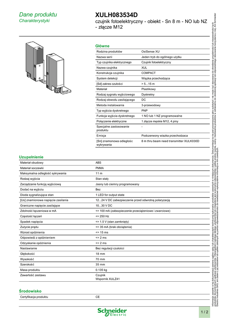 XULH083534D Charakterystyki czujnik fotoelektryczny - obiekt - Sn 8 m - NO lub NZ - złącze M12 Główne Rodzina produktów OsiSense XU Nazwa serii Jeden tryb do ogólnego użytku Typ czujnika elektrycznego Czujnik fotoelektryczny Nazwa czujnika XUL Konstrukcja czujnika COMPACT System detekcji Wiązka przechodząca [Sd] zakres czułości > 5...15 m Materiał Plastikowy Rodzaj sygnału wyjściowego Dyskretny Rodzaj obwodu zasilającego DC Metoda instalowania 3-przewodowy Typ wyjścia dyskretnego PNP Funkcja wyjścia dyskretnego 1 NO lub 1 NZ programowalne Połączenie elektryczne 1 złącze męskie M12, 4 piny Specjalne zastosowanie produktu - Emisja Podczerwony wiazka przechodzaca [Sn] znamonowa odległośc wykrywania 8 m thru beam need transmitter XULK030D Uzupełnienie Materiał obudowy ABS Materiał soczewki PMMA Maksymalna odległość sykrywania 11 m Rodzaj wyjścia Stan stały Zarządzanie funkcją wyjściową Jasny lub ciemny programowany Dodać na wyjściu Bez Dioda sygnalizująca stan 1 LED for output state [Us] znamionowe napięcie zasilania 12...24 V DC zabezpieczenie przed odwrotną polaryzacją Graniczne napięcie zasilające 10...30 V DC Zdolność łączeniowa w mA <= 100 mA (zabezpieczenie przeciążeniowe i zwarciowe) Częstość łączeń <= 250 Hz Spadek napięcia <= 1.5 V (stan zamknięty) Zużycie prądu <= 35 mA (brak obciążenia) Wzrost opóźnienia <= 15 ms Odpowiedź z opóźnieniem <= 2 ms Odzyskanie opóźnienia <= 2 ms Nastawianie Bez regulacji czułości Głębokość 18 mm Wysokość 70 mm Szerokość 35 mm Masa produktu 0.135 kg Zawartość zestawu Czujnik Wspornik XULZ41 Środowisko Certyfikacja produktu CE 1/2 Informacje zawarte w tej dokumentacji zawiera ogólne opisy lub charakterystyki technicznej wykonania produktów zawartych w niniejszym dokumencie. Dokumentacja ta nie jest przeznaczona jako substytut i nie może być stosowana do określenia przydatności lub niezawodności tych produktów dla konkretnych aplikacji użytkownika. Obowiązkiem każdego takiego użytkownika lub integratora jest wykonanie odpowiedniej i pełnej analizy ryzyka, oceny i testowania produktów w odniesieniu do określonej aplikacji lub odpowiedniego stosowania korzystania z niej .Ani Schneider Electric Industries SAS, ani żaden z jej oddziałów lub spółek zależnych są ponosi odpowiedzialności za niewłaściwe wykorzystanie informacji w nim zawartych. Dane produktu Temepratura otoczenia dla pracy -25...55 °C Temepratura otoczenia dla przechowywania -40...70 °C Odporność na wibracje 7 gn +/- 2 mm 10...55 Hz) zgodny z IEC 60068-2-6 Odporność na wstrząsy 20 gn 11 ms) zgodny z IEC 60068-2-27 Stopień ochrony IP IP67 zgodny z IEC 60529 IP671 zgodny z NF C 20-010 2/2