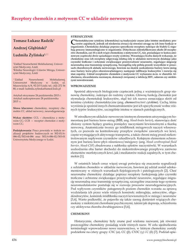 Receptory chemokin z motywem CC w układzie nerwowym Tomasz Łukasz Radzik 1 Andrzej Głąbiński2 Ludmiła Żylińska1,* Zakład Neurochemii Molekularnej, Uniwersytet Medyczny, Łódź 2 Klinika Neurologii i Udarów Mózgu, Uniwersytet Medyczny, Łódź 1 Zakład Neurochemii Molekularnej, Uniwersytet Medyczny w Łodzi, ul. Mazowiecka 6/8, 92-215 Łódź; tel.: (42) 272 56 80, e-mail: [email protected] * Artykuł otrzymano 24 października 2015 r. Artykuł zaakceptowano 28 października 2015 r. Słowa kluczowe: chemokiny, receptory chemokin CC, układ nerwowy, neurodegeneracja Wykaz skrótów: CCL – chemokina z motywem CC; CCR — receptor chemokin z motywem CC; Podziękowania: Praca powstała w trakcie realizacji projektów badawczych nr 502-03/6086-02/502-64-086 oraz 503/6-086-02/503-01 Uniwersytetu Medycznego w Łodzi. STRESZCZENIE C hemotaktyczne cytokiny (chemokiny) są tradycyjnie znane jako istotne mediatory procesów zapalnych, jednak od niedawna zwraca się również uwagę na ich inne funkcje w organizmie. Chemokiny działając poprzez specyficzne receptory należące do białek G regulują procesy immunologiczne w organizmie. Dotychczas zidentyfikowano około 20 receptorów chemokin, zaś 10 z nich wiąże chemokiny z motywem CC, tzn. posiadające w końcu aminowym cząsteczki dwie sąsiadujące reszty cysteiny. Wzrastająca liczba danych wskazuje, że chemokiny oraz ich receptory odgrywają istotną rolę w układzie nerwowym działając jako czynniki troficzne i ochronne zwiększające przeżywalność neuronów, regulujące migrację neuronalną oraz transmisję synaptyczną. Szczególną rolę pełnią przede wszystkim w procesach chorobowych układu nerwowego, bowiem na skutek uszkodzenia bariery krew-mózg oraz bariery krew-płyn rdzeniowo/mózgowy następuje infiltracja leukocytów i rozwija się stan zapalny. Udział receptorów chemokin z motywem CC wykazano m.in. w chorobie Alzheimera, stwardnieniu rozsianym, demencji związanej z infekcją HIV, udarem czy niektórymi nowotworami. WPROWADZENIE Spośród aktywnych biologicznie cząsteczek jedną z ważniejszych grup stanowią chemokiny, należące do rodziny cytokin. Główną funkcją chemokin jest stymulacja chemotaksji leukocytów, stąd też ich nazwa oznaczająca skrót od terminu cytokiny chemotaktyczne (ang. chemoattractant cytokine). Cechą, która wyróżnia je spośród innych chemoatraktantów jest ich specyficzność wobec różnych typów leukocytów, szczególnie istotna w stanach patologicznych. W ośrodkowym układzie nerwowym istotnym elementem utrzymującym homeostazę jest bariera krew-mózg (BBB, ang. blood-brain barier), stanowiąca dość złożony system będący granicą pomiędzy naczyniami krwionośnymi a tkanką nerwową. Anatomicznie tworzy go śródbłonek mózgowych naczyń włosowatych, co pozwala na kontrolowany przepływ związków zawartych we krwi, często wymagających aktywnego transportu, a także chroni mózg przed niekontrolowanym napływem czynników szkodliwych. Kolejnym elementem ochronnym jest bariera krew-płyn rdzeniowo/mózgowy (ang. blood cerebrospinal fluid barrier, blood-CSF) zbudowana z nabłonka splotów naczyniówki. W warunkach uszkodzenia obu barier dochodzi do niekontrolowanego przepływu zarówno elementów morfotycznych krwi, jak i mediatorów reakcji zapalnych, w tym chemokin [1]. W ostatnich latach coraz więcej uwagi poświęca się znaczeniu sygnalizacji z udziałem chemokin w układzie nerwowym, bowiem jej udział został udokumentowany w różnych warunkach fizjologicznych i patologicznych [2]. Choć neuronalne chemokiny działając poprzez receptory funkcjonują jako czynniki troficzne i ochronne zwiększające przeżywalność neuronów, regulujące migrację neuronalną oraz transmisję synaptyczną, szczególne znaczenie tego systemu neuromodulatorów postuluje się w rozwoju procesów neurodegeneracyjnych. Pod wpływem czynników patogennych poziom chemokin wzrasta za sprawą wydzielania ich przez wiele różnych komórek: mikrogleju, astrocytów, oligodendrocytów, komórek śródbłonka naczyń krwionośnych w mózgu i neuronów [3,4]. Warto podkreślić, że pojawiło się także szereg doniesień wiążących chemokiny z niektórymi chorobami psychicznymi, takimi jak depresja, schizofrenia czy afektywna choroba dwubiegunowa [5,6]. CHEMOKINY Historycznie, chemokiny były znane pod wieloma nazwami, jak również poszczególne chemokiny posiadają wiele różnych nazw. W celu ujednolicenia terminologii wprowadzono nowe nazewnictwo, w którym chemokiny zostały podzielone na cztery grupy: CXC (α), CC (β), CX3C (γ) i C (δ) [7]. Podział opie- 436www.postepybiochemii.pl Tabela 1. Nomenklatura chemokin z motywem CC i ich wcześniejsze nazewnictwo. CCL1 TCA3 Scya1 SISε I-309 P500 CCL12 MCP-5 Scya12 CCL2 MCP-1 Scya2 Sigje HC11 GDCF-2 CCL13 MCP-4 Scya13 NCC1 Ck-beta-10 SCYL1 CCL22 ABCD-1 Scya22 DC/B-Ck MDC STCP-1 CCL23 MPIF-1 Scya23 HMRP-2A Ck-beta-8 CCL3 MIP-1α Scya3 LD78 SCI TY5 CCL14 HCC1 Scya14 HCC3 NCC2 Ck-beta-1 MCIF SCYL2 CCL24 MPIF-2 Scya24 Ck-beta-6 eotaxin-2 CCL4 MIP-1β Scya4 ACT-2 G26 H400 CCL15 HCC2 Scya15 NCC3 MIP-5 Lkn-1 MIP-1δ HMRP-2B CCL25 TECK Scya25 CCL5 RANTES Scya5 SISδ TCP228 CCL6 MRP-1 Scya6 C10 CCL16 HCC4 Scya16 LMC NCC4 LEC Monotactin-1 LCC1 CCL26 MIP-4α Scya26 eotaxin-3 IMAC TSC-1 CCL17 TARC Scya17 ABCD-2 ra się na liczbie reszt aminokwasowych pomiędzy dwiema resztami cysteiny przy końcu aminowym cząsteczki, gdzie C oznacza resztę cysteinową, a X reprezentuje inne reszty aminokwasowe. Chemokiny są generalnie małymi zasadowymi peptydami o masie od 7 do 15 kDa. Wszystkie mają też podobną budowę i zwykle posiadają cztery reszty cysteinowe, które tworząc mostki disiarczkowe decydują o ich trójwymiarowej strukturze. Aktualnie zidentyfikowano u ssaków ponad 50 chemokin, a ze względu na pełnioną funkcję można podzielić je na chemokiny homeostatyczne i chemokiny prozapalne [8]. Chemokiny homeostatyczne s