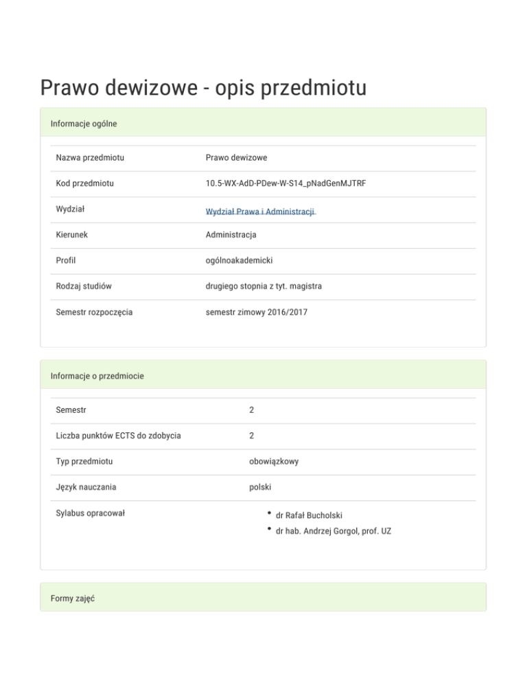 Prawo dewizowe - opis przedmiotu Informacje ogólne Nazwa przedmiotu Prawo dewizowe Kod przedmiotu 10.5-WX-AdD-PDew-W-S14_pNadGenMJTRF Wydział Wydział Prawa i Administracji Kierunek Administracja Profil ogólnoakademicki Rodzaj studiów drugiego stopnia z tyt. magistra Semestr rozpoczęcia semestr zimowy 2016/2017 Informacje o przedmiocie Semestr 2 Liczba punktów ECTS do zdobycia 2 Typ przedmiotu obowiązkowy Język nauczania polski Sylabus opracował dr Rafał Bucholski dr hab. Andrzej Gorgol, prof. UZ Formy zajęć Forma Liczba godzin w Liczba godzin w Liczba godzin w Liczba godzin w Forma zajęć semestrze tygodniu semestrze tygodniu zaliczenia (stacjonarne) (stacjonarne) (niestacjonarne) (niestacjonarne) 15 1 9 ,6 Wykład Zaliczenie na ocenę Cel przedmiotu Zapoznanie studentów z problematyką prawa dewizowego i jego uwarunkowań z uwzględnieniem praktyki jego stosowania. Wymagania wstępne Prawo konstytucyjne, prawo administracyjne. Zakres tematyczny 1. Ewolucja polskiego prawa dewizowego 2. Podstawowe i uzupełniające pojęcia prawa dewizowego 3. Funkcje prawa dewizowego 4. Zasady dokonywania obrotu dewizowego 5. Zwyczajne ograniczenia dewizowe 6. Nadzwyczajne ograniczenia dewizowe 7. Zezwolenia dewizowe 8. Działalność kantorowa 9. Obowiązki dewizowe 10. Kontrola dewizowa Metody kształcenia Wykład klasyczny. Efekty kształcenia i metody weryfikacji osiągania efektów kształcenia Opis efektu Symbole efektów Metody weryfikacji Charakteryzuje i rozróżnia poszczególne K_W09 egzamin - ustny, instytucje prawa dewizowego Potrafi K_W10 opisowy, testowy przedstawić w innej konwencji językowej Forma zajęć Wykład i inne podstawowe zasady prawa dewizowego Klasyfikuje i porządkuje poszczególne K_U02 egzamin - ustny, konstrukcje prawa dewizowego K_U05 opisowy, testowy K_U07 i inne Wykład K_U10 Wyraża obiektywne opinie co do społecznych i K_K04 egzamin - ustny, ekonomicznych zasad prawa dewizowego Jest K_K07 opisowy, testowy zorientowany na konieczność racjonalizacji prawa dewizowego Warunki zaliczenia Egzamin w formie opisowej – 5 pytań otwartych. Obciążenie pracą i inne Wykład Obciążenie pracą Studiastacjonarne Studia niestacjonarne (w godz.) (w godz.) Godziny kontaktowe (udział w zajęciach; konsultacjach; egzaminie, itp.) 25 20 Samodzielna praca studenta (przygotowanie do: zajęć, kolokwium, 25 30 Łącznie 50 50 Punkty ECTS Studia Studia niestacjonarne egzaminu; studiowanie literatury przygotowanie: pracy pisemnej, projektu, prezentacji, raportu, wystąpienia; itp.) stacjonarne Zajęcia z udziałem nauczyciela akademickiego 1 1 Zajęcia bez udziału nauczyciela akademickiego 1 1 Łącznie 2 2 Literatura podstawowa 1. W. Wójtowicz, A. Gorgol, Prawo dewizowe, Warszawa 2003 Literatura uzupełniająca 1. Z. Ofiarski, Prawo dewizowe, Zakamycza 2003 2. E. Fojcik – Mastalska, Prawo dewizowe Wrocław 2003 Uwagi Zmodyfikowane przez dr Maciej Kłodawski (ostatnia modyfikacja: 15-09-2016 00:47)