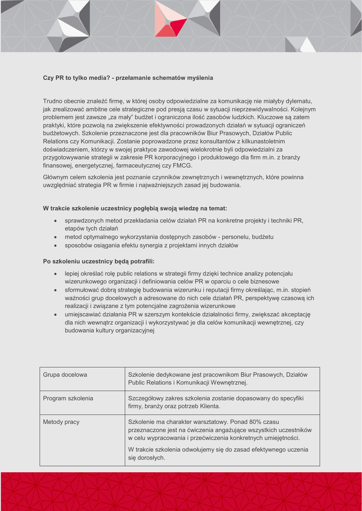 Czy PR to tylko media? - przełamanie schematów myślenia Trudno obecnie znaleźć firmę, w której osoby odpowiedzialne za komunikację nie miałyby dylematu, jak zrealizować ambitne cele strategiczne pod presją czasu w sytuacji nieprzewidywalności. Kolejnym problemem jest zawsze „za mały” budżet i ograniczona ilość zasobów ludzkich. Kluczowe są zatem praktyki, które pozwolą na zwiększenie efektywności prowadzonych działań w sytuacji ograniczeń budżetowych. Szkolenie przeznaczone jest dla pracowników Biur Prasowych, Działów Public Relations czy Komunikacji. Zostanie poprowadzone przez konsultantów z kilkunastoletnim doświadczeniem, którzy w swojej praktyce zawodowej wielokrotnie byli odpowiedzialni za przygotowywanie strategii w zakresie PR korporacyjnego i produktowego dla firm m.in. z branży finansowej, energetycznej, farmaceutycznej czy FMCG. Głównym celem szkolenia jest poznanie czynników zewnętrznych i wewnętrznych, które powinna uwzględniać strategia PR w firmie i najważniejszych zasad jej budowania. W trakcie szkolenie uczestnicy pogłębią swoją wiedzę na temat: sprawdzonych metod przekładania celów działań PR na konkretne projekty i techniki PR, etapów tych działań metod optymalnego wykorzystania dostępnych zasobów - personelu, budżetu sposobów osiągania efektu synergia z projektami innych działów Po szkoleniu uczestnicy będą potrafili: lepiej określać rolę public relations w strategii firmy dzięki technice analizy potencjału wizerunkowego organizacji i definiowania celów PR w oparciu o cele biznesowe sformułować dobrą strategię budowania wizerunku i reputacji firmy określając, m.in. stopień ważności grup docelowych a adresowane do nich cele działań PR, perspektywę czasową ich realizacji i związane z tym potencjalne zagrożenia wizerunkowe umiejscawiać działania PR w szerszym kontekście działalności firmy, zwiększać akceptację dla nich wewnątrz organizacji i wykorzystywać je dla celów komunikacji wewnętrznej, czy budowania kultury organizacyjnej Grupa docelowa Szkolenie dedykowane jest pracownikom Biur Prasowych, Działów Public Relations i Komunikacji Wewnętrznej. Program szkolenia Szczegółowy zakres szkolenia zostanie dopasowany do specyfiki firmy, branży oraz potrzeb Klienta. Metody pracy Szkolenie ma charakter warsztatowy. Ponad 80% czasu przeznaczone jest na ćwiczenia angażujące wszystkich uczestników w celu wypracowania i przećwiczenia konkretnych umiejętności. W trakcie szkolenia odwołujemy się do zasad efektywnego uczenia się dorosłych. Wykorzystane zostaną następujące metody pracy: burza mózgów, ćwiczenia indywidualne i grupowe, testy, gry symulacyjne, analizy case study, psychodrama. Charakter szkolenia Otwarte lub wewnętrzne realizowane w grupie od 4-16 osób lub według indywidualnych ustaleń. Czas trwania Od 2 do 6 dni. Każdy z modułów szkoleniowych trwa 90 minut. Szkolenie odbywa się w godzinach 9-17 lub w uzgodnionych indywidualnie z Klientem. Materiały szkoleniowe Materiały szkoleniowe są podsumowaniem i uzupełnieniem materiału omawianego w trakcie szkolenia. Uczestnicy otrzymują je w formie drukowanej. Miejsce realizacji szkolenia W siedzibie Klienta lub w miejscu przez niego wskazanym. Raport poszkoleniowy Po realizacji szkolenia przygotowywany jest raport zawierający podsumowanie szkolenia, najważniejsze wnioski, rekomendacje dotyczące działań na przyszłość. Wsparcie szkoleniowe W ciągu miesiąca po szkoleniu zapraszamy do kontaktu, zadawania pytań odnośnie zagadnień realizowanych na szkoleniu. Wyślij zapytanie, a przedstawimy Ci szkolenie dostosowane do specyfiki i potrzeb Twojej firmy! Zapraszamy do kontaktu, tel. 22/ 839 55 99 wew. 225 MCS sp. z o.o. sp. k., ul. Czerska 14, 00-732 Warszawa [email protected], www.mcs.edu.pl