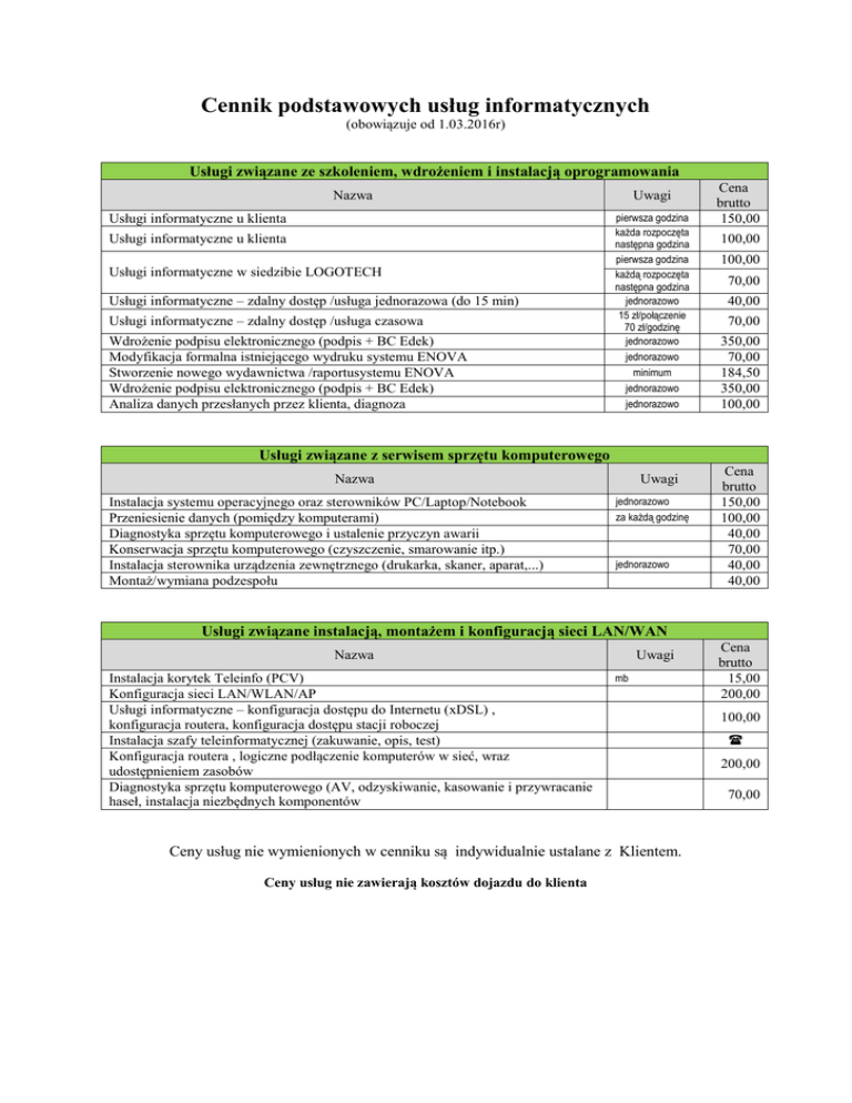 Cennik podstawowych usług informatycznych (obowiązuje od 1.03.2016r) Usługi związane ze szkoleniem, wdrożeniem i instalacją oprogramowania Nazwa Usługi informatyczne u klienta Usługi informatyczne u klienta Usługi informatyczne w siedzibie LOGOTECH Usługi informatyczne – zdalny dostęp /usługa jednorazowa (do 15 min) Usługi informatyczne – zdalny dostęp /usługa czasowa Wdrożenie podpisu elektronicznego (podpis + BC Edek) Modyfikacja formalna istniejącego wydruku systemu ENOVA Stworzenie nowego wydawnictwa /raportusystemu ENOVA Wdrożenie podpisu elektronicznego (podpis + BC Edek) Analiza danych przesłanych przez klienta, diagnoza Uwagi pierwsza godzina każda rozpoczęta następna godzina pierwsza godzina każdą rozpoczęta następna godzina jednorazowo 15 zł/połączenie 70 zł/godzinę jednorazowo jednorazowo minimum jednorazowo jednorazowo Cena brutto 150,00 100,00 100,00 70,00 40,00 70,00 350,00 70,00 184,50 350,00 100,00 Usługi związane z serwisem sprzętu komputerowego Nazwa Instalacja systemu operacyjnego oraz sterowników PC/Laptop/Notebook Przeniesienie danych (pomiędzy komputerami) Diagnostyka sprzętu komputerowego i ustalenie przyczyn awarii Konserwacja sprzętu komputerowego (czyszczenie, smarowanie itp.) Instalacja sterownika urządzenia zewnętrznego (drukarka, skaner, aparat,...) Montaż/wymiana podzespołu Uwagi jednorazowo za każdą godzinę jednorazowo Cena brutto 150,00 100,00 40,00 70,00 40,00 40,00 Usługi związane instalacją, montażem i konfiguracją sieci LAN/WAN Nazwa Instalacja korytek Teleinfo (PCV) Konfiguracja sieci LAN/WLAN/AP Usługi informatyczne – konfiguracja dostępu do Internetu (xDSL) , konfiguracja routera, konfiguracja dostępu stacji roboczej Instalacja szafy teleinformatycznej (zakuwanie, opis, test) Konfiguracja routera , logiczne podłączenie komputerów w sieć, wraz udostępnieniem zasobów Diagnostyka sprzętu komputerowego (AV, odzyskiwanie, kasowanie i przywracanie haseł, instalacja niezbędnych komponentów Uwagi mb Ceny usług nie wymienionych w cenniku są indywidualnie ustalane z Klientem. Ceny usług nie zawierają kosztów dojazdu do klienta Cena brutto 15,00 200,00 100,00 200,00 70,00