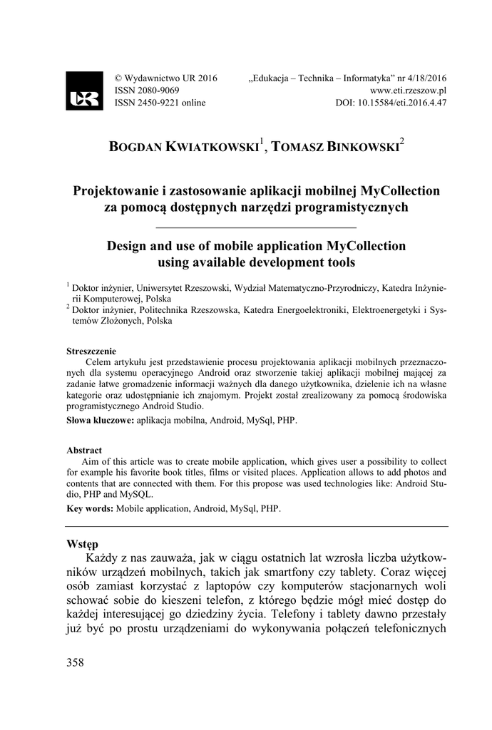 Celem artykułu jest przedstawienie procesu projektowania aplikacji mobilnych przeznaczonych dla systemu operacyjnego Android oraz stworzenie takiej aplikacji mobilnej mającej za