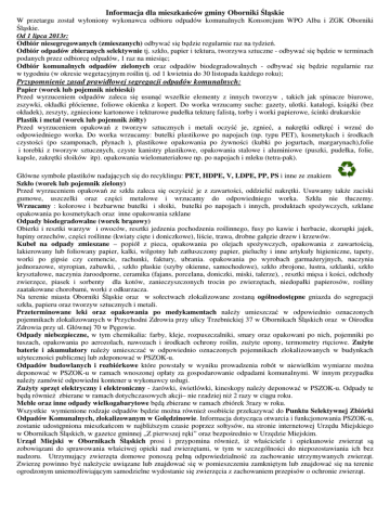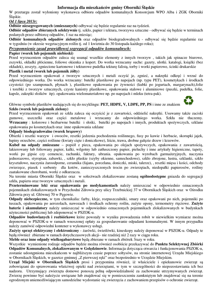 Informacja dla mieszkańców gminy Oborniki Śląskie W przetargu został wyłoniony wykonawca odbioru odpadów komunalnych Konsorcjum WPO Alba i ZGK Oborniki Śląskie. Od 1 lipca 2013r: Odbiór niesegregowanych (zmieszanych) odbywać się będzie regularnie raz na tydzień. Odbiór odpadów zbieranych selektywnie tj. szkło, papier i tektura, tworzywa sztuczne - odbywać się będzie w terminach podanych przez odbiorcę odpadów, 1 raz na miesiąc; Odbiór komunalnych odpadów zielonych oraz odpadów biodegradowalnych - odbywać się będzie regularnie raz w tygodniu (w okresie wegetacyjnym roślin tj. od 1 kwietnia do 30 listopada każdego roku); Przypomnienie zasad prawidłowej segregacji odpadów komunalnych: Papier (worek lub pojemnik niebieski) Przed wyrzuceniem odpadów zaleca się usunąć wszelkie elementy z innych tworzyw , takich jak spinacze biurowe, zszywki, okładki płócienne, foliowe okienka z kopert. Do worka wrzucamy suche: gazety, ulotki. katalogi, książki (bez okładek), zeszyty, zgniecione kartonowe i tekturowe pudełka tekturę falistą, torby i worki papierowe, ścinki drukarskie Plastik i metal (worek lub pojemnik żółty) Przed wyrzuceniem opakowań z tworzyw sztucznych i metali oczyść je, zgnieć, a nakrętki odkręć i wrzuć do odpowiedniego worka. Do worka wrzucamy: butelki plastikowe po napojach (np. typu PET), kosmetykach i środkach czystości (po szamponach, płynach ), plastikowe opakowania po żywności (kubki po jogurtach, margarynach),folie i torebki z tworzyw sztucznych, czyste kanistry plastikowe, opakowania stalowe i aluminiowe (puszki, pudełka, folie, kapsle, zakrętki słoików itp). opakowania wielomateriałowe np. po napojach i mleku (tetra-pak). Główne symbole plastików nadających się do recyklingu: PET, HDPE, V, LDPE, PP, PS i inne ze znakiem Szkło (worek lub pojemnik zielony) Przed wyrzuceniem opakowań ze szkła zaleca się oczyścić je z zawartości, oddzielić nakrętki. Usuwamy także zaciski gumowe, uszczelki oraz części metalowe i wrzucamy do odpowiedniego worka. Szkła nie tłuczemy. Wrzucamy : kolorowe i bezbarwne butelki i słoiki, butelki po napojach i innych, produktach spożywczych, szklane opakowania po kosmetykach oraz inne opakowania szklane Odpady biodegradowalne (worek brązowy) Obierki i resztki warzyw i owoców, resztki jedzenia pochodzenia roślinnego, fusy po kawie i herbacie, skorupki jajek, łupiny orzechów, części roślinne (kwiaty cięte i doniczkowe), liście, trawa, drobne gałęzie drzew i krzewów. Kubeł na odpady zmieszane – popiół z pieca, opakowania po olejach spożywczych, opakowania z zawartością, lakierowany lub foliowany papier, kalki, wilgotny lub zatłuszczony papier, pieluchy i inne artykuły higieniczne, tapety, worki po gipsie czy cemencie, rachunki, faktury, ubrania. opakowania po wyrobach garmażeryjnych, naczynia jednorazowe, styropian, zabawki, , szkło płaskie (szyby okienne, samochodowe), szkło zbrojone, lustra, szklanki, szkło kryształowe, naczynia żaroodporne, ceramika (fajans, porcelana, doniczki, miski, talerze), , resztki mięsa i kości, odchody zwierzęce, piasek i sorbenty dla kotów, zanieczyszczonych trocin po zwierzętach, niedopałki papierosów, rośliny zaatakowane chorobami, worki z odkurzacza. Na terenie miasta Oborniki Śląskie oraz w sołectwach zlokalizowane zostaną ogólnodostępne gniazda do segregacji szkła, papieru oraz tworzyw sztucznych i metali. Przeterminowane leki oraz opakowania po medykamentach należy umieszczać w odpowiednio oznaczonych pojemnikach zlokalizowanych w Przychodni Zdrowia przy ulicy Trzebnickiej 37 w Obornikach Śląskich oraz w Ośrodku Zdrowia przy ul. Głównej 70 w Pęgowie. Odpady niebezpieczne, w tym chemikalia: farby, kleje, rozpuszczalniki, smary oraz opakowani po nich, pojemniki po tuszach, opakowania po aerozolach, nawozach i środkach ochrony roślin, zużyte opony, termometry rtęciowe. Zużyte baterie i akumulatory należy umieszczać w odpowiednio oznaczonych pojemnikach zlokalizowanych w budynkach użyteczności publicznej lub zdeponować w PSZOK-u. Odpadów budowlanych i rozbiórkowe które powstały w wyniku prowadzenia robót w niewielkim wymiarze można deponować w PSZOK-u w ramach wnoszonej opłaty za gospodarowanie odpadami komunalnymi. W innym przypadku należy zamówić odpowiedni kontener u wykonawcy usługi. Zużyty sprzęt elektryczny i elektroniczny - żarówki, świetlówki, kineskopy należy deponować w PSZOK-u. Odpady te będą również zbierane w ramach dotychczasowych akcji– nie rzadziej niż 2 razy w ciągu roku. Meble oraz inne odpady wielkogabarytowe będą zbierane w ramach zbiórek 3razy w roku. Wszystkie wymienione rodzaje odpadów będzie można również osobiście przekazywać do Punktu Selektywnej Zbiórki Odpadów Komunalnych, zlokalizowanym w Golędzinowie. Informacja dotycząca otwarcia i funkcjonowania PSZOK-u, zostanie udostępniona mieszkańcom w najbliższym czasie poprzez sołtysów, na stronie internetowej Urzędu Miejskiego w Obornikach Śląskich, w gazetce gminnej „Z pierwszej ręki” oraz bezpośrednio w Urzędzie Miejskim. Urząd Miejski w Obornikach Śląskich prosi i przypomina również, iż właściciele i opiekunowie zwierząt są zobowiązani do sprawowania właściwej opieki nad zwierzętami, w tym w szczególności do niepozostawiania ich bez nadzoru. Utrzymujący zwierzęta domowe ponoszą pełną odpowiedzialność za zachowanie utrzymywanych zwierząt. Zwierzę powinno być należycie uwiązane lub znajdować się w pomieszczeniu zamkniętym lub znajdować się na terenie ogrodzonym uniemożliwiającym samodzielne wydostanie się zwierzęcia z zachowaniem przepisów o ochronie zwierząt.