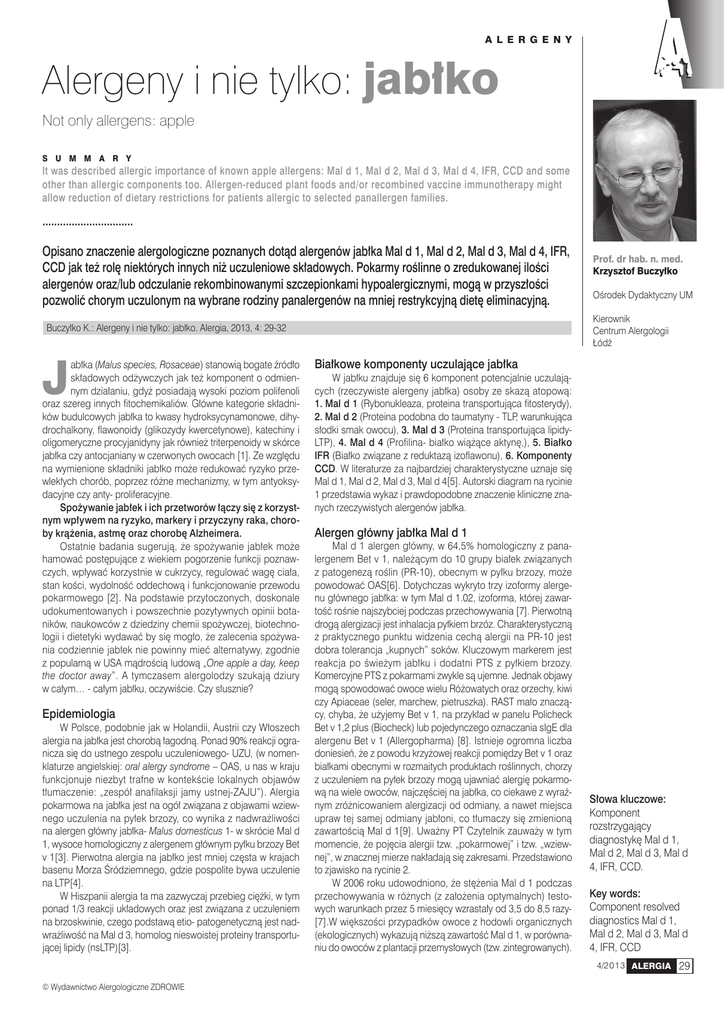 a l e r g e n y Alergeny i nie tylko: jabłko Not only allergens: apple S U M M ARY It was described allergic importance of known apple allergens: Mal d 1, Mal d 2, Mal d 3, Mal d 4, IFR, CCD and some other than allergic components too. Allergen-reduced plant foods and/or recombined vaccine immunotherapy might allow reduction of dietary restrictions for patients allergic to selected panallergen families. ............................... Opisano znaczenie alergologiczne poznanych dotąd alergenów jabłka Mal d 1, Mal d 2, Mal d 3, Mal d 4, IFR, CCD jak też rolę niektórych innych niż uczuleniowe składowych. Pokarmy roślinne o zredukowanej ilości alergenów oraz/lub odczulanie rekombinowanymi szczepionkami hypoalergicznymi, mogą w przyszłości pozwolić chorym uczulonym na wybrane rodziny panalergenów na mniej restrykcyjną dietę eliminacyjną. J Epidemiologia W Polsce, podobnie jak w Holandii, Austrii czy Włoszech alergia na jabłka jest chorobą łagodną. Ponad 90% reakcji ogranicza się do ustnego zespołu uczuleniowego- UZU, (w nomenklaturze angielskiej: oral alergy syndrome – OAS, u nas w kraju funkcjonuje niezbyt trafne w kontekście lokalnych objawów tłumaczenie: „zespół anafilaksji jamy ustnej-ZAJU”). Alergia pokarmowa na jabłka jest na ogół związana z objawami wziewnego uczulenia na pyłek brzozy, co wynika z nadwrażliwości na alergen główny jabłka- Malus domesticus 1- w skrócie Mal d 1, wysoce homologiczny z alergenem głównym pyłku brzozy Bet v 1[3]. Pierwotna alergia na jabłko jest mniej częsta w krajach basenu Morza Śródziemnego, gdzie pospolite bywa uczulenie na LTP[4]. W Hiszpanii alergia ta ma zazwyczaj przebieg ciężki, w tym ponad 1/3 reakcji układowych oraz jest związana z uczuleniem na brzoskwinie, czego podstawą etio- patogenetyczną jest nadwrażliwość na Mal d 3, homolog nieswoistej proteiny transportującej lipidy (nsLTP)[3]. Ośrodek Dydaktyczny UM Kierownik Centrum Alergologii Łódź Buczyłko K.: Alergeny i nie tylko: jabłko. Alergia, 2013, 4: 29-32 abłka (Malus species, Rosaceae) stanowią bogate źródło składowych odżywczych jak też komponent o odmiennym działaniu, gdyż posiadają wysoki poziom polifenoli oraz szereg innych fitochemikaliów. Główne kategorie składników budulcowych jabłka to kwasy hydroksycynamonowe, dihydrochalkony, flawonoidy (glikozydy kwercetynowe), katechiny i oligomeryczne procyjanidyny jak również triterpenoidy w skórce jabłka czy antocjaniany w czerwonych owocach [1]. Ze względu na wymienione składniki jabłko może redukować ryzyko przewlekłych chorób, poprzez różne mechanizmy, w tym antyoksydacyjne czy anty- proliferacyjne. Spożywanie jabłek i ich przetworów łączy się z korzystnym wpływem na ryzyko, markery i przyczyny raka, choroby krążenia, astmę oraz chorobę Alzheimera. Ostatnie badania sugerują, że spożywanie jabłek może hamować postępujące z wiekiem pogorzenie funkcji poznawczych, wpływać korzystnie w cukrzycy, regulować wagę ciała, stan kości, wydolność oddechową i funkcjonowanie przewodu pokarmowego [2]. Na podstawie przytoczonych, doskonale udokumentowanych i powszechnie pozytywnych opinii botaników, naukowców z dziedziny chemii spożywczej, biotechnologii i dietetyki wydawać by się mogło, że zalecenia spożywania codziennie jabłek nie powinny mieć alternatywy, zgodnie z popularną w USA mądrością ludową „One apple a day, keep the doctor away”. A tymczasem alergolodzy szukają dziury w całym… - całym jabłku, oczywiście. Czy słusznie? Prof. dr hab. n. med. Krzysztof Buczyłko Białkowe komponenty uczulające jabłka W jabłku znajduje się 6 komponent potencjalnie uczulających (rzeczywiste alergeny jabłka) osoby ze skazą atopową: 1. Mal d 1 (Rybonukleaza, proteina transportująca fitosterydy), 2. Mal d 2 (Proteina podobna do taumatyny - TLP, warunkująca słodki smak owocu), 3. Mal d 3 (Proteina transportująca lipidyLTP), 4. Mal d 4 (Profilina- białko wiążące aktynę,), 5. Białko IFR (Białko związane z reduktazą izoflawonu), 6. Komponenty CCD. W literaturze za najbardziej charakterystyczne uznaje się Mal d 1, Mal d 2, Mal d 3, Mal d 4[5]. Autorski diagram na rycinie 1 przedstawia wykaz i prawdopodobne znaczenie kliniczne znanych rzeczywistych alergenów jabłka. Alergen główny jabłka Mal d 1 Mal d 1 alergen główny, w 64,5% homologiczny z panalergenem Bet v 1, należącym do 10 grupy białek związanych z patogenezą roślin (PR-10), obecnym w pyłku brzozy, może powodować OAS[6]. Dotychczas wykryto trzy izoformy alergenu głównego jabłka: w tym Mal d 1.02, izoforma, której zawartość rośnie najszybciej podczas przechowywania [7]. Pierwotną drogą alergizacji jest inhalacja pyłkiem brzóz. Charakterystyczną z praktycznego punktu widzenia cechą alergii na PR-10 jest dobra tolerancja „kupnych” soków. Kluczowym markerem jest reakcja po świeżym jabłku i dodatni PTS z pyłkiem brzozy. Komercyjne PTS z pokarmami zwykle są ujemne. Jednak objawy mogą spowodować owoce wielu Różowatych oraz orzechy, kiwi czy Apiaceae (seler, marchew, pietruszka). RAST mało znaczący, chyba, że użyjemy Bet v 1, na przykład w panelu Policheck Bet v 1,2 plus (Biocheck) lub pojedynczego oznaczania sIgE dla alergenu Bet v 1 (Allergopharma) [8]. Istnieje ogromna liczba doniesień, że z powodu krzyżowej reakcji pomiędzy Bet v 1 oraz białkami obecnymi w rozmaitych produktach roślinnych, chorzy z uczuleniem na pyłek brzozy mogą ujawniać alergię pokarmową na wiele owoców, najczęściej na jabłka, co ciekawe z wyraźnym zróżnicowaniem alergizacji od odmiany, a nawet miejsca upraw tej samej odmiany jabłoni, co tłumaczy się zmienioną zawartością Mal d 1[9]. Uważny PT Czytelnik zauważy w tym momencie, że pojęcia alergii tzw. „pokarmowej” i tzw. „wziewnej”, w znacznej mierze nakładają się zakresami. Przedstawiono to zjawisko na rycinie 2. W 2006 roku udowodniono, że stę