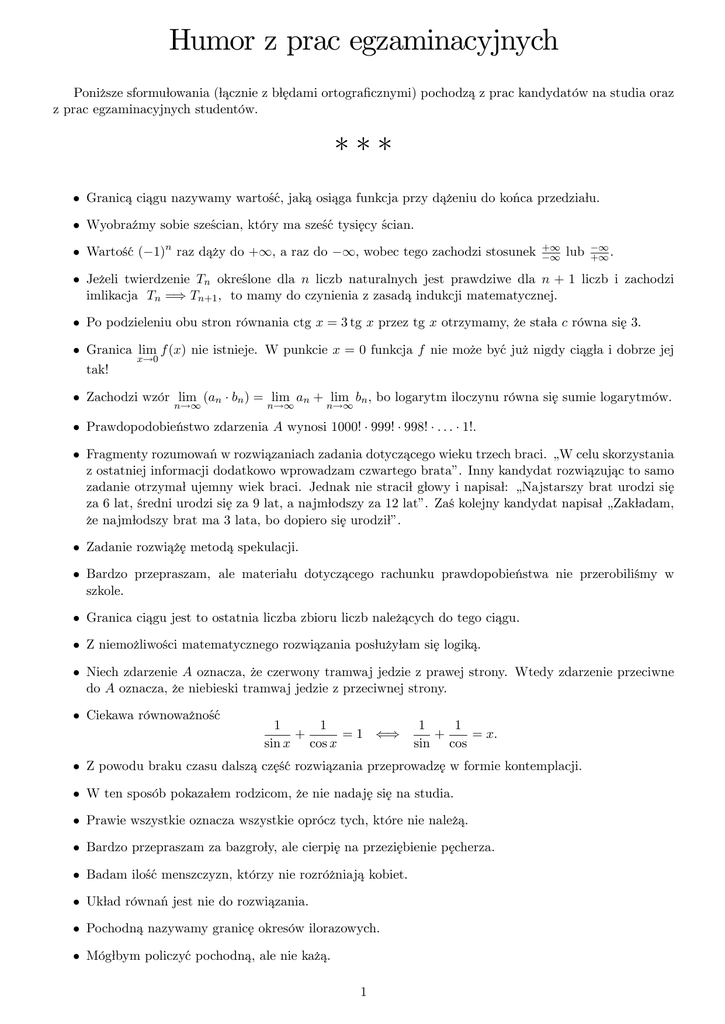 Humor z prac egzaminacyjnych Poniz·sze sformu÷ owania (÷ acznie ¾ z b÷edami ¾ ortogra…cznymi) pochodza¾ z prac kandydatów na studia oraz z prac egzaminacyjnych studentów. Granica¾ ciagu ¾ nazywamy wartość, jaka¾ osiaga ¾ funkcja przy da¾z·eniu do końca przedzia÷u. Wyobraźmy sobie sześcian, który ma sześć tysiecy ¾ ścian. Wartość ( 1)n raz da¾z·y do +1; a raz do 1; wobec tego zachodzi stosunek +1 1 lub 1 +1 : Jez·eli twierdzenie Tn określone dla n liczb naturalnych jest prawdziwe dla n + 1 liczb i zachodzi imlikacja Tn =) Tn+1 ; to mamy do czynienia z zasada¾ indukcji matematycznej. Po podzieleniu obu stron równania ctg x = 3 tg x przez tg x otrzymamy, z·e sta÷a c równa sie¾ 3: Granica lim f (x) nie istnieje. W punkcie x = 0 funkcja f nie moz·e być juz· nigdy ciag÷ ¾ a i dobrze jej x!0 tak! Zachodzi wzór lim (an bn ) = lim an + lim bn ; bo logarytm iloczynu równa sie¾ sumie logarytmów. n!1 n!1 n!1 Prawdopodobieństwo zdarzenia A wynosi 1000! 999! 998! : : : 1!: Fragmenty rozumowań w rozwiazaniach ¾ zadania dotyczacego ¾ wieku trzech braci. „W celu skorzystania z ostatniej informacji dodatkowo wprowadzam czwartego brata”. Inny kandydat rozwiazuj ¾ ac ¾ to samo zadanie otrzyma÷ujemny wiek braci. Jednak nie straci÷g÷owy i napisa÷: „Najstarszy brat urodzi sie¾ za 6 lat, średni urodzi sie¾ za 9 lat, a najm÷odszy za 12 lat”. Zaś kolejny kandydat napisa÷„Zak÷ adam, z·e najm÷odszy brat ma 3 lata, bo dopiero sie¾ urodzi÷ ”. Zadanie rozwia¾z·e¾ metoda¾ spekulacji. Bardzo przepraszam, ale materia÷u dotyczacego ¾ rachunku prawdopobieństwa nie przerobiliśmy w szkole. Granica ciagu ¾ jest to ostatnia liczba zbioru liczb nalez·acych ¾ do tego ciagu. ¾ Z niemoz·liwości matematycznego rozwiazania ¾ pos÷uz·y÷am sie¾ logika. ¾ Niech zdarzenie A oznacza, z·e czerwony tramwaj jedzie z prawej strony. Wtedy zdarzenie przeciwne do A oznacza, z·e niebieski tramwaj jedzie z przeciwnej strony. Ciekawa równowaz·ność 1 1 + = 1 () sin x cos x 1 1 + = x: sin cos Z powodu braku czasu dalsza¾ cześć ¾ rozwiazania ¾ przeprowadze¾ w formie kontemplacji. W ten sposób pokaza÷em rodzicom, z·e nie nadaje¾ sie¾ na studia. Prawie wszystkie oznacza wszystkie oprócz tych, które nie nalez·a. ¾ Bardzo przepraszam za bazgro÷y, ale cierpie¾ na przeziebienie ¾ pecherza. ¾ Badam ilość menszczyzn, którzy nie rozróz·niaja¾ kobiet. Uk÷ad równań jest nie do rozwiazania. ¾ Pochodna¾ nazywamy granice¾ okresów ilorazowych. Móg÷bym policzyć pochodna, ¾ ale nie kaz·a. ¾ 1 Bez linijki i gumki nie potra…¾ e narysować wykresu tej funkcji. Doszed÷em do wniosku, z·e jednak posiadam zbyt ma÷ o wiadomości i z tego wzgledu ¾ postanowi÷ em zrezygnować z dalszych egzaminów. Dziekuj ¾ e¾ Rektorowi Politechniki Wroc÷awskiej za danie mi szansy spróbowania na egzaminie swoich si÷, których to niestety nie mia÷ em wiele. Dziekuj ¾ e! ¾ Do zobaczenia! Ekskandydat ×ukasik W trójkacie ¾ jeden kat ¾ ma 1350 ; drugi ma takz·e 1350 ; a trzeci ma 900 : Poniewaz· suma katów ¾ w tym trójkacie ¾ równa sie¾ 3600 ; wiec ¾ taki trójkat ¾ nie istnieje. p Go÷ym okiem widać, z·e funkcja 2x 1 jest ściśle rosnaca. ¾ Istnieje takie twierdzenie, niepotrzebne w zadaniu, które brzmi ... . Funkcja f jest monotoniczna w przedziale (a; b); gdy wszystkie punkty z tego przedzia÷u daja¾ sie¾ po÷ aczyć ¾ prosta¾ lub krzywa. ¾ ×atwy sposób rozwiazania ¾ nierówności trygonometryczej: tg x < 1 () x < 4 + k ; gdzie k 2 Z: Poniewaz· nierówność wyk÷adniczna jest róz·niczkowalna, wiec ¾ moz·emy opuścić podstawy. Zachodzi tutaj zjawisko indukcji matematycznej. Proste l1 i l2 sa¾ prostopad÷e, gdy sa¾ w stosunku. Sam sie¾ dziwie¾ jak zda÷em mature. ¾ Zak÷ adamy, z·e nierówność jest prawdziwa dla dowolnej liczby naturalnej n: Pokaz·emy, z·e jest ona prawdziwa takz·e dla liczby n + 1: Zadanie jest tak proste, z·e nie ma co rozwiazywać. ¾ Moja prosta ma wyglad ¾ ... Podam de…nicje¾ ciag÷ ¾ ości funkcji wg „Dróbki". Zak÷ adam, z·e twierdzenie jest prawdziwe dla kaz·dego n = 1: Zagrzeba÷em sie, ¾ mam ma÷o czasu. Prosze¾ znaleźć b÷ad ¾ i ocenić. Iloraz róz·nicowy jest to wartość predkości ¾ chwilowej. Oczywiście w praktyce wybiera sie¾ duz·o mniejsze " niz· na rysunku. Oryginalna metoda obliczania pochodnej (arc tg x)0 = 1 1 1 (tg x)0 = : 1 + x2 1 + x2 cos2 x Inne ciekawe sposoby róz·niczkowania: e7 0 = e7 ; (ln 44)0 = 2 1 ; 44 5 0 =5 4 :