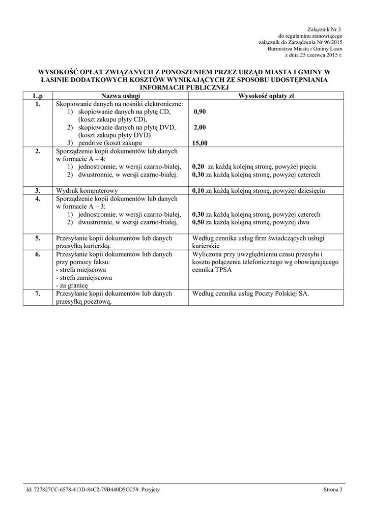 Załącznik Nr 3 do regulaminu stanowiącego załącznik do Zarządzenia Nr 96/2015 Burmistrza Miasta i Gminy Łasin z dnia 25 czerwca 2015 r. WYSOKOŚĆ OPŁAT ZWIĄZANYCH Z PONOSZENIEM PRZEZ URZĄD MIASTA I GMINY W ŁASINIE DODATKOWYCH KOSZTÓW WYNIKAJĄCYCH ZE SPOSOBU UDOSTĘPNIANIA INFORMACJI PUBLICZNEJ L.p Nazwa usługi Wysokość opłaty zł Skopiowanie danych na nośniki elektroniczne: 1. 1) skopiowanie danych na płytę CD, 0,90 (koszt zakupu płyty CD), 2) skopiowanie danych na płytę DVD, 2,00 (koszt zakupu płyty DVD) 3) pendrive (koszt zakupu 15,00 Sporządzenie kopii dokumentów lub danych 2. w formacie A – 4: 1) jednostronnie, w wersji czarno-białej, 0,20 za każdą kolejną stronę, powyżej pięciu 2) dwustronnie, w wersji czarno-białej. 0,30 za każdą kolejną stronę, powyżej czterech 3. 4. 5. 6. 7. Wydruk komputerowy Sporządzenie kopii dokumentów lub danych w formacie A – 3: 1) jednostronnie, w wersji czarno-białej, 2) dwustronnie, w wersji czarno-białej, 0,10 za każdą kolejną stronę, powyżej dziesięciu Przesyłanie kopii dokumentów lub danych przesyłką kurierską. Przesyłanie kopii dokumentów lub danych przy pomocy faksu: - strefa miejscowa - strefa zamiejscowa - za granicę Przesyłanie kopii dokumentów lub danych przesyłką pocztową. Według cennika usług firm świadczących usługi kurierskie Wyliczona przy uwzględnieniu czasu przesyłu i kosztu połączenia telefonicznego wg obowiązującego cennika TPSA Id: 727827CC-6578-413D-84C2-79B440D5CC59. Przyjety 0,30 za każdą kolejną stronę, powyżej czterech 0,50 za każdą kolejną stronę, powyżej dwu Według cennika usług Poczty Polskiej SA. Strona 3