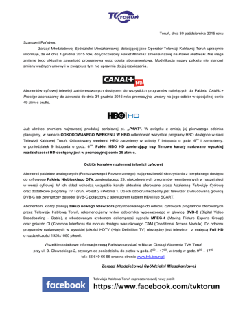 Toruń, dnia 30 października 2015 roku Szanowni Państwo, Zarząd Młodzieżowej Spółdzielni Mieszkaniowej, działającej jako Operator Telewizji Kablowej Toruń uprzejmie informuje, że od dnia 1 grudnia 2015 roku dotychczasowy Pakiet Minimax zmienia nazwę na Pakiet Niebieski. Nie ulega zmianie jego aktualna zawartość programowa oraz opłata abonamentowa. Modyfikacja nazwy pakietu nie stanowi zmiany ważnych umowy i w związku z tym nie uprawnia do jej rozwiązania. Abonentów cyfrowej telewizji zainteresowanych dostępem do wszystkich programów należących do Pakietu CANAL+ Prestige zapraszamy do zawarcia do dnia 31 grudnia 2015 roku promocyjnej umowy na jego odbiór w specjalnej cenie 49 zł/m-c brutto. Już wkrótce premiera najnowszej produkcji serialowej pt. „PAKT”. W związku z emisją jej pierwszego odcinka planujemy, w ramach ODKODOWANEGO WEEKENU W HBO odkodować wszystkie programy HBO dostępne w sieci Telewizji Kablowej Toruń. Odkodowany weekend HBO zaczniemy w sobotę 7 listopada o godz. 6⁰⁰ i zamkniemy, w poniedziałek 9 listopada o godz. 6⁰⁰. Pakiet HBO HD zawierający trzy filmowe kanały nadawane wysokiej rozdzielczości HD dostępny jest w promocyjnej cenie 25 zł/m-c. Odbiór kanałów naziemnej telewizji cyfrowej Abonenci pakietów analogowych (Podstawowego i Rozszerzonego) mają możliwość skorzystania z bezpłatnego dostępu do cyfrowego Pakietu Niebieskiego DTV, zawierającego 29. niekodowanych programów reemitowanych w naszej sieci w wersji cyfrowej. W ich skład wchodzą wszystkie kanały aktualnie oferowane przez Naziemną Telewizję Cyfrową oraz dodatkowo programy TV Toruń, Polsat 2 i Polonia 1. Do ich odbioru niezbędny jest telewizor z wbudowaną głowicą DVB-C lub zewnętrzny dekoder DVB-C połączony z telewizorem kablem HDMI lub SCART. Abonentom, którzy planują zakup nowego telewizora przystosowanego do odbioru cyfrowych programów oferowanych przez Telewizję Kablową Toruń, rekomendujemy wybór odbiornika wyposażonego w głowicę DVB-C (Digital Video Broadcasting - Cable), z wbudowanym systemem dekompresji sygnału MPEG-4 (Moving Picture Experts Group) oraz gniazdo CI (Common Interface) dla modułu dostępu warunkowego CAM (Conditional Access Module). Do odbioru programów nadawanych w wysokiej jakości HDTV (High Definition TV) niezbędny jest telewizor z matrycą Full HD o rozdzielczości 1920x1080 pikseli. Wszelkie dodatkowe informacje mogą Państwo uzyskać w Biurze Obsługi Abonenta TVK Toruń przy ul. B. Głowackiego 2, czynnym od poniedziałku do piątku w godz. 8⁰⁰ – 17⁰⁰, w środę w godz. 9⁰⁰ – 17⁰⁰ tel.: 56 649 66 66 oraz na stronie www.tvk.torun.pl. Zarząd Młodzieżowej Spółdzielni Mieszkaniowej Telewizja Kablowa Toruń zaprasza na swój nowy profil: https://www.facebook.com/tvktorun