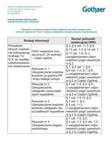 Gothaer Towarzystwo Ubezpieczeń S.A. ul. Wołoska 22A, 02-675 Warszawa tel. 22 469 69 69 www.gothaer.pl OGÓLNE WARUNKI UBEZPIECZENIA wyjazdów turystycznych „W podróży” Informacja o istotnych postanowieniach ogólnych warunków ubezpieczenia, o których mowa w art. 17 ust. 1 ustawy o działalności ubezpieczeniowej i reasekuracyjnej Rodzaj informacji Przesłanki, których zaistnienie zobowiązuje OWU wyjazdów turystycznych „W podróży” Gothaer TU S.A. do wypłaty – część ogólna odszkodowania lub świadczenia Klauzula nr 1 Ubezpieczenie kosztów leczenia za granicą RP i kraju stałego pobytu Klauzula nr 2 Ubezpieczenie następstw nieszczęśliwych wypadków Klauzula nr 3 Ubezpieczenie kosztów leczenia następstw nieszczęśliwych wypadków Klauzula nr 4 Ubezpieczenie bagażu podróżnego Numer jednostki redakcyjnej OWU § 3, § 4 ust. 1 i 3, § 9, § 13 ust. 1-3, § 14 ust. 1, § 17 ust. 1-4 i 9, z uwzględnieniem odpowiednich pojęć zawartych w§2 § 1, § 2 ust. 1, § 4, § 6 ust. 1-3, § 7, § 8, z uwzględnieniem odpowiednich pojęć zawartych w § 2 w Części Ogólnej § 1 ust. 1-4, § 4, § 5, z uwzględnieniem odpowiednich pojęć zawartych w § 2 w Części Ogólnej § 1 ust. 1-3 i 5, § 2, § 3 ust. 1, § 4, § 5 ust. 1 i 2, z uwzględnieniem odpowiednich pojęć zawartych w § 2 w Części Ogólnej § 1 ust. 1-5, § 2, § 3 ust. 1-3, § 4 ust. 1-3, z uwzględnieniem odpowiednich pojęć zawartych w § 2 w Części Ogólnej § 1 ust. 1-4, § 2 ust. 1 oraz 4 i 5, z uwzględnieniem odpowiednich pojęć zawartych w § 2 w Części Ogólnej § 1 ust. 1 i 2, Klauzula nr 6 § 2 ust. 2 i 3, z uwzględUbezpieczenie assinieniem odpowiednich stance pojęć zawartych w § 2 w Części Ogólnej § 1 ust. 1-5, § 2 ust. 2 i 3, Klauzula nr 7 § 3 ust. 1 i 2, § 4 ust. 1-3, Ubezpieczenie sprzętu z uwzględnieniem odposportowego wiednich pojęć zawartych w § 2 w Części Ogólnej § 1 ust. 1 i 2, § 3 ust. 1, Klauzula nr 8 3 i 4, § 4, § 5, z uwzględUbezpieczenie kosztów nieniem odpowiednich poszukiwań i ratownicpojęć zawartych w § 2 twa w Części Ogólnej Klauzula nr 5 Ubezpieczenie odpowiedzialności cywilnej w życiu prywatnym Ograniczenia oraz wyłączenia odpowiedzialności Gothaer TU S.A. uprawnia- OWU wyjazdów turyjące do odmowy stycznych „W podróży” wypłaty – część ogólna odszkodowania i innych świadczeń lub ich obniżenia § 3 ust. 5, § 5, § 9 ust. 1-5, § 13 ust. 4, § 15, z uwzględnieniem odpowiednich pojęć zawartych w§2 § 1 ust. 2 i 4, § 2, § 3, § 4 Klauzula nr 1 ust. 1-3, § 5 ust. 2, 3 i 5, Ubezpieczenie kosztów z uwzględnieniem odpoleczenia za granicą RP i wiednich pojęć zawartych kraju stałego pobytu w § 2 w Części Ogólnej § 1 ust. 4-6, § 2, Klauzula nr 2 § 3 ust. 2, § 5 ust. 8 i 10, Ubezpieczenie z uwzględnieniem odponastępstw nieszczęśliwiednich pojęć zawartych wych wypadków w § 2 w Części Ogólnej § 1 ust. 3 i 5, Klauzula nr 3 § 3 ust. 2 i 3, § 5 ust. 3, Ubezpieczenie kosztów z uwzględnieniem odpoleczenia następstw niewiednich pojęć zawartych szczęśliwych wypadków w § 2 w Części Ogólnej § 1 ust. 6, § 2 ust. 2-4, Klauzula nr 4 § 4 ust. 3-5, z uwzględUbezpieczenie bagażu nieniem odpowiednich podróżnego pojęć zawartych w § 2 w Części Ogólnej Klauzula nr 5 § 1 ust. 5-7, § 2 ust. 2-4, Ubezpieczenie odpoz uwzględnieniem odpowiedzialności cywilnej w wiednich pojęć zawartych życiu prywatnym w § 2 w Części Ogólnej § 1 ust. 2 i 3, § 2 ust. 2-3, Klauzula nr 6 z uwzględnieniem odpoUbezpieczenie assiwiednich pojęć zawartych stance w § 2 w Części Ogólnej § 1 ust. 6, § 2 ust. 2-3, Klauzula nr 7 § 4 ust. 4 i 5, z uwzględUbezpieczenie sprzętu nieniem odpowiednich sportowego pojęć zawartych w § 2 w Części Ogólnej § 1 ust. 2 i 3, § 2, Klauzula nr 8 § 3 ust. 4, z uwzględnieUbezpieczenie kosztów niem odpowiednich pojęć poszukiwań i ratowniczawartych w § 2 twa w Części Ogólnej Spis treści I.POSTANOWIENIA OGÓLNE I DEFINICJE § 1Postanowienia ogólne § 2 Jak należy rozumieć pojęcia użyte w OWU Strona 6 6 6 II. KONSTRUKCJA UBEZPIECZENIA, PRZEDMIOT I ZAKRES ORAZ WYŁĄCZENIA ODPOWIEDZIALNOŚCI GOTHAER § 3 Jaki jest przedmiot i zakres ubezpieczenia § 4 Jakie są warianty ubezpieczenia § 5 Jakie są ogólne wyłączenia odpowiedzialności Gothaer TU S.A. 9 9 9 11 III. UMOWA UBEZPIECZENIA § 6 Jak zawrzeć umowę ubezpieczenia § 7 Kiedy i z jakich powodów umowa ubezpieczenia wygasa § 8Czy można zawrzeć umowę ubezpieczenia na rzecz innej osoby (cudzy rachunek) § 9 Kiedy rozpoczyna się i kończy odpowiedzialność Gothaer TU S.A. 11 11 12 13 13 IV.SKŁADKA UBEZPIECZENIOWA § 10 Jakie są zasady opłacania składki i od czego zależy jej wysokość § 11 Kiedy przysługuje zwrot składki 14 15 V.PRAWA I OBOWIĄZKI STRON UMOWY § 12 Jakie są obowiązki Gothaer TU S.A. wynikające z umowy ubezpieczenia § 13 Jakie są ogólne obowiązki Ubezpieczającego i Ubezpieczonego wynikające z umowy ubezpieczenia § 14 Jakie są ogólne obowiązki Ubezpieczonego po powstaniu szkody § 15Czym skutkuje naruszenie obowiązków przez Ubezpieczającego lub Ubezpieczonego § 16 Kiedy Gothaer TU S.A. ma obowiązek udostępnić dokumenty 15 15 16 16 VI. USTALENIE I WYPŁATA ŚWIADCZENIA LUB ODSZKODOWANIA § 17 Na jakiej podstawie i kiedy wypłacane jest świadczenie lub odszkodowanie 16 VII.POSTANOWIENIA KOŃCOWE § 18 Jak należy złożyć reklamację § 19 Kiedy Gothaer TU S.A. przysługują roszczenia regresowe § 20 Jak należy składać zawiadomienia i oświadczenia stron § 21Przetwarzanie danych osobowych § 22Od kiedy obowiązują ogólne warunki ubezpieczenia 17 17 17 17 18 KLAUZULE 15 Strona Klauzula nr 1 UBEZPIECZENIE KOSZTÓW LECZENIA ZA GRANICĄ RP I KRAJU STAŁEGO POBYTU § 1 Jaki jest przedmiot i zakres ubezpieczenia § 2Co obejmują koszty leczenia § 3 Jakie są dodatkowe wyłączenia odpowiedzialności Gothaer TU S.A. § 4 Kiedy rozpocz