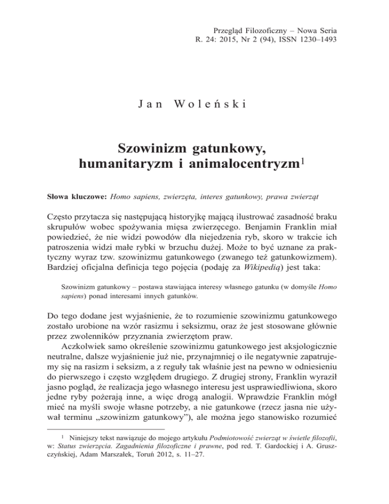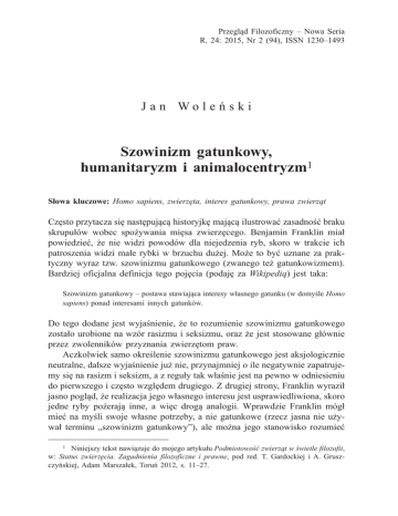 Przegląd Filozoficzny – Nowa Seria R. 24: 2015, Nr 2 (94), ISSN 1230–1493 J a n Wo l e ń s k i Szowinizm gatunkowy, humanitaryzm i animalocentryzm1 Słowa kluczowe: Homo sapiens, zwierzęta, interes gatunkowy, prawa zwierząt Często przytacza się następującą historyjkę mającą ilustrować zasadność braku skrupułów wobec spożywania mięsa zwierzęcego. Benjamin Franklin miał powiedzieć, że nie widzi powodów dla niejedzenia ryb, skoro w trakcie ich patroszenia widzi małe rybki w brzuchu dużej. Może to być uznane za praktyczny wyraz tzw. szowinizmu gatunkowego (zwanego też gatunkowizmem). Bardziej oficjalna definicja tego pojęcia (podaję za Wikipedią) jest taka: Szowinizm gatunkowy – postawa stawiająca interesy własnego gatunku (w domyśle Homo sapiens) ponad interesami innych gatunków. Do tego dodane jest wyjaśnienie, że to rozumienie szowinizmu gatunkowego zostało urobione na wzór rasizmu i seksizmu, oraz że jest stosowane głównie przez zwolenników przyznania zwierzętom praw. Aczkolwiek samo określenie szowinizmu gatunkowego jest aksjologicznie neutralne, dalsze wyjaśnienie już nie, przynajmniej o ile negatywnie zapatrujemy się na rasizm i seksizm, a z reguły tak właśnie jest na pewno w odniesieniu do pierwszego i często względem drugiego. Z drugiej strony, Franklin wyraził jasno pogląd, że realizacja jego własnego interesu jest usprawiedliwiona, skoro jedne ryby pożerają inne, a więc drogą analogii. Wprawdzie Franklin mógł mieć na myśli swoje własne potrzeby, a nie gatunkowe (rzecz jasna nie używał terminu „szowinizm gatunkowy”), ale można jego stanowisko rozumieć Niniejszy tekst nawiązuje do mojego artykułu Podmiotowość zwierząt w świetle filozofii, w: Status zwierzęcia. Zagadnienia filozoficzne i prawne, pod red. T. Gardockiej i A. Gruszczyńskiej, Adam Marszałek, Toruń 2012, s. 11–27. 1 26 Jan Woleński jako ocenę dokonaną z punktu widzenia Homo sapiens. Nie ma apriorycznego powodu, aby identyfikować nazwy „szowinizm gatunkowy” i „obrona interesu gatunkowego”. Jednak na pewno trzeba starać się o to, aby możliwie (ponieważ trudno całkowicie) zneutralizować wartościowania, przynajmniej w punkcie wyjścia. Dyskusja nad szowinizmem gatunkowym wymaga podjęcia wielu problemów, w szczególności następujących: (a) Czy szowinizm gatunkowy dotyczy tylko gatunku ludzkiego? (b) Czy szowinizm gatunkowy może być nieświadomy (np. instynktowny), czy musi być świadomy? (c) Czy szowinizm gatunkowy zakłada samoświadomość? (d) Czy szowinizm gatunkowy uprawnia do eliminacji osobników innych gatunków, przy czym, ujmując rzecz ogólniej i od razu z ludzkiej perspektywy, czy usprawiedliwia wykorzystywanie przedstawicieli innych gatunków do np. eksperymentów medycznych, polowania dla przyjemności, ograniczania wolności zwierząt dla potrzeb edukacyjnych i rozrywkowych, hodowli dla pozyskiwania materiału na stroje czy produkcji kosmetyków? (e) Czy jeden gatunek może (ma prawo) działać na rzecz interesu innych gatunków, np. przez ich ochronę przed wymarciem?2 Powyższe pytania są nierozłączne, np. odpowiedź na (b) określa już pewną ramę dla pytania (c) i na odwrót. Pytania (a) – (c) są tak postawione, że nie zakładają równoważności denominacji „szowinizm gatunkowy” i „interes gatunkowy”. Skoro szowinizm jest postawą, to niejako automatycznie zakłada się, że jest to postawa uświadomiona, natomiast interesy nie wymagają tej presupozycji. Z tego wynika pozytywna odpowiedź na pytania (a) i (b) oraz wykluczenie szowinizmu nieświadomego, nawet przez wskazanie, że jest to pojęcie obciążone wadą contradictio in adiecto. Dalej możemy odpowiedzieć tak lub nie na pytanie (d), ale podstawienie interesu gatunkowego za szowinizm w tej kwestii zmienia sytuację. Na pewno zdarza się, i to notorycznie, że jedne zwierzęta eliminują inne dla zaspokojenia swych potrzeb żywieniowych (w przypadku Homo sapiens także innych), ale kwestia uprawnienia może mieć sens tylko wobec gatunku(ów) zdolnych do działania w oparciu o żywione postawy mentalne. Inaczej mówiąc, źródłem stosownego uprawnienia lub jego zanegowania jest, w rozważanym wypadku, uświadomienie sobie tego, co wolno, a co nie. Jeśli tak, to działania, nazwijmy je naturalnymi bez samoświadomości, po prostu zdarzają się, są pewną regularnością, ale nie przechodzą w uprawnione zacho2 Nie sugeruję, że nie są podejmowane. Ponieważ traktuję niniejszy artykuł jako przyczynek do dyskusji, pozwalam sobie pominąć cały aparat erudycyjny. Szowinizm gatunkowy, humanitaryzm i animalocentryzm 27 wania się. Innymi słowy, to, co jest (zdarza się), nie implikuje uprawnienia do tego, co jest (zdarza się), tj. nie ma przejścia od tego, że A, do tego, że wolno, że A (A jest przedmiotem uprawnienia). Jest to wersja gilotyny Hume’a w odniesieniu do zdań wyrażających uprawnienie (oryginalnie prawidło to było sformułowane dla zdań powinnościowych). Podobnie, ludzie chronią pewne gatunki dla celów edukacyjnych i muzealnych. Można przyjąć, że jest to wyraz szowinizmu gatunkowego, powiedzmy „miłosiernego”. To, że tak czynimy, nie implikuje, że powinniśmy to robić, lub że jesteśmy do tego uprawnieni. Być może trzeba rzecz pozostawić naturalnemu biegowi rzeczy, a nie naszym decyzjom. Miłosierdzie w realizacji szowinizmu gatunkowego jest zresztą dość selektywne, gdyż chronimy jedne gatunki, a innych nie. Kierujemy się przy tym rozmaitymi kryteriami, niekoniecznie sprawiedliwymi. Jeśli przyjmie się antropocentryczny punkt widzenia, rozwiązanie problemów zaznaczonych w punktach (a) – (c) może być uznane za proste. Wedle zasady Homo mensura, my jesteśmy miarą wszechrzeczy i decydujemy, jak jest i jak być powinno, także w materii granic szowinizmu gatunkowego. Wszak powiedziano: „Czyńcie sobie ziemię poddaną”. I czynimy, m.in. przez podporzą