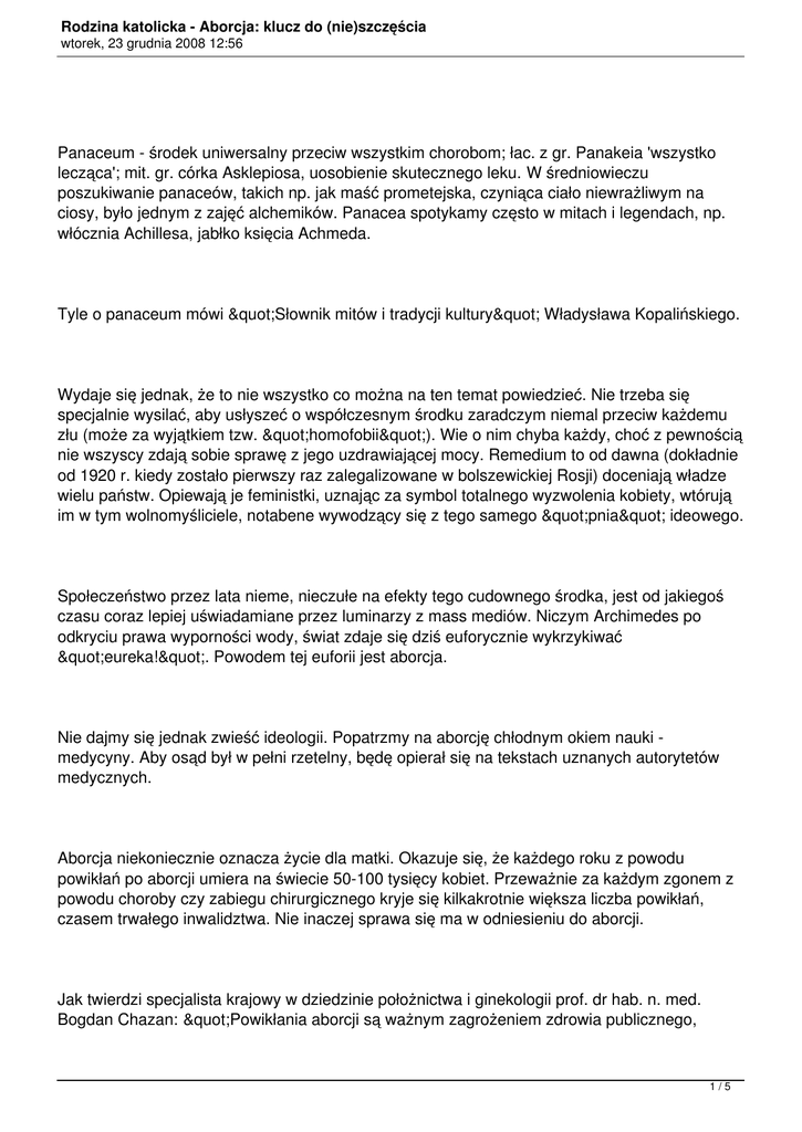 Rodzina katolicka - Aborcja: klucz do (nie)szczęścia wtorek, 23 grudnia 2008 12:56 Panaceum - środek uniwersalny przeciw wszystkim chorobom; łac. z gr. Panakeia 'wszystko lecząca'; mit. gr. córka Asklepiosa, uosobienie skutecznego leku. W średniowieczu poszukiwanie panaceów, takich np. jak maść prometejska, czyniąca ciało niewrażliwym na ciosy, było jednym z zajęć alchemików. Panacea spotykamy często w mitach i legendach, np. włócznia Achillesa, jabłko księcia Achmeda. Tyle o panaceum mówi "Słownik mitów i tradycji kultury" Władysława Kopalińskiego. Wydaje się jednak, że to nie wszystko co można na ten temat powiedzieć. Nie trzeba się specjalnie wysilać, aby usłyszeć o współczesnym środku zaradczym niemal przeciw każdemu złu (może za wyjątkiem tzw. "homofobii"). Wie o nim chyba każdy, choć z pewnością nie wszyscy zdają sobie sprawę z jego uzdrawiającej mocy. Remedium to od dawna (dokładnie od 1920 r. kiedy zostało pierwszy raz zalegalizowane w bolszewickiej Rosji) doceniają władze wielu państw. Opiewają je feministki, uznając za symbol totalnego wyzwolenia kobiety, wtórują im w tym wolnomyśliciele, notabene wywodzący się z tego samego "pnia" ideowego. Społeczeństwo przez lata nieme, nieczułe na efekty tego cudownego środka, jest od jakiegoś czasu coraz lepiej uświadamiane przez luminarzy z mass mediów. Niczym Archimedes po odkryciu prawa wyporności wody, świat zdaje się dziś euforycznie wykrzykiwać "eureka!". Powodem tej euforii jest aborcja. Nie dajmy się jednak zwieść ideologii. Popatrzmy na aborcję chłodnym okiem nauki medycyny. Aby osąd był w pełni rzetelny, będę opierał się na tekstach uznanych autorytetów medycznych. Aborcja niekoniecznie oznacza życie dla matki. Okazuje się, że każdego roku z powodu powikłań po aborcji umiera na świecie 50-100 tysięcy kobiet. Przeważnie za każdym zgonem z powodu choroby czy zabiegu chirurgicznego kryje się kilkakrotnie większa liczba powikłań, czasem trwałego inwalidztwa. Nie inaczej sprawa się ma w odniesieniu do aborcji. Jak twierdzi specjalista krajowy w dziedzinie położnictwa i ginekologii prof. dr hab. n. med. Bogdan Chazan: "Powikłania aborcji są ważnym zagrożeniem zdrowia publicznego, 1/5 Rodzina katolicka - Aborcja: klucz do (nie)szczęścia wtorek, 23 grudnia 2008 12:56 zwłaszcza w tych krajach, gdzie liczba tych zabiegów jest duża. Można je podzielić na bezpośrednie, które występują do kilku tygodni po zabiegu przerwania ciąży, oraz odległe w czasie". Bezpośrednie powikłania Do powikłań bezpośrednich wlicza się: krwotok, uszkodzenie macicy, zakażenie. Jako późniejsze zaburzenia prokreacji, które można łączyć z dokonaną aborcją wymienia się: niepłodność, poronienie samoistne, poród przedwczesny, urodzenie martwego dziecka, inne powikłania ciąży i porodu. Jak pisze prof. Chazanowicz "...o ile odległe ryzyko zabiegu aborcji bez powikłań nie jest dla prokreacji znaczące, to powikłania tego zabiegu, zwłaszcza zapalne, znacząco zmniejszają szanse urodzenia zdrowego dziecka w przyszłości, a także pogarszają jakość życia kobiety ponieważ są przyczyną rozmaitych dolegliwości. (...) Odsetek samoistnych poronień u kobiet, u których doszło po aborcji do powikłań zapalnych wzrasta nawet do 22 proc., a więc trzykrotnie przekracza ryzyko populacyjne". Na tym jednak nie koniec, według profesora, "przeniesienie podczas zabiegu mikroorganizmów z szyjki macicy do jamy macicy i jajowodów może spowodować zapalenie narządów miednicy małej, niepłodność, przewlekłe bóle brzucha i zwiększenie ryzyka ciąży pozamacicznej wskutek częściowego zarośnięcia jajowodów, zahamowania transportu zarodka do macicy i jego zagnieżdżenia w jajowodzie. Jedną z przyczyn śmierci matek rodzących dzieci są zakrzepy. Są one także powodem zgonu zdrowych młodych kobiet, u których dokonano aborcji. Następnym powikłaniem jest embolia, czyli zator. Może być spowodowany oderwanymi zakrzepami, bądź płynem owodniowym (w tym przypadku jest to zjawisko śmiertelne w 90% przypadków!). Jak pisze dr. med. Jack Willke: "Poród dziecka jest procesem naturalnym. Organizm matki jest dobrze przygotowany do urodzenia dziecka i odklejenia sie łożyska od ściany macicy. Chirurgiczne przerwanie ciąży to proces nienaturalny - polega na wycięciu łożyska ze ściany macicy, w której ono się zakorzeniło. Czasami może to spowodować, ze płyn owodniowy lub cząstki tkanek dziecka albo skrzepy krwi zostają wtłoczone do krwiobiegu matki. Przechodzą one z krwią aż do jej płuc, powodując uszkodzenia, a czasami nawet śmierć. Jest to główna przyczyna zgonów matek przy sztucznym poronieniu metodą zatrucia stężonym roztworem soli. 2/5 Rodzina katolicka - Aborcja: klucz do (nie)szczęścia wtorek, 23 grudnia 2008 12:56 Całkowite zarośniecie jajowodu prowadzi do niepłodności: nie może dojść do połączenia się plemnika z komórką jajową. "Skutki zabiegu przerywania ciąży są związane ze stopniem zaawansowania ciąży w momencie dokonywania aborcji, powikłań bezpośrednich w czasie zabiegu i późniejszych powikłań. Warto podkreślić, że większość przerwań ciąży z powodu zaburzeń w rozwoju płodu, wykonuje się w drugim trymestrze ciąży, tj. między trzecim a szóstym miesiącem. Zabieg wykonywany w tak zaawansowanej ciąży jest wybitnie traumatyzujący, zarówno somatycznie i psychologicznie. Następstwa odległe Największy problem położnictwa stanowią porody przedwczesne. Dzieci urodzone przedwcześnie stanowią około 80 proc. zgonów okołoporodowych, w niemałym odsetku dzieci te nie rozwijają się prawidłowo. Uważa się, że ryzyko przedwczesnego porodu jest zwiększone po aborcji w stopniu zależnym od zabiegu przerywania ciąży. Zgodnie z doniesieniami Z. Makoi, odsetek noworodków z małą wagą ciała zmniejszał się na Węgrzech po 1980 roku z