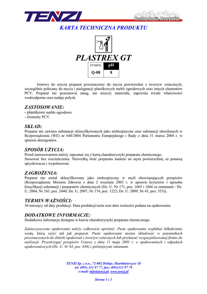 KARTA TECHNICZNA PRODUKTU PLASTREX GT SYMBOL pH Q-08 8 Gotowy do uŜycia preparat przeznaczony do mycia powierzchni z tworzyw sztucznych, szczególnie polecany do mycia i pielęgnacji plastikowych mebli ogrodowych oraz innych elementów PCV. Preparat nie pozostawia smug, nie niszczy materiału, zapewnia trwałe właściwości wodoodporne oraz nadaje połysk. ZASTOSOWANIE: - plastikowe meble ogrodowe - elementy PCV. SKŁAD: Preparat nie zawiera substancji sklasyfikowanych jako niebezpieczne oraz substancji określonych w Rozporządzeniu (WE) nr 648/2004 Parlamentu Europejskiego i Rady z dnia 31 marca 2004 r. w sprawie detergentów. SPOSÓB UśYCIA: Przed zastosowaniem naleŜy zapoznać się z kartą charakterystyki preparatu chemicznego. Stosować bez rozcieńczenia. Niewielką ilość preparatu nanieść na myta powierzchnię za pomocą spryskiwacza i wypolerować. ZAGROśENIA: Preparat nie został sklasyfikowany jako niebezpieczny w myśl obowiązujących przepisów (Rozporządzenie Ministra Zdrowia z dnia 2 września 2003 r. w sprawie kryteriów i sposobu klasyfikacji substancji i preparatów chemicznych (Dz. U. Nr 171, poz. 1665 i 1666 ze zmianami - Dz. U. 2004, Nr 243, poz. 2440; Dz. U. 2007, Nr 174, poz. 1222; Dz. U. 2009, Nr 43, poz. 353)). TERMIN WAśNOŚCI: 36 miesięcy od daty produkcji. Data produkcji/seria oraz data waŜności podana na opakowaniu. DODATKOWE INFORMACJE: Dodatkowe informacje dostępne w karcie charakterystyki preparatu chemicznego. Zanieczyszczone opakowanie naleŜy całkowicie opróŜnić. Puste opakowania wypłukać kilkakrotnie wodą, którą zuŜyć tak jak preparat. Puste opakowanie moŜna składować w pojemnikach przeznaczonych do zbiórki opakowań z tworzyw sztucznych lub przekazać wyspecjalizowanej firmie do utylizacji. Przestrzegać przepisów Ustawy z dnia 11 maja 2001 r. o opakowaniach i odpadach opakowaniowych (Dz. U. Nr 63, poz. 638) z późniejszymi zmianami. TENZI Sp. z o.o., 72-002 Dołuje, Skarbimierzyce 18 tel. (091) 311 97 77, fax: (091)311 97 79 e-mail: [email protected], www.tenzi.pl Strona 1 z 1