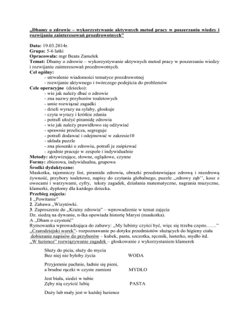 „Dbamy o zdrowie – wykorzystywanie aktywnych metod pracy w poszerzaniu wiedzy i rozwijaniu zainteresowań prozdrowotnych” Data: 19.03.2014r. Grupa: 5-6 latki Opracowała: mgr Beata Zamelek Temat: Dbamy o zdrowie – wykorzystywanie aktywnych metod pracy w poszerzaniu wiedzy i rozwijaniu zainteresowań prozdrowotnych. Cel ogólny: - utrwalenie wiadomości tematyce prozdrowotnej - rozwijanie aktywnego i twórczego podejścia do problemów Cele operacyjne (dziecko): - wie jak należy dbać o zdrowie - zna nazwy przyborów toaletowych - umie rozwiązać zagadki - dzieli wyrazy na sylaby, głoskuje - czyta wyrazy i krótkie zdania - potrafi ułożyć piramidę zdrowia - wie jak należy prawidłowo się odżywiać - sprawnie przelicza, segreguje - potrafi dodawać i odejmować w zakresie10 - układa puzzle - zna piosenki o zdrowiu, potrafi je zaśpiewać - zgodnie pracuje w zespole i indywidualnie Metody: aktywizujące, słowne, oglądowe, czynne Formy: zbiorowa, indywidualna, grupowa Środki dydaktyczne: Maskotka, tajemniczy list, piramida zdrowia, obrazki przedstawiające zdrową i niezdrową żywność, przybory toaletowe, napisy do czytania globalnego, puzzle ,,zdrowy ząb’’, kosz z owocami i warzywami, cyfry, teksty zagadek, działania matematyczne, nagrania muzyczne, klamerki, dyplomy dla każdego dziecka. Przebieg zajęcia: 1 ,,Powitanie” 2. Zabawa ,,Wizytówki. 3. Zaproszenie do ,,Krainy zdrowia” – wprowadzenie w temat zajęcia Dz. siedzą na dywanie, n-lka opowiada historię Marysi (maskotka). A ,,Dbam o czystość” Rymowanka wprowadzająca do zabawy: ,,My lubimy czyści być, więc się trzeba często……” ,,Czarodziejski worek”- rozpoznawanie po dotyku przedmiotów służących do higieny ciała dobieranie napisów do przyborów – kubek, pasta, szczotka, ręcznik, lusterko, mydło itd. ,,W łazience” rozwiązywanie zagadek – głoskowanie z wykorzystaniem klamerek Służy do picia, służy do mycia Bez niej nie byłoby życia WODA Przyjemnie pachnie, ładnie się pieni, a brudne rączki w czyste zamieni MYDŁO Jest biała, siedzi w tubie Zęby nią czyścić lubię PASTA Duży lub mały jest w każdej łazience Kiedy skończysz mycie, wytrze ci ręce RĘCZNIK Pantomima – przedstawienie w formie zagadek ruchowych wylosowanego hasła dotyczącego czystości. CZESANIE WŁOSÓW. ZAMIATANIE. MYCIE ZĘBÓW. MYCIE RĄK. B ,,Zdrowo się odżywiam” Rymowanka wprowadzająca do zabawy: ,,Wszyscy mamy słodkie minki, bo zjadamy ………………..(witaminki)” - układanie piramidy zdrowia- rozmowa nt. prawidłowego odżywiania się - kosz z owocami i warzywami – tworzenie zbiorów, przeliczanie, dzielenie nazw na sylaby Zabawa ruchowa do piosenki ,,Chcemy być zdrowi” C ,,Zdrowy ząbek” Rymowanka wprowadzająca do zabawy: ,,Myję zęby, bo wiem właśnie o tym, kto ich nie myje ten ma …………………………(kłopoty)” Rozmowa kierowana z dziećmi na temat potrzeby dbania o zęby - jak nazywa się lekarz leczący zęby? - jak często należy myć zęby? - jakie są metody szczotkowania? - jak często należy chodzić do dentysty do kontroli zębów? - czego należy unikać, aby zęby były zdrowe? ,,Zdrowy i chory ząbek” – układanie puzzli Aby zęby były zdrowe trzeba je nie tylko myć, ale zdrowo się odżywiać D ,,Uprawiam sport” Rymowanka wprowadzająca do zabawy: ,,Skakać, biegać tańczyć wkoło razem będzie nam ……………………(wesoło)” Zabawa ruchowa ,,Gimnastyka” Przysiad skok, przysiad skok Ręce w górę, w przód i w bok Teraz skłon, jeszcze raz. Czy już te ćwiczenia znasz? Gimnastykuj się kolego i nie pytaj się dlaczego E ,,Odpowiednio ubieramy się do pogody” Zabawa ruchowa ,,Tak – Nie” - Latem chodzimy w ciepłych kurtkach i czapkach. - Gdy pada deszcz idziemy pod parasolem. - Zimą ubieramy czapkę i szalik. - Gdy zachorujemy idziemy do lekarza. - Zimą ubieramy strój kąpielowy i opalamy się. ,,Ubieramy się” – kompletujemy ubrania rozwiązujemy działania matematyczne Zabawa ,,Burza mózgów”- wypowiedzi dzieci na temat ,,Zdrowy człowiek to ten, który…………” (nie zjada dużo cukierków chipsów, nie spędza zbyt wiele czasu przed telewizorem, dba o higienę osobistą, spędza dużo czasu na świeżym powietrzu, gimnastykuje się itp.) Odczytanie hasła: ZDROWIE Brawo! I z tym zadaniem świetnie sobie poradziliście. Pewnie Marysia się ucieszy, bo dzięki waszej pomocy będzie mogła wrócić do domu. Dzieci zauważają, że Marysia zniknęła. Zakończenie - podziękowanie za aktywny udział w zajęciu.