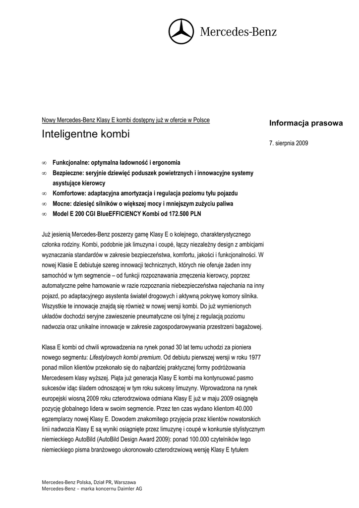 Nowy Mercedes-Benz Klasy E kombi dostępny już w ofercie w Polsce Informacja prasowa Inteligentne kombi 7. sierpnia 2009 • Funkcjonalne: optymalna ładowność i ergonomia • Bezpieczne: seryjnie dziewięć poduszek powietrznych i innowacyjne systemy asystujące kierowcy • Komfortowe: adaptacyjna amortyzacja i regulacja poziomu tyłu pojazdu • Mocne: dziesięć silników o większej mocy i mniejszym zużyciu paliwa • Model E 200 CGI BlueEFFICIENCY Kombi od 172.500 PLN Już jesienią Mercedes-Benz poszerzy gamę Klasy E o kolejnego, charakterystycznego członka rodziny. Kombi, podobnie jak limuzyna i coupé, łączy niezależny design z ambicjami wyznaczania standardów w zakresie bezpieczeństwa, komfortu, jakości i funkcjonalności. W nowej Klasie E debiutuje szereg innowacji technicznych, których nie oferuje żaden inny samochód w tym segmencie – od funkcji rozpoznawania zmęczenia kierowcy, poprzez automatyczne pełne hamowanie w razie rozpoznania niebezpieczeństwa najechania na inny pojazd, po adaptacyjnego asystenta świateł drogowych i aktywną pokrywę komory silnika. Wszystkie te innowacje znajdą się również w nowej wersji kombi. Do już wymienionych układów dochodzi seryjne zawieszenie pneumatyczne osi tylnej z regulacją poziomu nadwozia oraz unikalne innowacje w zakresie zagospodarowywania przestrzeni bagażowej. Klasa E kombi od chwili wprowadzenia na rynek ponad 30 lat temu uchodzi za pioniera nowego segmentu: Lifestylowych kombi premium. Od debiutu pierwszej wersji w roku 1977 ponad milion klientów przekonało się do najbardziej praktycznej formy podróżowania Mercedesem klasy wyższej. Piąta już generacja Klasy E kombi ma kontynuować pasmo sukcesów idąc śladem odnoszącej w tym roku sukcesy limuzyny. Wprowadzona na rynek europejski wiosną 2009 roku czterodrzwiowa odmiana Klasy E już w maju 2009 osiągnęła pozycję globalnego lidera w swoim segmencie. Przez ten czas wydano klientom 40.000 egzemplarzy nowej Klasy E. Dowodem znakomitego przyjęcia przez klientów nowatorskich linii nadwozia Klasy E są wyniki osiągnięte przez limuzynę i coupé w konkursie stylistycznym niemieckiego AutoBild (AutoBild Design Award 2009): ponad 100.000 czytelników tego niemieckiego pisma branżowego ukoronowało czterodrzwiową wersję Klasy E tytułem Mercedes-Benz Polska, Dział PR, Warszawa Mercedes-Benz – marka koncernu Daimler AG najpiękniejszego auta świata, równocześnie przyznając wersji dwudrzwiowej zwycięstwo w kategorii coupé/ kabriolet. Design: nowy wizerunek Mercedesa w parze z elementami stylizacyjnymi Klasy E Juz z zewnątrz nowa wersja kombi sprawia wrażenie samochodu atletycznego, funkcjonalnego i zarazem bezpiecznego. Niezależny i charakterystyczny wygląd jest oparty na nowym stylu Mercedesa, ukształtowanym przez Klasę S i obecnie również reprezentowanym przez Klasę C. Jedną z cech takiej linii nadwozia jest współgranie wklęsłych i wypukłych powierzchni, ograniczanych dynamicznie poprowadzonymi krawędziami i płaszczyznami strukturalnymi. Z boku samochodu widocznych jest wiele nowych elementów, które jasno opisują geny nowej wersji kombi. Dzięki połyskującym czarnymi nakładkom słupki B i C nikną w tle i cała powierzchnia szyb bocznych wizualnie sprawia wrażenie jednej płaszczyzny. Efektem jest napięty łuk, obejmujący słupek A, prężną linię dachu i zwężający się ku dołowi słupek D, oparty stabilnie na atletycznej linii barków samochodu. Charakterystyczne ukształtowanie nakładek progów, wizualnie stonowanych w środkowej części i mocniej podkreślonych krawędzią światła w obszarze nadkoli, potęguje zwartość bryły. W szczególny sposób przyczynia się do tego muskularna wypukłość przed tylnymi kołami. Przy projektowaniu tyłu pojazdu designerom Mercedesa załeżało na podkreśleniu wysokich walorów funkcjonalnych samochodu. Osiągneli to poprzez zaakcentowanie poziomych linii, na przykład w postaci pasa tworzonego przez tylne lampy i chromowaną listwę z uchwytem. Nowe lampy tylne w technologii LED są dwuczęściowe i wizualnie łączą ściany boczne z pokrywą tylną. Dzięki dopracowanemu wyglądowi, nie tylko w dzień, ale także w nocy, już na pierwszy rzut oka można łatwo rozpoznać nową wersję nadwoziową Mercedesa. Kombi Klasy E jest największym kombi w segmencie Premium i widać to w bryle samochodu. Funkcjonalność: optymalna ładowność i ergonomiczna obsługa W nowej Klasie E kombi na wyróżnienie zasługują rozwiązania dostępu do przestrzeni bagażowej. Należą do nich m.in. seryjnie montowana pokrywa tylna EASY-PACK otwierana automatycznie kluczykiem lub naciśnięciem uchwytu oraz innowacyjny system "Quickfold" Mercedes-Benz Polska, Dział PR, Warszawa Mercedes-Benz – marka koncernu Daimler AG Strona 2 pozwalający na łatwe złożenie tylnych oparć od strony bagażnika. Ten ostatni nie wymaga uprzedniego przestawiania zagłówków ani siedzisk tylnej kanapy. Oba oparcia zostają odblokowane i złożone poprzez linkę w taki sposób, że w bagażniku powstaje równa, płaska powierzchnia. Dodatkową zaletą jest możliwość składania obu oparć razem lub osobnego składania lewego bądź prawego oparcia. Dzięki temu transportowanie długich lub nieporęcznych przedmiotów nie wyklucza jednoczesnego przewożenia pasażerów na tylnej kanapie. Odblokowanie i złożenie oparcia jest możliwe również ze środka pojazdu. Znacznie prostsze jest też posługiwanie się seryjną podwójną roletą, w którą wbudowana jest osłona przestrzeni bagażowej i siatka zabezpieczająca. Podwójna roleta została po raz pierwszy zamontowana bezpośrednio na pasie podokiennym, co zapewnia znacznie łatwiejszy montaż i demontaż. Nowa Klasa E w wersji kombi z przestrzenią bagażową o objętości do 1.950 litrów (długość/ szerokość / wysokość: 4.895/1.854/1.471 milimetrów) ustanawia nowe standardy w swoim segmencie. O wysokich kompetencjach
