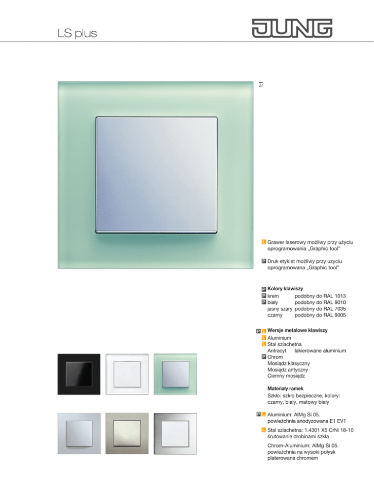 1:1 LS plus L Grawer laserowy możliwy przy użyciu oprogramowania „Graphic tool” P Druk etykiet możliwy przy uzyciu oprogramowana „Graphic tool” P Kolory klawiszy P krem podobny do RAL 1013 P biały podobny do RAL 9010 jasny szary podobny do RAL 7035 czarny podobny do RAL 9005 P L Wersje metalowe klawiszy L Aluminium L Stal szlachetna Antracyt lakierowane aluminium P Chrom Mosiądz klasyczny Mosiądz antyczny Ciemny mosiądz Materiały ramek Szkło: szkło bezpieczne, kolory: czarny, biały, matowy biały P L Aluminium: AlMg Si 05. powieżchnia anodyzowana E1 EV1 L Stal szlachetna: 1.4301 X5 CrNi 18-10 śrutowanie drobinami szkła Chrom-Aluminium: AlMg Si 05. powieżchnia na wysoki połysk platerowana chromem LS plus Rozmiary ramek 115mm x 115 mm 1-krotna 2-krotna 186mm x 115 mm 3-krotna 257mm x 115 mm 4-krotna 328mm x 115 mm 5-krotna 399mm x 115 mm Ramki mogą być instalowane w pionie lub w poziomie. Faza 0.5 x 45° Promień krawędzi Faza krawędzi ramki 0.5 x 45°