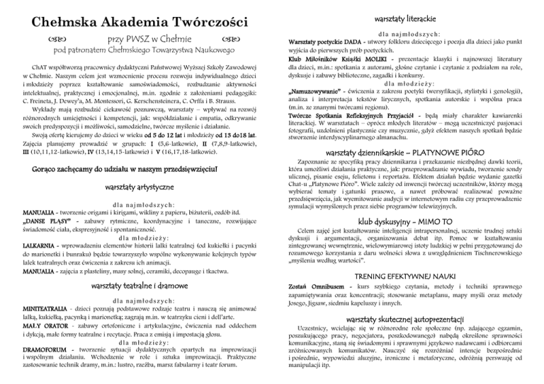 Chełmska Akademia Twórczości przy PWSZ w Chełmie pod patronatem Chełmskiego Towarzystwa Naukowego ChAT współtworzą pracownicy dydaktyczni Państwowej Wyższej Szkoły Zawodowej w Chełmie. Naszym celem jest wzmocnienie procesu rozwoju indywidualnego dzieci i młodzieży poprzez kształtowanie samoświadomości, rozbudzanie aktywności intelektualnej, praktycznej i emocjonalnej, m.in. zgodnie z założeniami pedagogiki: C. Freineta, J. Dewey’a, M. Montessori, G. Kerschensteinera, C. Orffa i B. Strauss. Wykłady mają rozbudzić ciekawość poznawczą, warsztaty – wpływać na rozwój różnorodnych umiejętności i kompetencji, jak: współdziałanie i empatia, odkrywanie swoich predyspozycji i możliwości, samodzielne, twórcze myślenie i działanie. Swoją ofertę kierujemy do dzieci w wieku od 5 do 12 lat i młodzieży od 13 do18 lat. Zajęcia planujemy prowadzić w grupach: I (5,6-latkowie), II (7,8,9-latkowie), III (10,11,12-latkowie), IV (13,14,15-latkowie) i V (16,17,18-latkowie). Gorąco zachęcamy do udziału w naszym przedsięwzięciu! warsztaty artystyczne dla najmłodszych: MANUALIA - tworzenie origami i kirigami, wikliny z papieru, biżuterii, ozdób itd. „DANSE PLĄSY” - zabawy rytmiczne, koordynacyjne i taneczne, rozwijające świadomość ciała, ekspresyjność i spontaniczność. dla młodzieży: LALKARNIA - wprowadzeniu elementów historii lalki teatralnej (od kukiełki i pacynki do marionetki i bunraku) będzie towarzyszyło wspólne wykonywanie kolejnych typów lalek teatralnych oraz ćwiczenia z zakresu ich animacji. MANUALIA - zajęcia z plasteliny, masy solnej, ceramiki, decopauge i tkactwa. warsztaty teatralne i dramowe dla najmłodszych: MINITEATRALIA - dzieci poznają podstawowe rodzaje teatru i nauczą się animować lalką, kukiełką, pacynką i marionetką; zagrają m.in. w teatrzyku cieni i dell’arte. MAŁY ORATOR - zabawy ortofoniczne i artykulacyjne, ćwiczenia nad oddechem i dykcją, małe formy teatralne i recytacje. Praca z emisją i impostacją głosu. dla młodzieży: DRAMOFORUM - tworzenie sytuacji dydaktycznych opartych na improwizacji i wspólnym działaniu. Wchodzenie w role i sztuka improwizacji. Praktyczne zastosowanie technik dramy, m.in.: lustro, rzeźba, marsz fabularny i teatr forum. warsztaty literackie dla najmłodszych: Warsztaty poetyckie DADA - utwory folkloru dziecięcego i poezja dla dzieci jako punkt wyjścia do pierwszych prób poetyckich. Klub Miłośników Książki MOLIKI - prezentacje klasyki i najnowszej literatury dla dzieci, m.in.: spotkania z autorami, głośne czytanie i czytanie z podziałem na role, dyskusje i zabawy biblioteczne, zagadki i konkursy. dla młodzieży: „Namuzowywanie” - ćwiczenia z zakresu poetyki (wersyfikacji, stylistyki i genologii), analiza i interpretacja tekstów lirycznych, spotkania autorskie i wspólna praca (m.in. ze znanymi twórcami regionu). Twórcze Spotkania Refleksyjnych Przyjaciół - będą miały charakter kawiarenki literackiej. W warsztatach – oprócz młodych literatów – mogą uczestniczyć pasjonaci fotografii, uzdolnieni plastycznie czy muzycznie, gdyż efektem naszych spotkań będzie stworzenie interdyscyplinarnego almanachu. warsztaty dziennikarskie – PLATYNOWE PIÓRO Zapoznanie ze specyfiką pracy dziennikarza i przekazanie niezbędnej dawki teorii, która umożliwi działania praktyczne, jak: przeprowadzanie wywiadu, tworzenie sondy ulicznej, pisanie eseju, felietonu i reportażu. Efektem działań będzie wydanie gazetki Chat-u „Platynowe Pióro”. Wiele zależy od inwencji twórczej uczestników, którzy mogą wybierać tematy i gatunki prasowe, a nawet próbować realizować poważne przedsięwzięcia, jak wyemitowanie audycji w internetowym radiu czy przeprowadzenie symulacji wymyślonych przez siebie programów telewizyjnych. klub dyskusyjny - MIMO TO Celem zajęć jest kształtowanie inteligencji intrapersonalnej, uczenie trudnej sztuki dyskusji i argumentacji, organizowania debat itp. Pomoc w kształtowaniu zintegrowanej wewnętrznie, wielowymiarowej istoty ludzkiej w pełni przygotowanej do rozumowego korzystania z daru wolności słowa z uwzględnieniem Tischnerowskiego „myślenia według wartości”. TRENING EFEKTYWNEJ NAUKI Zostań Omnibusem - kurs szybkiego czytania, metody i techniki sprawnego zapamiętywania oraz koncentracji; stosowanie metaplanu, mapy myśli oraz metody Josego, Jigsaw, siedmiu kapeluszy i innych. warsztaty skutecznej autoprezentacji Uczestnicy, wcielając się w różnorodne role społeczne (np. zdającego egzamin, poszukującego pracy, negocjatora, poszkodowanego) nabędą określone sprawności komunikacyjne, staną się świadomymi i sprawnymi językowo nadawcami i odbiorcami zróżnicowanych komunikatów. Nauczyć się rozróżniać intencje bezpośrednie i pośrednie, wypowiedzi aluzyjne, ironiczne i metaforyczne, odróżnią perswazję od manipulacji itp. „Odkrywanie Nauki Moj ą Pasją” wykłady popularnonaukowe Celem wykładów jest rozbudzenie w uczestnikach naturalnej ciekawości nauką, przybliżenie środowiska akademickiego, zmotywowanie do własnych poszukiwań i badań poprzez prezentację różnych dyscyplin naukowych. Propo z ycj e t em a tyk i w y k ła dó w: Zawód reporter, czyli o pracy dziennikarzy bez blichtru i tajemnic; Meno o lasce, laska o menie - płeć w języku młodzieży; O kulturze języka słów kilka - teoria wulgaryzmów i nie tylko; Komiks i manga jako teksty współczesnej popkultury; Na agorze i na forum. Jak żyli starożytni Grecy i Rzymianie; Historia matematyki - liczby, twierdzenia, algorytmy; Co naprawdę kryje w sobie czekolada? Zbadaj swoją inteligencję. Inteligencje wielorakie Gardnera jako punkt wyjścia do rozumienia siebie i swoich możliwości; Gra w kolory. O symbolice i znaczeniu barw; „Poruszaj się z głową”. Nauka o znaczeniu gestu, postawy i mimiki; Miasteczko Chełm na kulturalnej mapie świata; warsztaty - MATEMATYKA JEST SZTUKĄ Spotkan