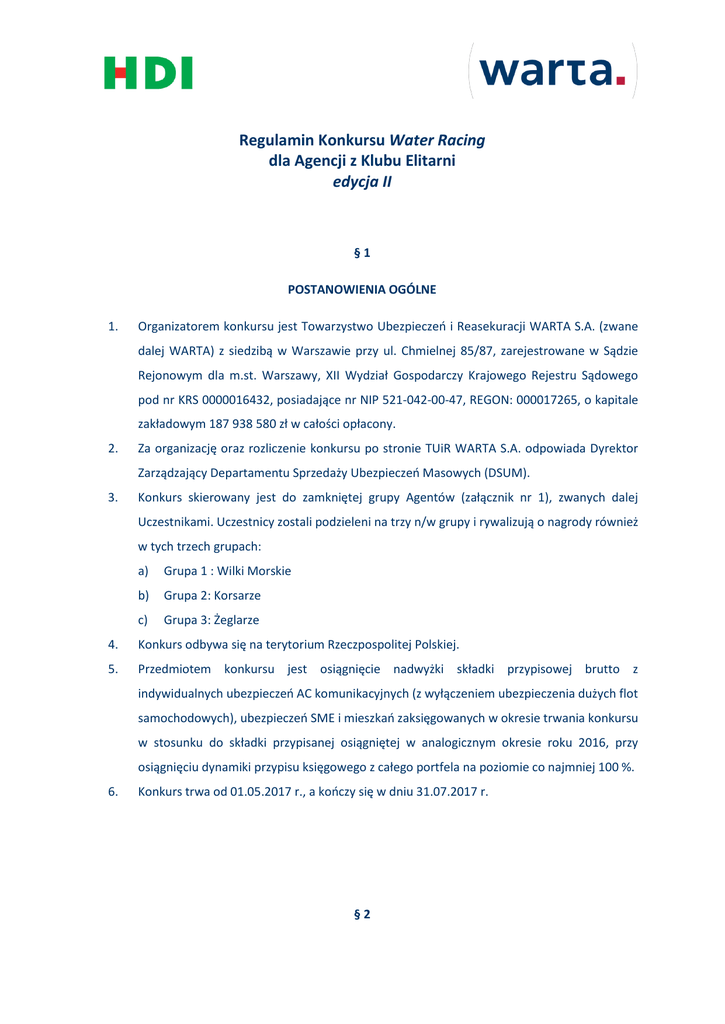 Regulamin Konkursu Water Racing dla Agencji z Klubu Elitarni edycja II §1 POSTANOWIENIA OGÓLNE 1. Organizatorem konkursu jest Towarzystwo Ubezpieczeń i Reasekuracji WARTA S.A. (zwane dalej WARTA) z siedzibą w Warszawie przy ul. Chmielnej 85/87, zarejestrowane w Sądzie Rejonowym dla m.st. Warszawy, XII Wydział Gospodarczy Krajowego Rejestru Sądowego pod nr KRS 0000016432, posiadające nr NIP 521-042-00-47, REGON: 000017265, o kapitale zakładowym 187 938 580 zł w całości opłacony. 2. Za organizację oraz rozliczenie konkursu po stronie TUiR WARTA S.A. odpowiada Dyrektor Zarządzający Departamentu Sprzedaży Ubezpieczeń Masowych (DSUM). 3. Konkurs skierowany jest do zamkniętej grupy Agentów (załącznik nr 1), zwanych dalej Uczestnikami. Uczestnicy zostali podzieleni na trzy n/w grupy i rywalizują o nagrody również w tych trzech grupach: a) Grupa 1 : Wilki Morskie b) Grupa 2: Korsarze c) Grupa 3: Żeglarze 4. Konkurs odbywa się na terytorium Rzeczpospolitej Polskiej. 5. Przedmiotem konkursu jest osiągnięcie nadwyżki składki przypisowej brutto z indywidualnych ubezpieczeń AC komunikacyjnych (z wyłączeniem ubezpieczenia dużych flot samochodowych), ubezpieczeń SME i mieszkań zaksięgowanych w okresie trwania konkursu w stosunku do składki przypisanej osiągniętej w analogicznym okresie roku 2016, przy osiągnięciu dynamiki przypisu księgowego z całego portfela na poziomie co najmniej 100 %. 6. Konkurs trwa od 01.05.2017 r., a kończy się w dniu 31.07.2017 r. §2 CEL KONKURSU 1. Celem konkursu jest aktywizacja sprzedaży indywidualnych ubezpieczeń AC komunikacyjnych, ubezpieczeń SME i mieszkań oraz zwiększenie liczby klientów ubezpieczonych w WARCIE. 2. Laureatami konkursu zostaną Uczestnicy wyłonieni i osiągający wyniki zgodnie z zasadami przewidzianymi w niniejszym Regulaminie. §3 ZASADY KONKURSU 1. Warunkiem przystąpienia Uczestnika do konkursu jest czynna umowa agencyjna zawarta z TUiR WARTA S.A., na podstawie której Uczestnik, zgodnie z potwierdzonymi zapisami oraz ze zgłoszeniem do KNF co najmniej na miesiąc przed datą rozpoczęcia konkursu, wykonuje czynności agencyjne na rzecz TUiR WARTA S.A.. Uczestnik musi być zarejestrowany w Rejestrze Agentów Ubezpieczeniowych prowadzonym przez Urząd Nadzoru Finansowego na mocy wniosku złożonego przez TUiR WARTA S.A. 2. Konkurs polega na osiągnięciu przez Agenta nadwyżki składki przypisanej brutto z indywidualnych ubezpieczeń AC komunikacyjnych (z wyłączeniem ubezpieczenia dużych flot samochodowych), ubezpieczeń SME i mieszkań zaksięgowanych w okresie trwania konkursu w stosunku do przypisu składki osiągniętej w analogicznym okresie roku 2016, przy osiągnięciu dynamiki przypisu księgowego z całego portfela na poziomie co najmniej 100 %. 3. 4. Osiągnięta nadwyżka składki będzie przeliczana na punkty zgodnie z poniższym wzorem: a) Ubezpieczenia SME – za każde 100 zł nadwyżki → 1 punkty b) Indywidualne ubezpieczenia AC komunikacyjne – za każde 100 zł nadwyżki → 1 punkt c) Ubezpieczenie mieszkań – za każde 50 zł nadwyżki → 1 punkt Dodatkowo Organizator konkursu przyzna 2 Uczestnikom „Piracką Kartę”. Aby otrzymać „Piracką Kartę” Uczestnik musi wziąć udział we wszystkich akcjach edukacyjnych odbywających się w okresie trwania konkursu i prawidłowo odpowiedzieć na pytania. Liczy się również kolejność odpowiedzi. 5. Laureatami konkursu zostanie 7 Agentów z największą łączną liczbą punktów osiągniętych z nadwyżki przypisu z indywidualnych ubezpieczeń AC komunikacyjnych (z wyłączeniem ubezpieczenia dużych flot samochodowych), ubezpieczeń SME i mieszkań oraz 2 Agentów, którzy otrzymają „Piracką Kartę” w ramach akcji edukacyjnej. Laureaci zostaną wyłonieni na podstawie rankingu ogłoszonego przez Organizatora. 6. Liczba wyłonionych laureatów z największą łączną liczbą punktów osiągniętych z nadwyżki przypisu z indywidualnych ubezpieczeń AC komunikacyjnych (z wyłączeniem ubezpieczenia dużych flot samochodowych), ubezpieczeń SME i mieszkań w poszczególnych grupach jest następująca: 7. a) Grupa 1: Wilki Morskie – 3 laureatów b) Grupa 2: Korsarze – 2 laureat c) Grupa 3: Żeglarze – 2 laureat W przypadku osiągnięcia tej samej sumy liczby punktów z indywidualnych ubezpieczeń AC komunikacyjnych (z wyłączeniem ubezpieczenia dużych flot samochodowych), ubezpieczeń SME i mieszkań o przyznaniu nagrody zgodnie z § 4 ust. 1 decyduje dodatkowy parametr jakim jest najwyższa dynamika przypisu księgowego z całego portfela w okresie trwania konkursu. 8. Za najwyższą łączną liczbę punktów osiągniętą z nadwyżki przypisu z indywidualnych ubezpieczeń AC komunikacyjnych (z wyłączeniem ubezpieczenia dużych flot samochodowych), ubezpieczeń SME i mieszkań oraz za zdobycie „Pirackiej Karty” Uczestnikom konkursu zostanie przyznana nagroda zgodnie z § 4 ust. 1. 9. Rozwiązanie umowy agencyjnej z TUiR WARTA S.A., w trakcie trwania konkursu, wiąże się z automatycznym wykluczeniem z udziału w konkursie. 10. Co tydzień podczas trwania konkursu, będzie przygotowywany Ranking Uczestników na podstawie największej łącznej liczby punktów osiągniętych z nadwyżki przypisu z indywidualnych ubezpieczeń AC komunikacyjnych (z wyłączeniem ubezpieczenia dużych flot samochodowych), ubezpieczeń SME i mieszkań. 11. Agent ma prawo do rezygnacji z nagrody, o której mowa w § 4 ust 1, brak zgody na odebranie nagrody wymaga potwierdzenia w formie pisemnej dostarczonej do TUiR WARTA S.A. na każdym etapie trwania konkursu. W tym przypadku uprawniony do odebrania nagrody jest kolejny Agent z rankingu. 12. W przypadku transferu obsługi umów ubezpieczenia pomiędzy Agentami / dealerami / doradcami ubezpieczeniowymi (np. łączenie / przejęcie obsługi portfela, zmiana formy prawnej, zatrudnianie nowych pracowników / zleceniobiorców) Komisja Konkursowa zastrzega sobie prawo ind