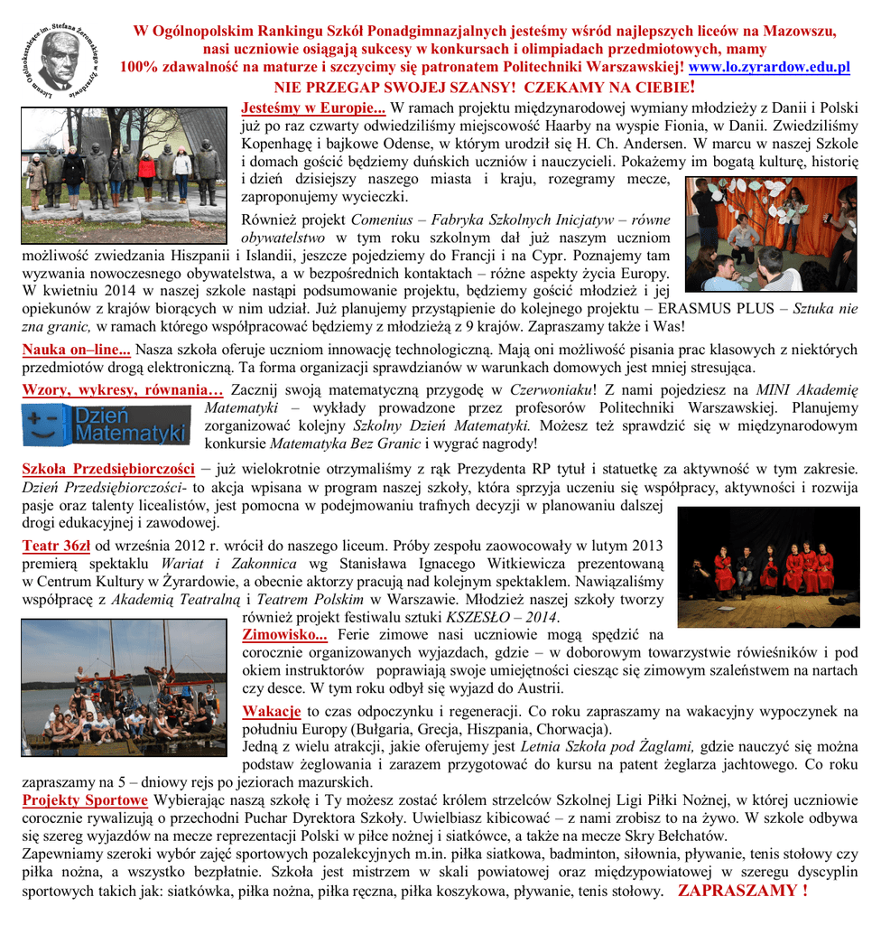 W Ogólnopolskim Rankingu Szkół Ponadgimnazjalnych jesteśmy wśród najlepszych liceów na Mazowszu, nasi uczniowie osiągają sukcesy w konkursach i olimpiadach przedmiotowych, mamy 100% zdawalność na maturze i szczycimy się patronatem Politechniki Warszawskiej! www.lo.zyrardow.edu.pl NIE PRZEGAP SWOJEJ SZANSY! CZEKAMY NA CIEBIE! Jesteśmy w Europie... W ramach projektu międzynarodowej wymiany młodzieży z Danii i Polski już po raz czwarty odwiedziliśmy miejscowość Haarby na wyspie Fionia, w Danii. Zwiedziliśmy Kopenhagę i bajkowe Odense, w którym urodził się H. Ch. Andersen. W marcu w naszej Szkole i domach gościć będziemy duńskich uczniów i nauczycieli. Pokażemy im bogatą kulturę, historię i dzień dzisiejszy naszego miasta i kraju, rozegramy mecze, zaproponujemy wycieczki. Również projekt Comenius – Fabryka Szkolnych Inicjatyw – równe obywatelstwo w tym roku szkolnym dał już naszym uczniom możliwość zwiedzania Hiszpanii i Islandii, jeszcze pojedziemy do Francji i na Cypr. Poznajemy tam wyzwania nowoczesnego obywatelstwa, a w bezpośrednich kontaktach – różne aspekty życia Europy. W kwietniu 2014 w naszej szkole nastąpi podsumowanie projektu, będziemy gościć młodzież i jej opiekunów z krajów biorących w nim udział. Już planujemy przystąpienie do kolejnego projektu – ERASMUS PLUS – Sztuka nie zna granic, w ramach którego współpracować będziemy z młodzieżą z 9 krajów. Zapraszamy także i Was! Nauka on–line... Nasza szkoła oferuje uczniom innowację technologiczną. Mają oni możliwość pisania prac klasowych z niektórych przedmiotów drogą elektroniczną. Ta forma organizacji sprawdzianów w warunkach domowych jest mniej stresująca. Wzory, wykresy, równania… Zacznij swoją matematyczną przygodę w Czerwoniaku! Z nami pojedziesz na MINI Akademię Matematyki – wykłady prowadzone przez profesorów Politechniki Warszawskiej. Planujemy zorganizować kolejny Szkolny Dzień Matematyki. Możesz też sprawdzić się w międzynarodowym konkursie Matematyka Bez Granic i wygrać nagrody! Szkoła Przedsiębiorczości – już wielokrotnie otrzymaliśmy z rąk Prezydenta RP tytuł i statuetkę za aktywność w tym zakresie. Dzień Przedsiębiorczości- to akcja wpisana w program naszej szkoły, która sprzyja uczeniu się współpracy, aktywności i rozwija pasje oraz talenty licealistów, jest pomocna w podejmowaniu trafnych decyzji w planowaniu dalszej drogi edukacyjnej i zawodowej. Teatr 36zł od września 2012 r. wrócił do naszego liceum. Próby zespołu zaowocowały w lutym 2013 premierą spektaklu Wariat i Zakonnica wg Stanisława Ignacego Witkiewicza prezentowaną w Centrum Kultury w Żyrardowie, a obecnie aktorzy pracują nad kolejnym spektaklem. Nawiązaliśmy współpracę z Akademią Teatralną i Teatrem Polskim w Warszawie. Młodzież naszej szkoły tworzy również projekt festiwalu sztuki KSZESŁO – 2014. Zimowisko... Ferie zimowe nasi uczniowie mogą spędzić na corocznie organizowanych wyjazdach, gdzie – w doborowym towarzystwie rówieśników i pod okiem instruktorów poprawiają swoje umiejętności ciesząc się zimowym szaleństwem na nartach czy desce. W tym roku odbył się wyjazd do Austrii. Wakacje to czas odpoczynku i regeneracji. Co roku zapraszamy na wakacyjny wypoczynek na południu Europy (Bułgaria, Grecja, Hiszpania, Chorwacja). Jedną z wielu atrakcji, jakie oferujemy jest Letnia Szkoła pod Żaglami, gdzie nauczyć się można podstaw żeglowania i zarazem przygotować do kursu na patent żeglarza jachtowego. Co roku zapraszamy na 5 – dniowy rejs po jeziorach mazurskich. Projekty Sportowe Wybierając naszą szkołę i Ty możesz zostać królem strzelców Szkolnej Ligi Piłki Nożnej, w której uczniowie corocznie rywalizują o przechodni Puchar Dyrektora Szkoły. Uwielbiasz kibicować – z nami zrobisz to na żywo. W szkole odbywa się szereg wyjazdów na mecze reprezentacji Polski w piłce nożnej i siatkówce, a także na mecze Skry Bełchatów. Zapewniamy szeroki wybór zajęć sportowych pozalekcyjnych m.in. piłka siatkowa, badminton, siłownia, pływanie, tenis stołowy czy piłka nożna, a wszystko bezpłatnie. Szkoła jest mistrzem w skali powiatowej oraz międzypowiatowej w szeregu dyscyplin sportowych takich jak: siatkówka, piłka nożna, piłka ręczna, piłka koszykowa, pływanie, tenis stołowy. ZAPRASZAMY !