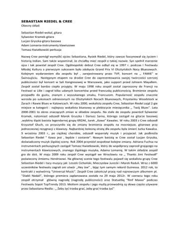 SEBASTIAN RIEDEL & CREE Obecny skład: Sebastian Riedel-wokal, gitara Sylwester Kramek-gitara Lucjan Gryszka-gitara basowa Adam Lomania-instrumenty klawiszowe Tomasz Kwiatkowski-perkusja Nazwę Cree pomógł wymyślid ojciec Sebastiana, Rysiek Riedel, który zawsze fascynował się życiem i historią Indian. Sam także wspominał, że chciałby mied zespół o takiej nazwie. Syn spełnił marzenie ojca i tak powstał zespół Cree. Ogólnopolski debiut Cree odbył się w 1997 r. podczas I Festiwalu Młodej Kultury a pierwszym sukcesem było zdobycie Grand Prix VI Olsztyoskich Nocy Bluesowych. Kolejnym wydarzeniem dla zespołu był , zarejestrowany przez TVP, koncert na ,, FAMIE” w Świnoujściu. Następnym etapem na drodze Cree do zaprezentowania swojej twórczości szerszej publiczności był koncert w Sali Kongresowej w Warszawie, jako support przed Johnem Mayallem. Zespół został bardzo ciepło przyjęty. W maju 1998 roku zespół został zaproszony do Francji na Festiwal w Lille i zagrał kilka udanych koncertów przed francuską publicznością. Brzmienie zespołu przypadło do gustu, znanym z wyszukanego smaku, Francuzom. Popularnośd zespołu znacznie wzrosła po sukcesach odniesionych na Olsztyoskich Nocach Bluesowych, Przystanku Woodstock w Żarach i Rawie Blues w Katowicach. W roku 2000, wokalista zespołu Cree, Sebastian Riedel zajął 2-gie miejsce w kategorii : najlepszy wokalista bluesowy w plebiscycie miesięcznika ,, Twój Blues”. Lata 2000-2001 to okres znaczących zmian w składzie zespołu. Na stałe do zespołu powrócił Sylwester Kramek, natomiast odszedł Marek Gruszka i Dariusz Sarna, którego zastąpił na gitarze basowej ,wybitny śląski basista legendarnej grupy KRZAK, Jurek ,,Kawa” Kawalec. W roku 2003 z Cree odszedł Krzysztof Głuch, co przyczyniło się do zmiany brzmienia zespołu na mocniejsze, gitarowe przy jednoczesnej rezygnacji z klawiszy. Najbardziej bolesną stratą dla zespołu była śmierd Jurka Kawalca. 9 września 2003 r., po ciężkiej chorobie, odszedł wspaniały muzyk i przyjaciel. Jak podkreśla Sebastian Riedel ” Kawa jest , będzie i zostanie”. Nowym basistą w Cree został Lucjan Gryszka, doświadczony muzyk śląskiej sceny. Rok 2004 przyniósł zespołowi kolejne zmiany. Adriana Fuchsa na instrumentach perkusyjnych zastąpił Tomasz Kwiatkowski, który do współpracy zaprosił grającego na instrumentach klawiszowych, znanego śląskiego muzyka, Adama Lomanię. W takim składzie zespół gra do dziś. W maju 2009 roku zespół Cree wystąpił we Wrocławiu na ,, Thanks Jimi Festiwall” poświecony Jimiemu Hendrixowi. Na głównej scenie tego festiwalu pojawił się wokalista grupy Cree Sebastian Riedel i tacy muzycy jak: Leszek Cichooski, Mieczysław Jurecki i Marek Raduli. Wraz z 6000 uczestników festiwalu zagrali oni utwór ,,Hey Joe” , bijąc tym samym rekord Guinessa. 2012 rok, to kontrakt z wytwórnią “Universal Music”. Zespół Cree zakooczył pracę nad najnowszym albumem pt. “Diabli Nadali”, którego premiera zaplanowana została na 29 maja 2012r. W czerwcu tego roku zespół otrzymał główną nagrodę (nagrodę publiczności) oraz Statuetkę “Rmf Maxxx” podczas Festiwalu Sopot TopTrendy 2013. Mottem zespołu i jego myślą przewodnią są słowa często używane przez Sebastiana Riedla : ,, Żeby żyd trzeba grad, żeby grad trzeba żyd”