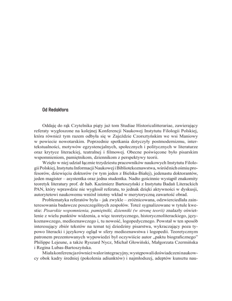 Od Redaktora Oddaję do rąk Czytelnika piąty już tom Studiae Historicalitterariae, zawierający referaty wygłoszone na kolejnej Konferencji Naukowej Instytutu Filologii Polskiej, która również tym razem odbyła się w Zajeździe Czorsztyńskim we wsi Maniowy w powiecie nowotarskim. Poprzednie spotkania dotyczyły postmodernizmu, intertekstualności, motywów egzystencjalnych, społecznych i politycznych w literaturze oraz krytyce literackiej, teatralnej i filmowej. Obecne poświęcone było pisarskim wspomnieniom, pamiętnikom, dziennikom z perspektywy teorii. Wzięło w niej udział łącznie trzydziestu pracowników naukowych Instytutu Filologii Polskiej, Instytutu Informacji Naukowej i Bibliotekoznawstwa, wśród nich ośmiu profesorów, dziewięciu doktorów (w tym jeden z Bielska-Białej), jedenastu doktorantów, jeden magister – asystentka oraz jedna studentka. Nadto gościnnie wystąpił znakomity teoretyk literatury prof. dr hab. Kazimierz Bartoszyński z Instytutu Badań Literackich PAN, który wprawdzie nie wygłosił referatu, to jednak dzięki aktywności w dyskusji, autorytetowi naukowemu wniósł istotny wkład w merytoryczną zawartość obrad. Problematyka referatów była – jak zwykle – zróżnicowana, odzwierciedlała zainteresowania badawcze poszczególnych zespołów. Toteż sygnalizowane w tytule kwestie: Pisarskie wspomnienia, pamiętniki, dzienniki (w stronę teorii) znalazły oświetlenie z wielu punktów widzenia, a więc teoretycznego, historycznoliterackiego, językoznawczego, medioznawczego i, tu nowość, logopedycznego. Powstał w ten sposób interesujący zbiór tekstów na temat tej dziedziny pisarstwa, wykraczający poza typowo literacki i językowy ogląd w sfery medioznawstwa i logopedii. Teoretycznym patronem prezentowanych wypowiedzi był oczywiście autor „paktu biograficznego” Philippe Lejeune, a także Ryszard Nycz, Michał Głowiński, Małgorzata Czermińska i Regina Lubas-Bartoszyńska. Miała konferencja również walor integracyjny, występowali doświadczeni naukowcy obok kadry średniej (pokolenia adiunktów) i najmłodszej, adeptów kunsztu nau- 4 kowego (doktorantów). Myślę, że zwłaszcza dla nich było to ważne doświadczenie. Dawało bowiem możliwość nie tylko wygłoszenia referatu, wysłuchania, nieraz bardzo krytycznych uwag, lecz również własnego uczestnictwa w dyskusji. Wzrastający z roku na rok udział doktorantów świadczy o randze i roli, jaką ta konferencja spełnia wobec naszego środowiska naukowego. Kraków, w sierpniu 2005 roku Bolesław Faron Annales Academiae Paedagogicae Cracoviensis Folia 37 Studia Historicolitteraria VI 2006 Regina Lubas-Bartoszyńska Nowsze problemy teoretyczne pisania o sobie. Przykład wypowiedzi autobiograficznych pisarzy polskich ostatnich dziesięcioleci Uwagi wstępne Na wstępie należy poczynić kilka uwag dotyczących najnowszych problemów teoretycznych obszaru piśmienniczego, w ramach którego mieszczą się wymienione przed tym uściśleniem formy: wspomnienie, dziennik, pamiętnik, autobiografia. Sprawa elementarna: cezura czasowa tego co nowe w pisaniu autobiograficznym i tego co w nim klasyczne. Trudno tu o ścisłą granicę, albowiem zagadnienia, o których głośno dzisiaj w polskiej krytyce, znalazły już swe miejsce wcześniej na Zachodzie, zwłaszcza we wszechstronnych pracach Philippe’a Lejeune’a1. Modni w r. 2004 w Polsce teoretycy autobiografii John Paul Eakin czy John Olney2 przywoływani byli kilkanaście razy w mych książkach z r. 1993 i 1997. Punktem orientacyjnym niech będzie data wydania książki Lejeune’a dotyczącej „paktu autobiograficznego” – rok 1975. Tym co nowe będą problemy drążone po tej dacie, a nie uwzględniane lub słabo obecne wcześniej. Druga uwaga natury osobistej. O większości problemów tego wystąpienia pisałam już w takich czy innych kontekstach, dlatego mogą tu i ówdzie wystąpić pewne powtórzenia. Ale materiał przykładowy jest zupełnie inny. Inny jest też porządek rzeczy, a wiele z tych problemów od czasów druku zyskało nowe dopełnienia i przemyślenia. Nowe w rudymentach starej typologii Podstawowym zagadnieniem teoretycznym pisania o sobie dzisiaj, w dobie nacisku tendencji postmodernistycznych także na ten obszar, jest pytanie o kryte1 Ph. Lejeune, Signe de vie, Pacte autobiographique 2, Paris 2005. J.P. Eakin, Fiction in Autobiography. Studies in the Art. of Self-Invention. New Jersey 1985, Touching the World. Reference in Autobiography. New Jersey 1992; Autobiography Essays Theoretical and Critical, ed. by J. Olney. Princeton 1980. 2 6 Regina Lubas-Bartoszyńska ria typologii, jako że niektóre tradycyjne uległy zakwestionowaniu, a w skrajnym ujęciu, czyli tekstualnym, podważeniu podlegają wszystkie kryteria. W badaniach nad autobiografią zwolennicy tego ujęcia zwą się integrystami w przeciwieństwie do separatystów, którzy odróżniają np. autobiografię od powieści i od innych form piśmienniczych3. Problem zauważa Jacques Derrida, dla którego autobiografia jest „sprawą do dziś dnia otwartą i najbardziej zagadkową, czymś, co nie byłoby ani literaturą, ani filozofią”4, czymś, w czym „zbiera się największa potencjalność kultury historycznej, teoretycznej, językowej, filozoficznej”, a „inskrypcja autobiograficzna” wpisana jest w „absolutnie jednostkowe zdarzenie”5. Autobiograficzne marzenie dla Derridy, jak dla wszystkich teoretyków problemu, odpowiada na pytanie: kim jestem, kto jest mną6. Postmodernista wydaje się dawać odpowiedź na pytanie, czym jest autobiografia, w sposób pośredni we Wstępie do książki Le secret: motif.et moteur de la littérature, gdzie twierdzi, że literatura zrywa z sobą, gdy chce manifestować prawdę i odkrywać sekret, który musi być w niej ukryty7. Skądinąd wiadomo, że właśnie zadaniem autobiografii jest mówienie prawdy, odkrywanie sekretów jej autora. Rzecz jednak w tym, że Derrida 
