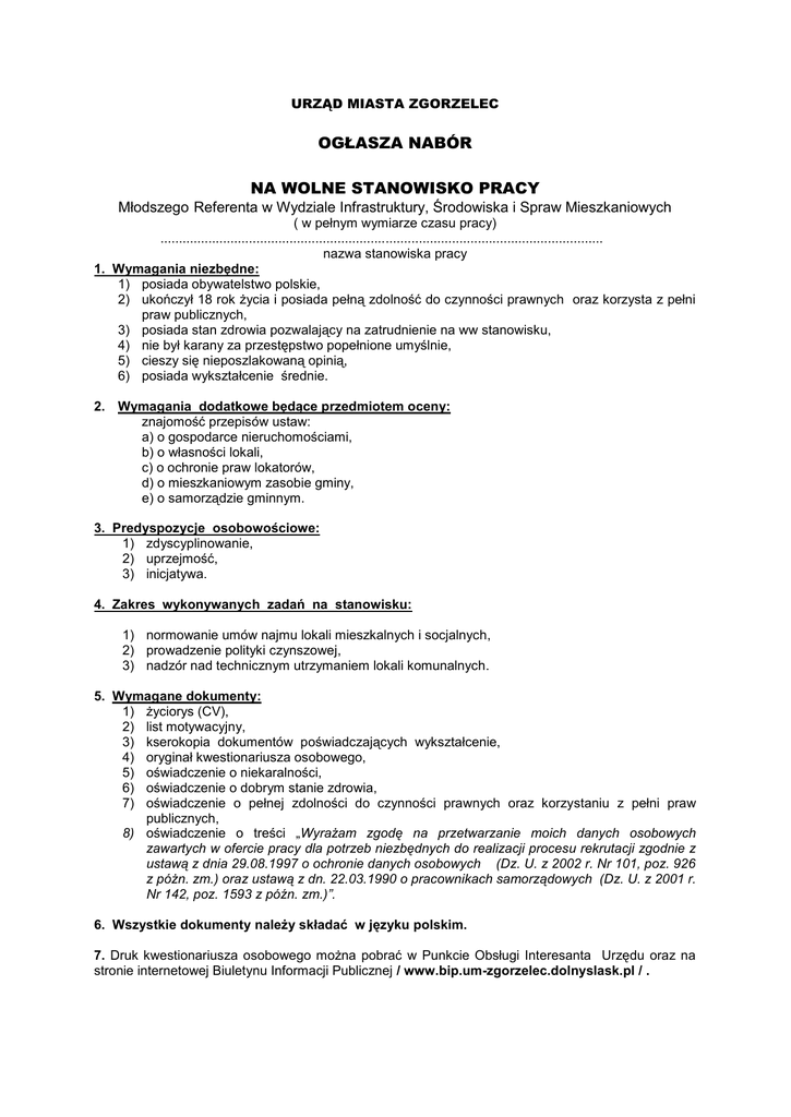 URZĄD MIASTA ZGORZELEC OGŁASZA NABÓR NA WOLNE STANOWISKO PRACY Młodszego Referenta w Wydziale Infrastruktury, Środowiska i Spraw Mieszkaniowych ( w pełnym wymiarze czasu pracy) ........................................................................................................................ nazwa stanowiska pracy 1. Wymagania niezbędne: 1) posiada obywatelstwo polskie, 2) ukończył 18 rok życia i posiada pełną zdolność do czynności prawnych oraz korzysta z pełni praw publicznych, 3) posiada stan zdrowia pozwalający na zatrudnienie na ww stanowisku, 4) nie był karany za przestępstwo popełnione umyślnie, 5) cieszy się nieposzlakowaną opinią, 6) posiada wykształcenie średnie. 2. Wymagania dodatkowe będące przedmiotem oceny: znajomość przepisów ustaw: a) o gospodarce nieruchomościami, b) o własności lokali, c) o ochronie praw lokatorów, d) o mieszkaniowym zasobie gminy, e) o samorządzie gminnym. 3. Predyspozycje osobowościowe: 1) zdyscyplinowanie, 2) uprzejmość, 3) inicjatywa. 4. Zakres wykonywanych zadań na stanowisku: 1) normowanie umów najmu lokali mieszkalnych i socjalnych, 2) prowadzenie polityki czynszowej, 3) nadzór nad technicznym utrzymaniem lokali komunalnych. 5. Wymagane dokumenty: 1) życiorys (CV), 2) list motywacyjny, 3) kserokopia dokumentów poświadczających wykształcenie, 4) oryginał kwestionariusza osobowego, 5) oświadczenie o niekaralności, 6) oświadczenie o dobrym stanie zdrowia, 7) oświadczenie o pełnej zdolności do czynności prawnych oraz korzystaniu z pełni praw publicznych, 8) oświadczenie o treści „Wyrażam zgodę na przetwarzanie moich danych osobowych zawartych w ofercie pracy dla potrzeb niezbędnych do realizacji procesu rekrutacji zgodnie z ustawą z dnia 29.08.1997 o ochronie danych osobowych (Dz. U. z 2002 r. Nr 101, poz. 926 z póżn. zm.) oraz ustawą z dn. 22.03.1990 o pracownikach samorządowych (Dz. U. z 2001 r. Nr 142, poz. 1593 z późn. zm.)”. 6. Wszystkie dokumenty należy składać w języku polskim. 7. Druk kwestionariusza osobowego można pobrać w Punkcie Obsługi Interesanta Urzędu oraz na stronie internetowej Biuletynu Informacji Publicznej / www.bip.um-zgorzelec.dolnyslask.pl / . 8.Wymagane dokumenty aplikacyjne należy składać osobiście w Punkcie Obsługi Interesanta Urzędu Miasta Zgorzelec w godzinach od 7.30 do 17.00 od poniedziałku do piątku lub pocztą na adres Urzędu( Urząd Miasta Zgorzelec ul. Domańskiego 7 59-900 Zgorzelec) . 9.Aplikacje złożone bezpośrednio, jak i przesłane pocztą winny być złożone w zaklejonej kopercie z dopiskiem: Dotyczy naboru na stanowisko młodszego referenta w Wydziale Infrastruktury, Środowiska i Spraw Mieszkaniowych 10. Aplikacje powinny być złożone w terminie do dnia 15 grudnia 2008 roku. 11. Aplikacje, które wpłyną do Urzędu po wyżej określonym terminie nie będą rozpatrywane. 12. W przypadku aplikacji przesłanych pocztą liczy się data stempla pocztowego. 13. Postępowanie składać się będzie z II etapów: I etap – wstępna selekcja kandydatów – złożone oferty poddane zostaną analizie mającej na celu porównanie danych zawartych w dokumentach aplikacyjnych z wymaganiami formalnymi określonymi w ogłoszeniu . Lista kandydatów, którzy spełnią wymagania formalne umieszczona będzie w Biuletynie Informacji Publicznej / www.bip.um-zgorzelec.dolnyslask.pl / . II etap – selekcja końcowa kandydatów test kwalifikacyjny lub/i rozmowa kwalifikacyjna podczas której sprawdzona będzie wiedza kandydatów na temat umiejętności zawodowych określonych w punkcie 2 niniejszego ogłoszenia. 14. O terminie i miejscu przeprowadzenia II etapu naboru osoby, które spełniły wymogi formalne zostaną powiadomione indywidualnie. Informacja o wyniku naboru będzie umieszczana na stronie internetowej Biuletynu Informacji Publicznej / www.bip.um-zgorzelec.dolnyslask.pl / oraz na tablicy informacyjnej Urzędu Miasta (przy ul. Warszawskiej w Zgorzelcu ).