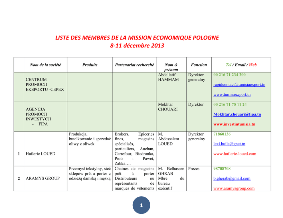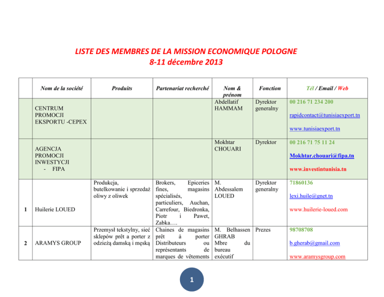 LISTE DES MEMBRES DE LA MISSION ECONOMIQUE POLOGNE 8-11 décembre 2013 Nom de la société Produits Partenariat recherché CENTRUM PROMOCJI EKSPORTU -CEPEX Nom & prénom Abdellatif HAMMAM Fonction Dyrektor generalny Tél / Email / Web 00 216 71 234 200 [email protected] www.tunisiaexport.tn Mokhtar CHOUARI AGENCJA PROMOCJI INWESTYCJI - FIPA 1 2 Huilerie LOUED ARAMYS GROUP Dyrektor 00 216 71 75 11 24 [email protected] www.investintunisia.tn Produkcja, Brokers, Epiceries butelkowanie i sprzedaż fines, magasins oliwy z oliwek spécialisés, particuliers, Auchan, Carrefour, Biedronka, Piotr i Pawet, Zabka…. Przemysł tekstylny, sieć Chaines de magasins sklepów prêt a porter z prêt à porter odzieżą damską i męską Distributeurs ou représentants de marques de vêtements 1 M. Abdessalem LOUED Dyrektor generalny 71860136 [email protected] www.huilerie-loued.com M. Belhassen Prezes GHRAB Mbre du bureau exécutif 98708708 [email protected] www.aramysgroup.com moyen / haut gamme et Luxe 3 Groupe Tunisien de UTICA. Pdt Fédération du Textile Chimique Nawozy chemiczne M. Ahmed Ben HLIMA 71454833 4 5 6 7 8 9 Agri Company DAOUD Business Konserwy SIDI (sardynki, tuńczyk) S.C.I.T Importateurs rybne conserves makrele, de M. Ezzedine Bellagha Prezes [email protected] www.sididaoud.com Mme. Dorsaf BELLAGHA Eksport artykułów Nouveaux contacts, M.Karim spożywczych i importateurs, Affaires MLAYAH materiałów de négoce budowlanych Obrazy w technice Décoration DES mozaiki, tradycyjne d'intérieurs, acheteurs dekoracje kamienne de produits en pierre et mosaïques Handel distributors and międzynarodowy, industriels of agrofood STE KONTESS import i eksport products and COMMERCE produktów construction materials INTERNATIONAL spożywczych i materiałów budowlanych JUGHURTA Eksport produktów Importers of agrofood COMMERCE spożywczych i products INTERNATIONAL materiałów budowlanych ARTS MOSAIQUES 2 Przedstawic 71950855 iel ds. sprzedaży [email protected] Mme. Atra Przedstawic IBRAHIMI iel firmy www.scitexport.com 26711690 [email protected] M. ZIED Gacem M. WALID BENSLIMEN M. SASSI Przedstawic Mohamed iel firmy Fradj 71317325 [email protected] www.jughurta.com.tn 10 Przetwórstwo owoców i Importers and M.CHATTI warzyw, przemysł exporters of agrofood FEHMI cukierniczy products M. CHATTI HELMI 98451659 [email protected] 11 CHATTI AGRO 12 CHO Oliwa z oliwek Euromed Distribution Odzież, zwłaszcza typu importers, wholesalers DENIM of ready to wear clothes 13 Automatyka 14 STE 3IA 15 Office National Thermalisme et l'Hydrothérapie du Termalizm, de tasaloterapia, spa M. Ali KALLEL [email protected] Bureau d’ingénierie, M. Intégrateurs Houssemeddin automatisme e EZZINA Hommes d’Affaires, M. Slahèddine Dyrektor Investisseurs dans le Mentacer generalny domaine thermal, Agences de voyage 71844566 [email protected] n www. thermalisme.nat.tn 16 17 Agence Tunisienne de Promotion des Agencja Promocji Investissements FIPA Inwestycji Zagranicznych Eksport owoców I Importers distributors Boussafara Trade warzyw wholesalers Compagny M.Mokhtar CHOUARI Abdelaziz BOUSSAFAR A M.Jamel 3 REKAYA 18 19 20 Ulysse Industries Produkcja Agro oliwek Abou Walid Group Iris Tours 21 TARSIM gmbh 22 BLEU VERT oliwy z Importers M. Raouf BOUGUERR A Produkcja oliwy z Les décideurs d’achat oliwek oraz dans la biomasse pour kosmetyków na jego les centrales bazie électriques appartenant au gouvernant polonais, les énergies renouvelables Biuro podróży, firma Tourisme de loisirs organizująca seminaria (agences de voyage et oraz kongresy TO) agences spécialisées en croisières tourisme des séminaires, de congrès, tourisme médical, associations Eksport produktów Importers of agrofood przetwórstwa products spożywczego do Europy Środkowej Eksport owoców morza Importation, contacts i ryb produits de la mer 4 M. Walid BEN Przedstawic AMOR iel firmy M. Jamel BEL Dyrektor HAJ YAHIA generalny M. Walid Dyrektor TARSIM generalny M. Mohamed Ali MTIR 23 24 25 26 27 GLOBE SERVICE Import/eksport, turystyka Abdelfattah GAIDA Prezes Mehdi MEFTAH Ceo 00 48 500 000 119 [email protected]/ www.bb-g.pl Mohamed Habib GLENZA Dyrektor generalny 00 48 504 584 155 [email protected] Sami BAKLOUTI PrezesDyrektor generalny 48 534 66 19 66 Majdi DEROUICHE PrezesDyrektor generalny 48 333 10 86 [email protected] Nassek ZAIDI Przedstawic 00 48 694 77 99 66 iel ds. sprzedaży [email protected] BRANDS Handel międzynarodowy CARTAGINA EXPORT-I MPORT L’OLIVIER M. Fourat Dyrektor HADDAD generalny TRAVEL SALSABIL BIG GROUP Turystyka Handel międzynarodowy Handel międzynarodowy, import/eksport 28 L’OLIVIER 29 XL ENERGY MARKETING Napoje energetyzujące Handel międzynarodowy, import/eksport 5 00 48 666 044 800 [email protected] [email protected]