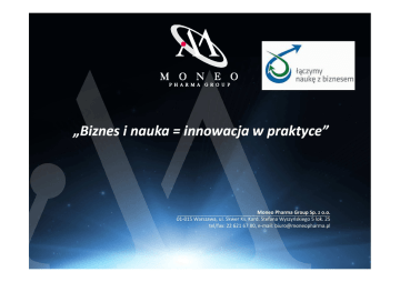 „Biznes i nauka = innowacja w praktyce” MONEO PHARMA GROUP - kim jesteśmy? Moneo Pharma Group jest firmą powstałą w 2007 roku, która rozpoczęła swoją działalność od organizacji wieloośrodkowych nieinterwencyjnych programów badawczych, przygotowywaniu i wdrażaniu strategii sprzedażowo - marketingowych dla sektora farmaceutycznego Realizujemy działania w zakresie prowadzenia badań klinicznych, obsługi pharmacovigilance oraz rejestracji produktów leczniczych Przez sześć lat dynamicznego rozwoju firma poszerzyła swoją działalność o implementację na rynku krajowym oraz zagranicznym innowacyjnych technologii medycznych Nauka & Business – czy to możliwe? MONEO PHARMA GROUP – import know - how Partnerzy Naukowi i Centra Badawcze: Śląski Uniwersytet Medyczny - Katowice Uniwersytet Mikołaja Kopernika – Toruń/Bydgoszcz Instytut Farmaceutyczny - Warszawa Evestra R&D Center - San Antonio, US Texas Institute of Biotechnology Education and Research – Houston, US Nauka & Business – import know -how Kontakt z jednostkami naukowo-badawczymi: wdrożenie know-how w zakresie innowacyjnych rozwiązań terapeutycznych: • innowacyjne technologie produkcji • nowe molekuły koncentracja na leczeniu chorób centralnego układu nerwowego, chorób nowotworowych & tzw. women health „Telemedycyna w psychiatrii” - stworzenie innowacyjnej platformy bezpośredniej komunikacji lekarz – pacjent Nauka & Business – „Mapa Drogowa” Nauka & Business - MODEL PSI POTENCJAŁ: znajomość rynków, analiza i synteza danych, identyfikacja możliwości i potencjału SYNERGIA: czerpanie z zasobów wiedzy i doświadczeń jednostek naukowo-badawczych, ich know-how oraz potencjału ludzkiego, jest kluczem do osiągnięcia sukcesu komercyjnego IMPLEMENTACJA: najlepszym przykładem, że „Biznes i nauka = innowacja w praktyce”, to projekt budowy trzeciego w Europie Zakładu Produkcyjnego leków cytotoksycznych na bazie technologii produkcji Instytutu Farmaceutycznego MONEO PHARMA GROUP – INNOWACJA W PRAKTYCE WE ARE ONE TEAM WITH YOU, WE BUILD THE FUTURE TOGETHER WE ARE READY TO SERVE YOU THE BEST.