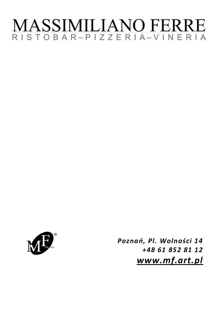 Poznań, Pl. Wolności 14 +48 61 852 81 12 www.mf.art.pl PIZZA 1. Margherita 14,00 sos pomidorowy, mozzarella 2. Funghi 16,00 sos pomidorowy, mozzarella, pieczarki 3. Capriciosa sos pomidorowy, mozzarella, pieczarki, szynka 4. Prosciutto cotto sos pomidorowy, mozzarella, szynka gotowana 5. Prosciutto crudo sos pomidorowy, mozzarella, szynka wędzona 6. Prosciutto e funghi sos pomidorowy, mozzarella, szynka gotow., pieczarki, cebula 7. Peperoni sos pomidorowy, mozzarella, salami, peperoni, cebula 8. Quattro fromaggi sos pomidorowy, mozzarella, gorgonzola, parmezan, camembert 9. Quattro stagioni sos pomidorowy, mozzarella, pieczarki, szynka, karczochy, zielone oliwki 10. Tonno sos pomidorowy, mozzarella, tuńczyk 11. Tonno e cipolla sos pomidorowy, mozzarella, tuńczyk, cebula, kapary 12. Cantadina sos, mozzarella, szynka, pieczarki, anchois, kapary, karczochy, oliwki 13. Diavola sos pomidorowy, mozzarella, kabanosy, salami, szynka, kapary, cebula 14. Marinara sos pomidorowy, mozzarella, owoce morza, mule 15. Gambaretti sos pomidorowy, mozzarella, krewetki, scampi 19,00 19,00 19,00 20,00 21,00 24,00 24,00 19,00 20,00 20,00 24,00 24,00 25,00 16. Zarina sos pom., mozzarella, wędzony łosoś, krewetki, szczypior, śmietana 17. Hawai sos pomidorowy, mozzarella, pieczarki, szynka, ananas 18. Dosutto sos pomidorowy, mozzarella, szynka parmeńska, rucola 19. Rucola sos pomidorowy, mozzarella, rucola 20. Bolognese sos bolognese, mozzarella 21. Farmerska sos pomidorowy, mozzarella, kurczak, pieczarki, kukurydza, curry 22. Spinaci sos pomidorowy, mozzarella, szpinak, jajko 23. Rustica sos pomidorowy, mozzarella, pieczarki, bekon, jajko, cebula 24. Rzeźnicka sos pomidorowy, mozzarella, szynka, kabanos, salami, cebula 25. Wegetariana sos pomidorowy, mozzarella, pomidor, brokuł, papryka, karczochy, pieczarki, cebula 29,00 23,00 28,00 19,00 19,00 24,00 19,00 25,00 27,00 25,00 Dodatki do pizzy: Cebula, czosnek, papryka, pieczarki, kukurydza, pomidory, sos Wędliny, mięso, szynka gotow., ser Szynka parmeńska, karczochy, kapary, anchois Ryby, owoce morza, scampi 3,00 6,00 8,00 11,00