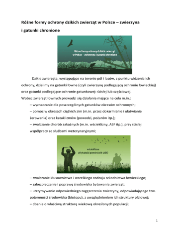 Różne formy ochrony dzikich zwierząt w Polsce – zwierzyna i gatunki chronione Dzikie zwierzęta, występujące na terenie pól i lasów, z punktu widzenia ich ochrony, dzielimy na gatunki łowne (czyli zwierzynę podlegającą ochronie łowieckiej) oraz gatunki podlegające ochronie gatunkowej: ścisłej lub częściowej. Wobec zwierząt łownych prowadzi się działania mające na celu m.in.: – wyznaczanie dla poszczególnych gatunków okresów ochronnych; – pomoc w okresach ciężkich zim (m.in. przez dokarmianie i ułatwianie żerowania) oraz kataklizmów (powodzi, pożarów itp.); – zwalczanie chorób zakaźnych (m.in. wścieklizny, ASF itp.), przy ścisłej współpracy ze służbami weterynaryjnymi; – zwalczanie kłusownictwa i wszelkiego rodzaju szkodnictwa łowieckiego; – zabezpieczanie i poprawę środowiska bytowania zwierząt; – utrzymywanie odpowiedniego zagęszczenia zwierzyny, odpowiadającego tzw. pojemności środowiska (biotopu), z uwzględnieniem ich struktury płciowej; – dbanie o właściwą strukturę wiekową określonych populacji; 1 – stałe monitorowanie ich oddziaływania na działalność człowieka w rolnictwie, leśnictwie i rybactwie, a także obserwowanie i przeciwdziałanie niekorzystnym wpływom działalności człowieka na zwierzynę i środowisko jej bytowania (budowa dróg, melioracje, intensyfikacja rolnictwa itp.). W Polsce poluje się obecnie na 31 gatunków zwierząt. Listę zwierząt łownych i okresy polowań określa minister właściwy do spraw środowiska w porozumieniu z ministrem właściwym ds. rolnictwa oraz po zasięgnięciu opinii Państwowej Rady Ochrony Przyrody oraz Polskiego Związku Łowieckiego. Wśród gatunków łownych znajdują się zarówno zwierzęta o stabilnych populacjach (odpowiednio licznych dla właściwego ich funkcjonowania w środowisku naturalnym, jak jelenie, daniele i łosie), zwierzęta, których liczebność w ostatnich dekadach wyraźnie wzrosła, stając się przyczyną poważnych niekiedy kłopotów gospodarczych i epizootycznych (jak lisy, czy dziki) oraz populacje niestabilne, których liczebność w ostatnich kilku dekadach wyraźnie spadła (jak np. zające i kuropatwy). Myśliwi muszą więc wykorzystywać wszelkie dopuszczane prawem metody, by kontrolować, bądź ograniczać liczebność niektórych gatunków (m.in. przez stałe podwyższanie wielkości odstrzałów i odpowiednie modelowanie struktury populacji). Z drugiej strony podejmowane są działania odwrotne, polegające na ograniczeniu odstrzału (a niekiedy wręcz jego całkowitym wstrzymaniu) i uruchomieniu programów restytucji tych gatunków obejmujących poprawę środowiska ich bytowania, wsiedlenia, a w skrajnych sytuacjach reintrodukcje zwierząt. Wszystko to świadczy o dynamicznych zmianach w populacjach zwierząt łownych i w środowisku ich bytowania, które muszą być przez myśliwych stale monitorowane, by reagować na nie w odpowiedni sposób i w odpowiednim czasie. Podział zwierzyny w łowiectwie wynika z uwarunkowań kulturowych, systematyki zwierząt, ich znaczenia dla działalności człowieka i w łowiectwie. Kryteria te znalazły odzwierciedlenie w aktach prawnych regulujących funkcjonowanie łowiectwa w Polsce. W rozporządzeniu ministra środowiska w sprawie ustalenia listy gatunków zwierząt łownych mówi się o zwierzynie grubej 2 i drobnej. Wśród zwierzyny grubej wyróżnia się zwierzynę płową, czyli gatunki z rodziny jeleniowatych (łoś, jeleń szlachetny, daniel, sarna i pochodzący z dalekiej Azji jeleń sika) – i zwierzynę czarną czyli dzika i muflona – przedstawiciela rodziny pustorogich, który do Europy przybył w II połowie XVII wieku, a do Polski przywędrował w pierwszych latach XX wieku. Do zwierzyny drobnej – poza zającem, kuropatwą, bażantem, dzikimi kaczkami – zalicza się m.in. gatunki drapieżne: lisa, jenota, borsuka, kunę leśną, kunę domową, norkę amerykańską, tchórza zwyczajnego i szopa pracza. Wśród 24 gatunków zwierzyny drobnej znajdziemy dwóch przedstawicieli rodziny psowatych: rodzimego lisa i jenota, przybysza z Azji Wschodniej i jedynego przedstawiciela tej rodziny zapadającego w sen zimowy. Liczną grupę stanowią gatunki z rodziny łasicowatych: borsuk (największy reprezentant tej rodziny w krajowej faunie, który na zimę zasypia w swojej norze), a także kuna leśna i kuna domowa, tchórz zwyczajny oraz norka amerykańska (gatunek obcy naszej faunie, który w latach 80. i 90. minionego wieku zdziesiątkował populacje ptactwa wodno-błotnego w naszym kraju). Zwierzynę drobną stanowią również dwaj przybysze zza oceanu: piżmak i szop pracz (kolejny po jenocie i norce amerykańskiej obcy naszej faunie gatunek drapieżny, zagrażający rodzimym populacjom dzikich zwierząt w Polsce i w wielu krajach Europy). Do zwierzyny drobnej zaliczają się również dwaj przedstawiciele rodziny zającowatych: dziki królik i zając szarak, który z kuropatwą przez ostatnie stulecia aż do lat 80. XX w., należał do najliczniejszych gatunków zwierzyny w Polsce i wielu krajach Europy. Powszechnie uważa się, że za katastrofalny spadek liczebności tych charakterystycznych dla środowiska rolniczego gatunków odpowiadają ogromne przeobrażenia w rolnictwie, jakie zaszły w ostatnim półwieczu. 3 Ze środowiskiem rolniczym związane są także tzw. kuraki polne – bażant i kuropatwa. W przeciwieństwie do poligamicznych bażantów, kuropatwa jest gatunkiem monogamicznym. U bażanta dostrzegamy wyraźny dymorfizm płciowy w okresie, w którym samiec nosi upierzenie godowe, natomiast u kuropatwy jest on zdecydowanie słabiej zaznaczony (u samców tego gatunku na piersiach występuje charakterystyczna ciemno brunatna podkowa). Znacznie słabszy dymorfizm płciowy cechuje ptactwo łowne związane ze środowiskiem leśnym – migrujące słonki i gołębie grzywacze oraz jarząbka (przedstawiciela tzw. kuraków leśnych). Do gatunków zw