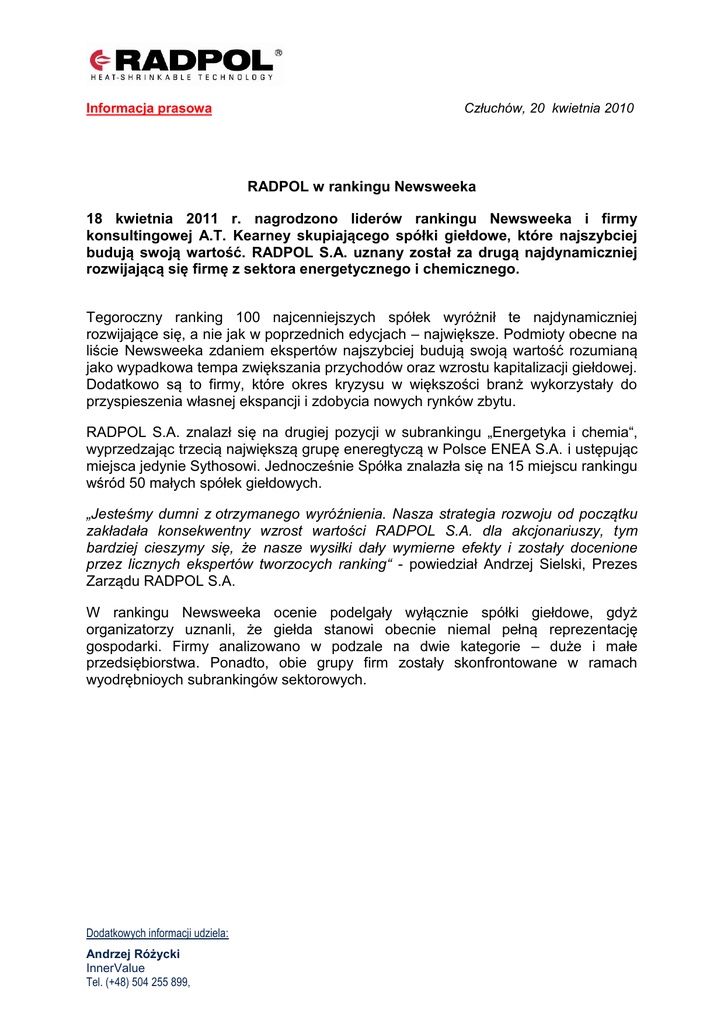 Informacja prasowa Człuchów, 20 kwietnia 2010 RADPOL w rankingu Newsweeka 18 kwietnia 2011 r. nagrodzono liderów rankingu Newsweeka i firmy konsultingowej A.T. Kearney skupiającego spółki giełdowe, które najszybciej budują swoją wartość. RADPOL S.A. uznany został za drugą najdynamiczniej rozwijającą się firmę z sektora energetycznego i chemicznego. Tegoroczny ranking 100 najcenniejszych spółek wyróżnił te najdynamiczniej rozwijające się, a nie jak w poprzednich edycjach – największe. Podmioty obecne na liście Newsweeka zdaniem ekspertów najszybciej budują swoją wartość rozumianą jako wypadkowa tempa zwiększania przychodów oraz wzrostu kapitalizacji giełdowej. Dodatkowo są to firmy, które okres kryzysu w większości branż wykorzystały do przyspieszenia własnej ekspancji i zdobycia nowych rynków zbytu. RADPOL S.A. znalazł się na drugiej pozycji w subrankingu „Energetyka i chemia“, wyprzedzając trzecią największą grupę eneregtyczą w Polsce ENEA S.A. i ustępując miejsca jedynie Sythosowi. Jednocześnie Spółka znalazła się na 15 miejscu rankingu wśród 50 małych spółek giełdowych. „Jesteśmy dumni z otrzymanego wyróźnienia. Nasza strategia rozwoju od początku zakładała konsekwentny wzrost wartości RADPOL S.A. dla akcjonariuszy, tym bardziej cieszymy się, że nasze wysiłki dały wymierne efekty i zostały docenione przez licznych ekspertów tworzocych ranking“ - powiedział Andrzej Sielski, Prezes Zarządu RADPOL S.A. W rankingu Newsweeka ocenie podelgały wyłącznie spółki giełdowe, gdyż organizatorzy uznanli, że giełda stanowi obecnie niemal pełną reprezentację gospodarki. Firmy analizowano w podzale na dwie kategorie – duże i małe przedsiębiorstwa. Ponadto, obie grupy firm zostały skonfrontowane w ramach wyodrębnioych subrankingów sektorowych. Dodatkowych informacji udziela: Andrzej Różycki InnerValue Tel. (+48) 504 255 899, Informacje o firmie: RADPOL SA jest liderem na rynku wyrobów termokurczliwych. Produkty RADPOL SA znajdują zastosowanie przede wszystkim w energetyce, elektronice, AGD, telekomunikacji, branży ciepłowniczej i motoryzacyjnej. Firma – jako jedyna w Polsce – posiada akceleratory elektronowe wykorzystywane na skalę przemysłową o energii 2,5 MeV i 4,5 MeV stosowane w technologii sieciowania radiacyjnego do produkcji wyrobów termokurczliwych. Spółka RADPOL prowadzi działalność produkcyjną w oparciu o wymagania normy ISO 9001:2008. Od roku 2005 firma posiada certyfikat ISO 14001:2004 dotyczący zagadnień związanych z ochroną środowiska naturalnego. RADPOL prowadzi ewidencję odpadów produkcyjnych, a także zawarł umowę z Organizacją Odzysku Biosystem Kraków w celu zapewnienia wymaganego poziomu recyklingu. Wysoka jakość produktów firmy RADPOL potwierdzona jest prestiżowymi nagrodami. W lutym 2008 roku RADPOL otrzymał m.in. główną nagrodę Ministerstwa Gospodarki w konkursie na „Najlepiej rozwijającą się firmę w sektorze Małych i Średnich Przedsiębiorstw”. Spółka otrzymała również specjalne wyróżnienie za tworzenie nowych miejsc pracy. W tym samym roku RADPOL odebrał nagrodę Pomorskiego Lidera Innowacji 2007 oraz Gazelę Biznesu 2007. Wśród nagród zdobytych przez spółkę w 2005 roku znajdują się: Certyfikat Rozważna Firma, Gazele Biznesu, Rzetelny Partner Biznesowy. W roku 2004 RADPOL został zaliczony do najprężniej rozwijających się przedsiębiorstw w Polsce w rankingu Gazel Biznesu oraz otrzymał nagrodę Hit Pomorza w kategorii produkcja - za gamę wyrobów termokurczliwych z usieciowanego radiacyjnie polietylenu. www.radpol.com.pl Dodatkowych informacji udziela: Andrzej Różycki InnerValue Tel. (+48) 504 255 899,