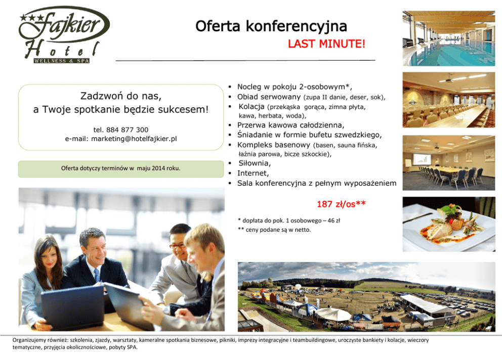 Oferta konferencyjna LAST MINUTE! Zadzwoń do nas, a Twoje spotkanie będzie sukcesem! tel. 884 877 300 e-mail: [email protected] Nocleg w pokoju 2-osobowym*, Obiad serwowany (zupa II danie, deser, sok), Kolacja (przekąska gorąca, zimna płyta, kawa, herbata, woda), Przerwa kawowa całodzienna, Śniadanie w formie bufetu szwedzkiego, Kompleks basenowy (basen, sauna fińska, łaźnia parowa, bicze szkockie), Oferta dotyczy terminów w maju 2014 roku. Siłownia, Internet, Sala konferencyjna z pełnym wyposażeniem 187 zł/os** * dopłata do pok. 1 osobowego – 46 zł ** ceny podane są w netto. Organizujemy również: szkolenia, zjazdy, warsztaty, kameralne spotkania biznesowe, pikniki, imprezy integracyjne i teambuildingowe, uroczyste bankiety i kolacje, wieczory tematyczne, przyjęcia okolicznościowe, pobyty SPA.