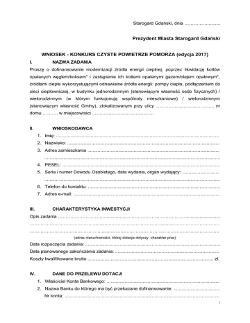 Starogard Gdański, dnia …………….......... Prezydent Miasta Starogard Gdański WNIOSEK - KONKURS CZYSTE POWIETRZE POMORZA (edycja 2017) I. NAZWA ZADANIA Proszę o dofinansowanie modernizacji źródła energii cieplnej, poprzez likwidację kotłów opalanych węglem/koksem* i zastąpienie ich kotłami opalanymi gazem/olejem opałowym*, źródłami ciepła wykorzystującymi odnawialne źródła energii: pompy ciepła, podłączeniem do sieci ciepłowniczej, w budynku jednorodzinnym (stanowiącym własność osób fizycznych) / wielorodzinnym (w którym funkcjonują wspólnoty mieszkaniowe) / wielorodzinnym (stanowiącym własność Gminy), zlokalizowanym przy ulicy …………...................…........ nr domu ………. w miejscowości ................................................ II. WNIOSKODAWCA 1. Imię: ............................................................................................................................... 2. Nazwisko: ....................................................................................................................... 3. Adres zamieszkania ....................................................................................................... ......................................................................................................................................... 4. PESEL: ........................................................................................................................... 5. Seria i numer Dowodu Osobistego, data wydania, organ wydający: ............................. ......................................................................................................................................... 6. Telefon do kontaktu: ....................................................................................................... 7. Adres e-mail: .................................................................................................................. III. CHARAKTERYSTYKA INWESTYCJI Opis zadania ………………………….............……………………………………........................... ……………………………………............……………………………..........………………………… ……………………………………….............…………………………..…….……………………….. (adres nieruchomości, której dotacja dotyczy, charakter prac) Data rozpoczęcia zadania: ......................................................................................................... Data planowanego zakończenia zadania: ................................................................................. Koszty kwalifikowane brutto .................................................................................................. zł. IV. DANE DO PRZELEWU DOTACJI 1. Właściciel Konta Bankowego: ........................................................................................ 2. Nazwa Banku do którego ma być przekazane dofinansowanie: .................................... Nr konta: ......................................................................................................................... 1 V. PLANOWANY ZBIORCZY EFEKT EKOLOGICZNY Przed modernizacją rodzaj węgiel Po modernizacji koks gaz ziemny olej opałowy Paliwo podłączenie do m.s.c (węzły cieplne) kotłowni powyżej 50MW 2) roczne zużycie [Mg, Nm3, GJ] 1) pompa ciepła X Moc nominalna (kW) Ilość źródeł ciepła ogółem wartość w GJ dla podłączenia do miejskiej sieci ciepłowniczej, w Nm 3 dla gazu ziemnego, w Mg dla pozostałych przypadków 1) 2) wypełniać w przypadku podłączenia do kotłowni o mocy powyżej 50MW VI. OŚWIADCZENIE WNIOSKODAWCY 1) Oświadczam, że jestem właścicielem/współwłaścicielem* w/w budynku mieszkalnego jednorodzinnego/wielorodzinnego. 2) Wyrażam zgodę na przeprowadzenie oględzin w moim budynku przez przedstawicieli Urzędu Miasta Starogard Gdański na każdym etapie realizacji wniosku. 3) Wyrażam zgodę na przetwarzanie moich danych osobowych dla potrzeb Urzędu Miasta Starogard Gdański. 4) Oświadczam, że wyrażam zgodę na bezpłatne wykorzystanie zdjęć przedstawiających piec węglowy, nowy piec gazowy/olejowy, węzeł cieplny, pompę ciepła, w celach promocyjnych. 5) Oświadczam, że w/w prace budowlane zostaną wykonane zgodnie z przepisami prawa budowlanego (zgłoszenie wykonywania robót lub pozwolenie na budowę). …………………………………………………… (imię i nazwisko wnioskodawcy) * niepotrzebne skreślić Do wniosku dołączam: 1. Kopię aktualnego dokumentu potwierdzającego tytuł prawny do budynku lub lokalu mieszkalnego, w którym usytuowane jest modernizowane źródło ogrzewania (akt notarialny, odpis z księgi wieczystej). 2. W przypadku współwłaścicieli budynku lub lokalu mieszkalnego należy załączyć pisemną zgodę współwłaścicieli na realizację inwestycji. 3. Dokumentacja fotograficzna stanu istniejącego. 2