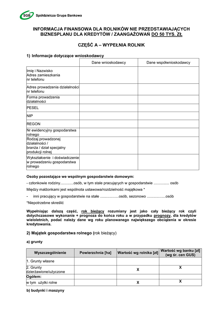 INFORMACJA FINANSOWA DLA ROLNIKÓW NIE PRZEDSTAWIAJĄCYCH BIZNESPLANU DLA KREDYTÓW / ZAANGAŻOWAŃ DO 50 TYS. ZŁ CZĘŚĆ A – WYPEŁNIA ROLNIK 1) Informacje dotyczące wnioskodawcy Dane współwnioskodawcy Dane wnioskodawcy Imię i Nazwisko Adres zamieszkania nr telefonu Adres prowadzenia działalności nr telefonu Forma prowadzenia działalności PESEL NIP REGON Nr ewidencyjny gospodarstwa rolnego Rodzaj prowadzonej działalności / branża / dział specjalny produkcji rolnej Wykształcenie i doświadczenie w prowadzeniu gospodarstwa rolnego Osoby pozostające we wspólnym gospodarstwie domowym: - członkowie rodziny.............osób, w tym stale pracujących w gospodarstwie ............... osób Między małżonkami jest wspólnota ustawowa/rozdzielność majątkowa * - inni pracujący w gospodarstwie na stałe ..................osób, sezonowo ..................osób *Niepotrzebne skreślić Wypełniając dalszą część, rok bieżący rozumiany jest jako cały bieżący rok czyli dotychczasowe wykonanie + prognoza do końca roku a w przypadku prognozy, dla kredytów wieloletnich, podać należy dane wg roku planowanego największego obciążenia w okresie kredytowania. 2) Majątek gospodarstwa rolnego (rok bieżący) a) grunty Wyszczególnienie Powierzchnia [ha] Wartość wg rolnika [zł] Wartość wg banku [zł] (wg śr. cen GUS) 1. Grunty własne 2. Grunty dzierżawione/użyczone Ogółem: w tym użytki rolne b) budynki i maszyny X X X X Wyszczególnienie Wartość w zł (podać wg czego określono wartość np. wg polisy, rzeczoznawcy itp.) Budynki w tym mieszkalny: Maszyny i urządzenia w tym samochód/-chody osobowe: c) inwentarz żywy Wyszczególnienie ( wymienić zwierzęta wg rodzajów) Ilość (w szt.) Wielkości aktualne Wartość w zł Stado podstawowe: Stado obrotowe: Razem X d) pozostały majątek ( wymienić rodzaj i wartość) Wyszczególnienie Należności Zapasy Produkcja roślinna w toku Gotówka Lokaty Inne Wartość w zł + ewentualny komentarz 3) Planowane przedsięwzięcie inwestycyjne Dla kredytów unijnych Elementy inwestycji RAZEM Udział % 1 Koszt całkowity inwestycji 1 brutto/netto Środki własne Kredyt/Kredyt Koszty unijny kwalifikowane Dotacja 100% Niepotrzebne skreślić, wartość netto dla płatników podatku VAT, wartość brutto dla pozostałych podmiotów. 2 Termin realizacji 4) Prowadzona produkcja a) Produkcja zwierzęca Wyszczególnienie Rok ubiegły Rok bieżący (wartości faktycznie osiągnięte) ( wartości prognozowane do osiągnięcia) Wartość /zł/ ilość cena Wartość /zł/ A. Sprzedaż produkcji zwierzęcej (wymienić poniżej) RAZEM SPRZEDAŻ B. Koszty produkcji zwierzęcej Zakup zwierząt ……………………. Zakup pasz Koszty weterynaryjne Pozostałe koszty RAZEM KOSZTY Dochód z produkcji zwierzęcej (A - B) b) Produkcja roślinna Wyszczególnienie x x x x x x x x Rok ubiegły Rok bieżący (wartości faktycznie osiągnięte) Wartość** /zł/ ( wartości prognozowane do osiągnięcia) ilość cena A. Struktura zasiewów i sprzedaż produkcji roślinnej (wymienić poniżej) RAZEM SPRZEDAŻ B. Koszty produkcji roślinnej Zakup nasion Zakup nawozów mineralnych Zakup środków ochrony roślin Pozostałe koszty RAZEM KOSZTY Dochód z produkcji roślinnej (A - B) **Wartość „0” jeśli produkcja na paszę x x x x x x x x x x 5) Pozostałe przychody: Rodzaj Rok ubiegły /zł/ Rok bieżący /zł/ Dopłaty bezpośrednie Przychody spoza gospodarstwa Inne ……………………… RAZEM 3 Wartość ** /zł/ 6) Pozostałe koszty Rok ubiegły /zł/ Rodzaj Rok bieżący /zł/ Koszty pośrednie Koszty utrzymania rodziny Suma rat i odsetek wcześniej zaciągniętych kredytów Inne ……………………… RAZEM Oświadczam(y), iż: 1) w okresie kredytowania nie zamierzam/y radykalnie zmieniać produkcji rolnej toteż przyszłe wyniki finansowe powinny być podobne do osiągniętych przez/e mnie/nas w okresach wykazanych wyżej. 2) gospodarstwo spełnia/nie spełnia* kryteria ubiegania się o dopłaty bezpośrednie w tym dobrej kultury rolnej, ochrony środowiska oraz identyfikacji i rejestracji zwierząt. *Niepotrzebne skreślić Oświadczam/y pod rygorem odpowiedzialności przewidzianej w art. 297 Kodeksu karnego (Dz. U. 1997 r. Nr 88, poz. 553, z późn. zm.), że informacje podane w niniejszym dokumencie są prawdziwe. , miejscowość, data pieczęć i podpis Wnioskodawcy/-ów 4 CZĘŚĆ B - WYPEŁNIA BANK BILANS MAJĄTKOWY (rok bieżący) Wyszczególnienie A. Aktywa trwałe B. Aktywa obrotowe C. Kapitał własny (A+B-D) D. Zobowiązania Suma bilansowa (A+B) /zł/ Udział kapitału własnego w finansowaniu (kapitał własny/sumy bilansowej) - _____________%. EKONOMICZNA ZDOLNOŚĆ DO SPŁATY ZOBOWIĄZAŃ FINANSOWYCH: Wyszczególnienie Rok ubiegły zł/tys. zł* Rok bieżący zł/tys. zł* Wartość średnia zł/tys. zł* A. Przychody z gospodarstwa B. Koszty C. Dochód z gospodarstwa (A-B) F. Przychody spoza gospodarstwa H. Koszty utrzymania rodziny I. Dochód dyspozycyjny rolnika (E+F-G-H) J. Kwota rocznych rat i odsetek od wcześniej zaciągniętych kredytów K. Kwota rocznych rat i odsetek od wnioskowanego kredytu** Należy wskazać roczne obciążenie dochodu wynikające z wcześniej zaciągniętych kredytów Różnica pomiędzy: wartością średnią dochodu dyspozycyjnego rolnika a sumą obciążeń rocznych wynikających z wcześniej zaciągniętych zobowiązań i nowo wnioskowanego kredytu jest dodatnia TAK* NIE* Klient posiada ekonomiczną zdolność kredytową do spłaty wnioskowanego kredytu Klient nie posiada ekonomicznej zdolności do spłaty wnioskowanego kredytu *niepotrzebne skreślić ** w przypadku, gdy wnioskowany kredyt będzie podlegał zapisom Rekomendacji S wówczas kwotę rocznych odsetek należy wyliczyć powiększając wysokość oprocentowania o 2,0 punkty procentowe. Uwaga: „Kwota rocznych rat i odsetek od wnioskowanego kredytu” w przypadku kredytu obrotowego jest: a) w odniesieniu do kl