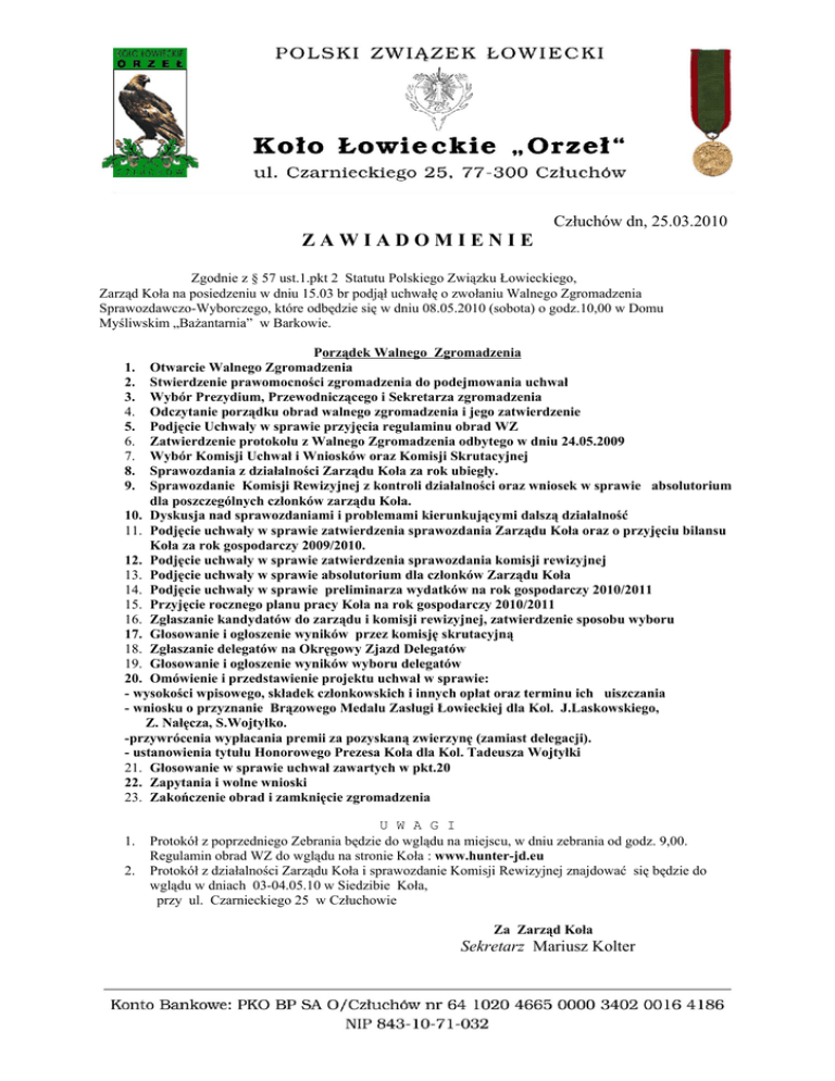 Człuchów dn, 25.03.2010 ZAWIADOMIENIE Zgodnie z § 57 ust.1.pkt 2 Statutu Polskiego Związku Łowieckiego, Zarząd Koła na posiedzeniu w dniu 15.03 br podjął uchwałę o zwołaniu Walnego Zgromadzenia Sprawozdawczo-Wyborczego, które odbędzie się w dniu 08.05.2010 (sobota) o godz.10,00 w Domu Myśliwskim „Bażantarnia” w Barkowie. Porządek Walnego Zgromadzenia Otwarcie Walnego Zgromadzenia Stwierdzenie prawomocności zgromadzenia do podejmowania uchwał Wybór Prezydium, Przewodniczącego i Sekretarza zgromadzenia Odczytanie porządku obrad walnego zgromadzenia i jego zatwierdzenie Podjęcie Uchwały w sprawie przyjęcia regulaminu obrad WZ Zatwierdzenie protokołu z Walnego Zgromadzenia odbytego w dniu 24.05.2009 Wybór Komisji Uchwał i Wniosków oraz Komisji Skrutacyjnej Sprawozdania z działalności Zarządu Koła za rok ubiegły. Sprawozdanie Komisji Rewizyjnej z kontroli działalności oraz wniosek w sprawie absolutorium dla poszczególnych członków zarządu Koła. 10. Dyskusja nad sprawozdaniami i problemami kierunkującymi dalszą działalność 11. Podjęcie uchwały w sprawie zatwierdzenia sprawozdania Zarządu Koła oraz o przyjęciu bilansu Koła za rok gospodarczy 2009/2010. 12. Podjęcie uchwały w sprawie zatwierdzenia sprawozdania komisji rewizyjnej 13. Podjęcie uchwały w sprawie absolutorium dla członków Zarządu Koła 14. Podjęcie uchwały w sprawie preliminarza wydatków na rok gospodarczy 2010/2011 15. Przyjęcie rocznego planu pracy Koła na rok gospodarczy 2010/2011 16. Zgłaszanie kandydatów do zarządu i komisji rewizyjnej, zatwierdzenie sposobu wyboru 17. Głosowanie i ogłoszenie wyników przez komisję skrutacyjną 18. Zgłaszanie delegatów na Okręgowy Zjazd Delegatów 19. Głosowanie i ogłoszenie wyników wyboru delegatów 20. Omówienie i przedstawienie projektu uchwał w sprawie: - wysokości wpisowego, składek członkowskich i innych opłat oraz terminu ich uiszczania - wniosku o przyznanie Brązowego Medalu Zasługi Łowieckiej dla Kol. J.Laskowskiego, Z. Nałęcza, S.Wojtyłko. -przywrócenia wypłacania premii za pozyskaną zwierzynę (zamiast delegacji). - ustanowienia tytułu Honorowego Prezesa Koła dla Kol. Tadeusza Wojtyłki 21. Głosowanie w sprawie uchwał zawartych w pkt.20 22. Zapytania i wolne wnioski 23. Zakończenie obrad i zamknięcie zgromadzenia 1. 2. 3. 4. 5. 6. 7. 8. 9. 1. 2. U W A G I Protokół z poprzedniego Zebrania będzie do wglądu na miejscu, w dniu zebrania od godz. 9,00. Regulamin obrad WZ do wglądu na stronie Koła : www.hunter-jd.eu Protokół z działalności Zarządu Koła i sprawozdanie Komisji Rewizyjnej znajdować się będzie do wglądu w dniach 03-04.05.10 w Siedzibie Koła, przy ul. Czarnieckiego 25 w Człuchowie Za Zarząd Koła Sekretarz Mariusz Kolter