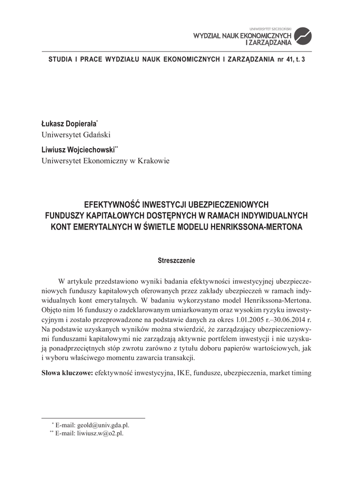 studia i prace wydziału nauk ekonomicznych i zarządzania nr 41, t. 3 Łukasz Dopierała* Uniwersytet Gdański Liwiusz Wojciechowski** Uniwersytet Ekonomiczny w Krakowie Efektywność inwestycji ubezpieczeniowych funduszy kapitałowych dostępnych w ramach indywidualnych kont emerytalnych w świetle modelu Henrikssona-Mertona Streszczenie W artykule przedstawiono wyniki badania efektywności inwestycyjnej ubezpieczeniowych funduszy kapitałowych oferowanych przez zakłady ubezpieczeń w ramach indywidualnych kont emerytalnych. W badaniu wykorzystano model Henrikssona-Mertona. Objęto nim 16 funduszy o zadeklarowanym umiarkowanym oraz wysokim ryzyku inwestycyjnym i zostało przeprowadzone na podstawie danych za okres 1.01.2005 r.–30.06.2014 r. Na podstawie uzyskanych wyników można stwierdzić, że zarządzający ubezpieczeniowymi funduszami kapitałowymi nie zarządzają aktywnie portfelem inwestycji i nie uzyskują ponadprzeciętnych stóp zwrotu zarówno z tytułu doboru papierów wartościowych, jak i wyboru właściwego momentu zawarcia transakcji. Słowa kluczowe: efektywność inwestycyjna, IKE, fundusze, ubezpieczenia, market timing * ** E-mail: [email protected]. E-mail: [email protected]. 56 Gospodarka regionalna i międzynarodowa Wprowadzenie Indywidualne konta emerytalne (IKE) to element polskiego systemu zabezpieczenia emerytalnego. Są one częścią tak zwanego trzeciego filaru emerytalnego, który działa na zasadzie dobrowolności. Pierwsze instytucje rozpoczęły prowadzenie IKE pod koniec 2004 r. Wśród podmiotów uprawnionych do tego typu działalności znalazły się między innymi zakłady ubezpieczeń na życie, które oferują ten produkt w postaci ubezpieczenia na życie z ubezpieczeniowym funduszem kapitałowym. Według stanu na 2015 r. jest to najpopularniejsza dobrowolna forma zabezpieczenia emerytalnego spośród form dostępnych w ramach trzeciego filaru. Głównym celem artykułu jest zbadanie efektywności inwestycyjnej ubezpieczeniowych funduszy kapitałowych oferowanych w ramach IKE w kontekście umiejętności wykorzystania trendów rynkowych oraz doboru papierów wartościowych przez zarządzających funduszami. Efektywność inwestycyjna dobrowolnych form zabezpieczenia emerytalnego jest ważnym zagadnieniem badawczym, szczególnie w świetle coraz niższej stopy zastąpienia w obowiązkowej części systemu emerytalnego. W badaniu zastosowano model market timing zaproponowany przez R.D. Henrikssona i R.C. Mertona1. Model ten pozwala zweryfikować tezę o osiąganiu przez zarządzających funduszami inwestycyjnymi stóp zwrotu przewyższających stopy portfeli wzorcowych. Jednocześnie możliwe jest przypisanie osiąganych wyników konkretnym umiejętnościom zarządzających. Badania obejmują okres od stycznia 2005 r. do czerwca 2014 r. i zostały przeprowadzone dla próby 16 funduszy o zadeklarowanym umiarkowanym i wysokim ryzyku inwestycyjnym, które jednocześnie deklarują aktywne zarządzanie portfelem inwestycyjnym. W artykule wykorzystano dane udostępniane przez towarzystwa ubezpieczeń, Komisję Nadzoru Finansowego oraz agencję Thomson Reuters. 1 R.D. Henriksson, R.C. Merton, On Market Timing and Investment Performance. II. Statistical Procedures for Evaluating Forecasting Skills, „Journal of Business” 1981, Vol. 54, No. 4, s. 513–533. Łukasz Dopierała, Liwiusz Wojciechowski Efektywność inwestycji ubezpieczeniowych funduszy kapitałowych... 1. Ubezpieczeniowe fundusze kapitałowe funkcjonujące w ramach IKE jako instrument gromadzenia oszczędności emerytalnych Początek rozwoju rynku IKE związany jest z wejściem w życie w 2004 r. Ustawy o indywidualnych kontach emerytalnych. W tym akcie prawnym określono zasady gromadzenia oszczędności na IKE, dokonywania wpłat oraz wypłat transferowych, a także wypłat i zwrotu środków zgromadzonych na tych kontach. Ustawa była kilka razy nowelizowana a jej obowiązującą w 2015 r. wersją jest Ustawa o indywidualnych kontach emerytalnych oraz indywidualnych kontach zabezpieczenia emerytalnego2. Z definicji IKE zawartej w ustawie wynika, że uprawnionymi do prowadzenia IKE są następujące rodzaje podmiotów: fundusze inwestycyjne, podmioty prowadzące działalność maklerską, banki, zakłady ubezpieczeń, dobrowolne fundusze emerytalne3. Osoba decydująca się gromadzić środki na emeryturę może posiadać tylko jedno IKE. Minister Pracy i Polityki Społecznej określa w obwieszczeniach maksymalny roczny limit wpłat na IKE. Od roku 2009 limit został ustalony na poziomie 300% przeciętnego miesięcznego wynagrodzenia i w 2015 r. wynosi 11 887 zł. W zamyśle ustawodawcy osoby chcące oszczędzać na emeryturę miały decydować się na wybór IKE między innymi ze względu na zwolnienie od podatku od zysków kapitałowych, które było związane z tym instrumentem4. W początkowej działalności, czyli w latach 2004–2007 rynek IKE rozwijał się dynamicznie. W 2007 roku było ponad 900 tys. kont. Globalny kryzys finansowy zahamował jednak tę tendencję. W latach 2007–2010 liczba prowadzonych IKE zaczęła wyraźnie maleć i zatrzymała się na poziomie około 800 tys. W latach 2011–2014 liczba prowadzonych kont była stabilna i wynosiła około 810 tys. Wśród IKE największą popularność zyskały te prowadzone w zakładach ubezpieczeń. Według stanu na 2014 r. stanowią one 62% ogółu IKE5. Zmiana nazwy ustawy nastąpiła w 2011 r. 2 Ustawa z dn. 20 kwietnia 2004 r. o indywidualnych kontach emerytalnych oraz indywidualnych kontach zabezpieczenia emerytalnego, DzU 2004, nr 116, poz. 1205 z późn. zm. 3 Ustawa z dn. 26 lipca 1991 r. o podatku dochodowym od osób fizycznych, DzU 1991, nr 80, poz. 350 z późn. zm. 4 www.knf.gov.pl (dostęp: 12.01.2015). 5 57 58 Gospodarka regionalna i międzynarodowa Wpłata na IKE oszczędzającego w zakładzie ubezpieczeń zasila ubezpieczeniowy fundusz kapitałowy. Jest on wyodrębnionym aktywem towarzystwa ubezpieczeń, 