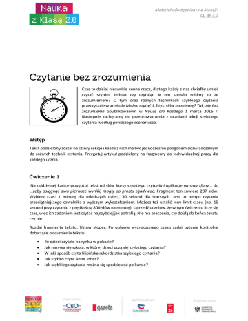 Materiał udostępniony na licencji: CC BY 3.0 Czas to dzisiaj niezwykle cenna rzecz, dlatego każdy z nas chciałby umieć czytać szybko. Jednak czy czytając w ten sposób robimy to ze zrozumieniem? O tym oraz różnych technikach szybkiego czytania przeczytacie w artykule Można czytać 1,5 tys. słów na minutę? Tak, ale bez zrozumienia opublikowanym w Nauce dla Każdego 1 marca 2016 r. Następnie zachęcamy do przeprowadzenia z uczniami lekcji szybkiego czytania według poniższego scenariusza. Tekst podzielony został na cztery sekcje i każda z nich ma być jednocześnie poligonem doświadczalnym do różnych technik czytania. Przygotuj artykuł podzielony na fragmenty do indywidualnej pracy dla każdego ucznia. Na oddzielnej kartce przygotuj tekst od słów Kursy szybkiego czytania i aplikacje na smartfony... do ...żeby osiągnąć dwa pierwsze wyniki, mogły po prostu zgadywać. Fragment ten zawiera 207 słów. Wybierz czas: 1 minutę dla młodszych dzieci, 30 sekund dla starszych. Jest to tempo czytania przeciętniejszego czytelnika z wyższym wykształceniem. Możesz też ustalić inny limit czasu (np. 15 sekund przy czytaniu z prędkością 800 słów na minutę). Uprzedź uczniów, że w tym ćwiczeniu liczy się czas, więc ich zadaniem jest czytać najszybciej jak potrafią. Nie ma znaczenia, czy dojdą do końca tekstu czy nie. Rozdaj fragmenty tekstu. Ustaw stoper. Po upływie wyznaczonego czasu zadaj pytania kontrolne dotyczące zrozumienia tekstu: Ile dzieci czytało na rynku w pokazie? Jak nazywa się szkoła, w której dzieci uczą się szybkiego czytania? W jaki sposób czyta filipińska rekordzistka szybkiego czytania? Jak szybko czyta Anne Jones? Jak szybkiego czytania można się spodziewać po kursie? Materiał udostępniony na licencji: CC BY 3.0 Ile informacji udało się wyłowić z tekstu przy tak szybkim czytaniu? Możecie spróbować czytać tekst ponownie, z innym limitem czasowym. Następnie oproś uczniów, by przeczytali tekst w swoim tempie, tak by znaleźć i zrozumieć wszystkie informacje. Czy czytanie szybciej w tym wypadku znaczy lepiej? Kolejny akapit tekstu (od słów Na problemie rozumienia czytanego tekstu… do słów ...piszą autorzy raportu – 161 słów) pozwoli przećwiczyć czytanie zygzakiem, choć w wydaniu nieco zmienionym. Tekst należy przeskanować z góry na dół (nie linijka po linijce) wyławiając pojedyncze słowa. Następnie skanujemy ten sam tekst w przeciwnym kierunku – z dołu do góry. Na całe ćwiczenie uczniowie mają 10 sekund. Po upływie tego czasu wszyscy odwracają kartkę z tekstem. Pytania kontrolne do tekstu: Na czym polega czytanie? Czy proces ten można przyspieszyć? Do czego potrzebne jest widzenie peryferyjne? Czy czytanie zygzakiem jest zgodne z biologią człowieka? Jeśli nie udało się wyłowić tych informacji w czasie pierwszego czytania, ponówcie ćwiczenie, tym razem znając już pytania i wiedząc, jakich informacji należy szukać. Czy tym razem w ciągu 10 sekund udało się znaleźć wszystkie potrzebne informacje? Następne dwa akapity tekstu to 276 słów (od Widzenie peryferyjne jest zamazane... do ...jeśli stłumimy nasz wewnętrzny głos.). Zadaniem uczniów jest przeczytać ten fragment na tyle szybko, by uniknąć „lektora”, który czyta słowa w myśli. Wzrok prześlizguje się jedynie po słowach, ale mózg stara się wyłączyć głos, który w głowie je wypowiada. Poproś uczniów, by przeczytali ten akapit mierząc sobie czas (np. stoperem w telefonie). Po przeczytaniu kartkę z tekstem należy odwrócić. Porównajcie wyniki czasowe z informacjami z pierwszego akapitu. Pytania kontrolne do tekstu: Ile znaków dostrzega oko w trakcie czytania? Na czym polega technika RSVP? Ile czasu zajmuje ruch gałek ocznych w trakcie czytania? Po co oko wraca do poprzedniego słowa? Ostatni fragment tekstu (od słów Jedynym elementem z treningów szybkiego czytania... do końca) uczniowie przeglądają pod kontem wyszukiwania informacji. Należy tekst przeskanować wzrokiem, zwracając uwagę na jego budowę (akapity, cytaty, dialogi lub wypowiedzi) oraz charakterystyczne Materiał udostępniony na licencji: CC BY 3.0 informacje (dane liczbowe, nazwiska, nazwy własne). Nie należy czytać tekstu słowo po słowie, a jedynie poszukiwać w nim informacji. Na przejrzenie tego tekstu przeznacz 15-20 sekund. Pytania kontrolne do tekstu: Kiedy przydaje się taka metoda czytania? Jak szybko czytał gazetę codzienną Kennedy? Dlaczego czytamy szybciej jeśli czytamy dużo? Jak brzmi anegdota Woodiego Allena o szybkim czytaniu? Bez względu na to, ile odpowiedzi udało się udzielić prawidłowo, poproś uczniów o przeczytanie tego fragmentu we własnym tempie, tak by dokładnie zrozumieć treść. Następnie podziel klasę na grupy. Każdej grupie wręcz podręcznik (najlepiej nieszkolny – dla hobbystów lub z innego szczebla edukacji), którego nie znają. Poproś o wspólne efektywne przejrzenie zgodnie z instrukcją opisaną w tekście. Ustal czas – około 2 minut. Po jego upływie poproś uczniów, by odpowiedzieli na pytania: Dla kogo przeznaczony jest podręcznik? Czego można się z niego dowiedzieć? Jakich praktycznych umiejętności można się z niego nauczyć? Jakie zagadnienie z tego podręcznika wydaje się najtrudniejsze? Na jakie elementy zwrócili uwagę w trakcie przeglądania i które okazały się być najbogatsze w informacje? Zastanówcie się wspólnie, czy taka technika czytania może przydać się uczniowi i w jakich konkretnych sytuacjach. Wyszukajcie na youtube.com video o szybkim czytaniu. Obejrzyjcie je wspólnie i zastanówcie się, czy jest wiarygodne. Weźcie pod uwagę źródło i cel zrealizowania tego video. Co budzi waszą wątpliwość? Którym informacjom ufacie? Wypiszcie na tablicy z lewej strony fakty, a z prawej opinie zawarte w materiale. Szczególną uwagę zwróćcie na opinie, które mają uchodzić za fakty – wspólnie zastanówcie