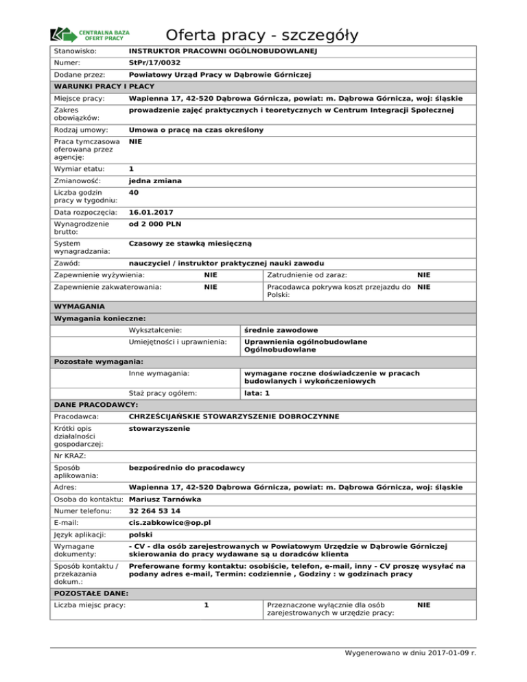 Oferta pracy - szczegóły Stanowisko: INSTRUKTOR PRACOWNI OGÓLNOBUDOWLANEJ Numer: StPr/17/0032 Dodane przez: Powiatowy Urząd Pracy w Dąbrowie Górniczej WARUNKI PRACY I PŁACY Miejsce pracy: Wapienna 17, 42-520 Dąbrowa Górnicza, powiat: m. Dąbrowa Górnicza, woj: śląskie Zakres obowiązków: prowadzenie zajęć praktycznych i teoretycznych w Centrum Integracji Społecznej Rodzaj umowy: Umowa o pracę na czas określony Praca tymczasowa oferowana przez agencję: NIE Wymiar etatu: 1 Zmianowość: jedna zmiana Liczba godzin pracy w tygodniu: 40 Data rozpoczęcia: 16.01.2017 Wynagrodzenie brutto: od 2 000 PLN System wynagradzania: Czasowy ze stawką miesięczną Zawód: nauczyciel / instruktor praktycznej nauki zawodu Zapewnienie wyżywienia: NIE Zatrudnienie od zaraz: NIE Zapewnienie zakwaterowania: NIE Pracodawca pokrywa koszt przejazdu do NIE Polski: WYMAGANIA Wymagania konieczne: Wykształcenie: średnie zawodowe Umiejętności i uprawnienia: Uprawnienia ogólnobudowlane Ogólnobudowlane Pozostałe wymagania: Inne wymagania: wymagane roczne doświadczenie w pracach budowlanych i wykończeniowych Staż pracy ogółem: lata: 1 DANE PRACODAWCY: Pracodawca: CHRZEŚCIJAŃSKIE STOWARZYSZENIE DOBROCZYNNE Krótki opis działalności gospodarczej: stowarzyszenie Nr KRAZ: Sposób aplikowania: bezpośrednio do pracodawcy Adres: Wapienna 17, 42-520 Dąbrowa Górnicza, powiat: m. Dąbrowa Górnicza, woj: śląskie Osoba do kontaktu: Mariusz Tarnówka Numer telefonu: 32 264 53 14 E-mail: [email protected] Język aplikacji: polski Wymagane dokumenty: - CV - dla osób zarejestrowanych w Powiatowym Urzędzie w Dąbrowie Górniczej skierowania do pracy wydawane są u doradców klienta Sposób kontaktu / przekazania dokum.: Preferowane formy kontaktu: osobiście, telefon, e-mail, inny - CV proszę wysyłać na podany adres e-mail, Termin: codziennie , Godziny : w godzinach pracy POZOSTAŁE DANE: Liczba miejsc pracy: 1 Przeznaczone wyłącznie dla osób zarejestrowanych w urzędzie pracy: NIE Wygenerowano w dniu 2017-01-09 r. w tym dla niepełnosprawnych: 0 Przeznaczone dla osób niepełnosprawnych (finansowanie z PFRON): NIE Data dodania: 09.01.2017 Możliwe przekazanie do realizacji przez inny PUP: NIE Data udostępnienia na portalu Europejskich Służb Zatrudnienia: 09.01.2017 Data aktualizacji: Data ważności: 16.01.2017 Wygenerowano w dniu 2017-01-09 r.