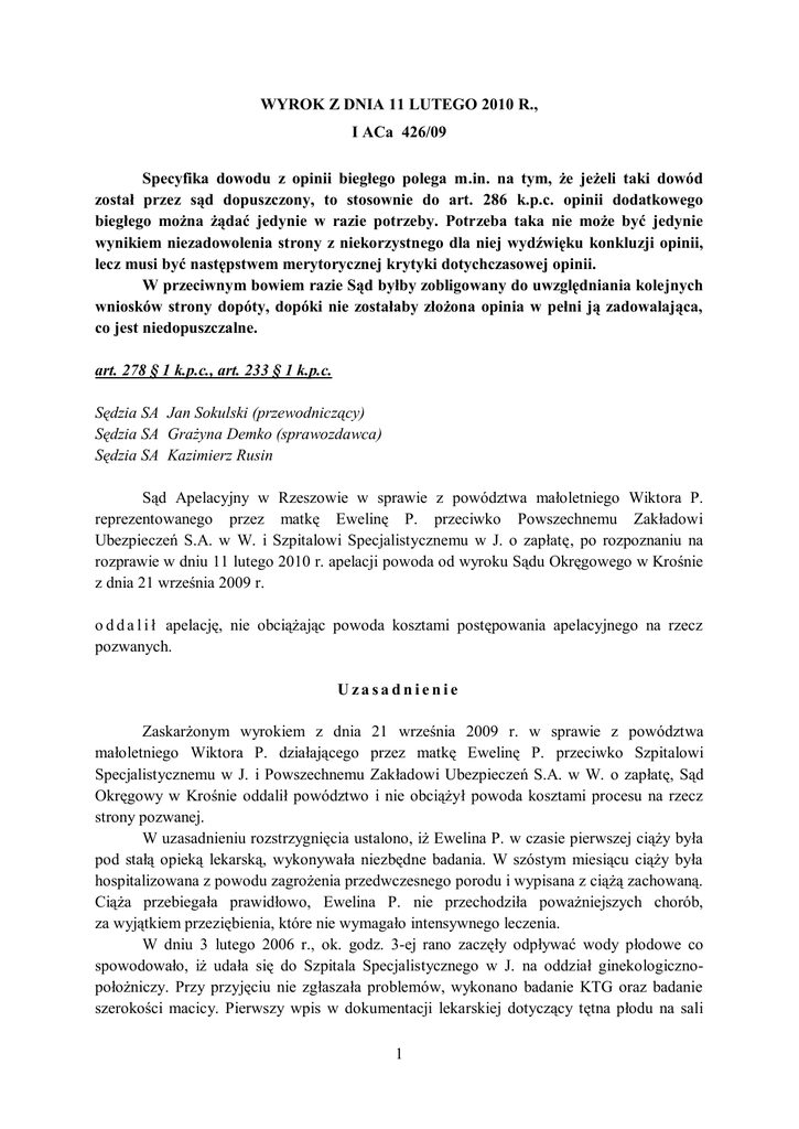 WYROK Z DNIA 11 LUTEGO 2010 R., I ACa 426/09 Specyfika dowodu z opinii biegłego polega m.in. na tym, że jeżeli taki dowód został przez sąd dopuszczony, to stosownie do art. 286 k.p.c. opinii dodatkowego biegłego można żądać jedynie w razie potrzeby. Potrzeba taka nie może być jedynie wynikiem niezadowolenia strony z niekorzystnego dla niej wydźwięku konkluzji opinii, lecz musi być następstwem merytorycznej krytyki dotychczasowej opinii. W przeciwnym bowiem razie Sąd byłby zobligowany do uwzględniania kolejnych wniosków strony dopóty, dopóki nie zostałaby złożona opinia w pełni ją zadowalająca, co jest niedopuszczalne. art. 278 § 1 k.p.c., art. 233 § 1 k.p.c. Sędzia SA Jan Sokulski (przewodniczący) Sędzia SA Grażyna Demko (sprawozdawca) Sędzia SA Kazimierz Rusin Sąd Apelacyjny w Rzeszowie w sprawie z powództwa małoletniego Wiktora P. reprezentowanego przez matkę Ewelinę P. przeciwko Powszechnemu Zakładowi Ubezpieczeń S.A. w W. i Szpitalowi Specjalistycznemu w J. o zapłatę, po rozpoznaniu na rozprawie w dniu 11 lutego 2010 r. apelacji powoda od wyroku Sądu Okręgowego w Krośnie z dnia 21 września 2009 r. o d d a l i ł apelację, nie obciążając powoda kosztami postępowania apelacyjnego na rzecz pozwanych. U za sa dnienie Zaskarżonym wyrokiem z dnia 21 września 2009 r. w sprawie z powództwa małoletniego Wiktora P. działającego przez matkę Ewelinę P. przeciwko Szpitalowi Specjalistycznemu w J. i Powszechnemu Zakładowi Ubezpieczeń S.A. w W. o zapłatę, Sąd Okręgowy w Krośnie oddalił powództwo i nie obciążył powoda kosztami procesu na rzecz strony pozwanej. W uzasadnieniu rozstrzygnięcia ustalono, iż Ewelina P. w czasie pierwszej ciąży była pod stałą opieką lekarską, wykonywała niezbędne badania. W szóstym miesiącu ciąży była hospitalizowana z powodu zagrożenia przedwczesnego porodu i wypisana z ciążą zachowaną. Ciąża przebiegała prawidłowo, Ewelina P. nie przechodziła poważniejszych chorób, za wyjątkiem przeziębienia, które nie wymagało intensywnego leczenia. W dniu 3 lutego 2006 r., ok. godz. 3-ej rano zaczęły odpływać wody płodowe co spowodowało, iż udała się do Szpitala Specjalistycznego w J. na oddział ginekologicznopołożniczy. Przy przyjęciu nie zgłaszała problemów, wykonano badanie KTG oraz badanie szerokości macicy. Pierwszy wpis w dokumentacji lekarskiej dotyczący tętna płodu na sali 1 porodowej odnotowano o godz. 9-tej i nie stwierdzono patologii. W dalszych godzinach dokonywano kolejnych pomiarów. Z na uwagi na wtórne osłabienie czynności skurczowej o godz. 14.45 podano oxytacynę. Na sali porodowej dyżur pełniło dwóch lekarzy; Sławomir Sz. i Aneta Ch.-M. oraz położna Zdzisława J. Ostatni zapis KTG wykonywany od godz. 14.51 do 15.21 był prawidłowy. Nie zachodziły okoliczności uzasadniające wykonanie cesarskiego cięcia. Poród siłami natury nastąpił o godz. 15.30 i odbierała go położna, jako że lekarze przeprowadzali zabieg cesarskiego cięcia u innej pacjentki. Z opinii biegłego z zakresu ginekologii i położnictwa dr n. med. Jacka T. z dnia 7 kwietnia 2009 r., uzupełnionej w dniu 15 maja 2009 r. wynikało, iż wobec Eweliny P. zachowane zostały wymagane procedury i nie doszło do zaniedbań ze strony personelu medycznego. Na bieżąco były monitorowane tak stan rodzącej, jak i tętno płodu i nie było widocznych zagrożeń. Poród nie był przedłużony, jak na pierworódkę, nie zachodziły podstawy do wykonania cesarskiego cięcia i decyzji w tym zakresie nie uzasadniał ani stan płodu, ani rodzącej. Sama rozmowa o takiej możliwości nie stwarza podstaw do przyjęcia, iż zachodziła konieczność wykonania cesarskiego cięcia. Nie zostało odnotowane w dokumentacji medycznej o zastosowaniu manewru Kristellera polegającego na wielokrotnym uciskaniu brzucha rodzącej. Manewr ten nie jest zabroniony, lecz z uwagi na możliwość powstania obrażeń u dziecka – np. w postaci uszkodzenia OUN, złamania kości, otarcia, a także u rodzącej, nie jest zalecany do stosowania. Prawdopodobieństwo uszkodzenia OUN u powoda jest znikome z uwagi na prawidłowy zapis KTG. U Wiktora P. nie stwierdzono zniekształceń główki. Nie można wykluczyć powstania uszkodzeń u powoda jeszcze przed porodem. Nie można również stwierdzić, czy u Eweliny P. miało miejsce wysokie proste stanie główki, bowiem zaobserwować to można jedynie w czasie badania podczas porodu. Opinia jako pełna, fachowa, rzetelna zasługiwała na wiarę i nie zachodziła potrzeba dopuszczania dowodu z opinii innego biegłego. Małoletni Wiktor P. w pierwszej minucie po porodzie uzyskał 1 punkt w skali Agpar. Podjęto resuscytację, reanimację i umieszczono noworodka na oddziale neonatologii w inkubatorze. Stwierdzono wzmożone napięcie kończyn z widocznym drżeniem kończyn dolnych. W 10 i 20 minucie po porodzie powód miał 6 i 7 punktów w skali Agpar. Nad polami płuc były zmiany o charakterze zapalnym. Od trzeciej doby stan się poprawiał, zmniejszyło się napięcie mięśniowe. W karcie informacyjnej leczenia szpitalnego z dnia 13 lutego 2006 r. stwierdzono ciężką zamartwicę noworodka, encefalopatię niedokrwiennoniedotlenieniową, noworodkowe zapalenie płuc i hiperbilirubinemię. W marcu 2007 r. małoletni został przyjęty do Szpitala Wojewódzkiego Nr 2 w Rz. celem diagnostyki z powodu opóźnionego rozwoju psychoruchowego. Badanie wykazało zmiany mogące odpowiadać niedotlenieniu okołoporodowemu. Obecnie małoletni Wiktor P. liczy 3,5 roku. Nie chodzi, nie siada samodzielnie, ma niewyraźną mowę, rozwój intelektualny w normie. Wymaga ciągłej rehabilitacji i dwa razy w tygodniu uczęszcza na zajęcia refundowane przez NFZ, a dodatkowo raz w tygodniu na zajęcia prywatne. Co miesiąc ma miejsce konsultacja u neurologa, zaś raz w tygodniu u logopedy. W ocenie Sądu Okręgowego nie zachodziły okoliczności uzasadniające dopuszczenie 