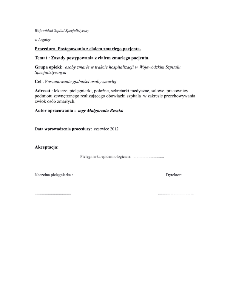 Wojewódzki Szpital Specjalistyczny w Legnicy Procedura Postępowania z ciałem zmarłego pacjenta. Temat : Zasady postępowania z ciałem zmarłego pacjenta. Grupa opieki: osoby zmarłe w trakcie hospitalizacji w Wojewódzkim Szpitalu Specjalistycznym Cel : Poszanowanie godności osoby zmarłej Adresat : lekarze, pielęgniarki, położne, sekretarki medyczne, salowe, pracownicy podmiotu zewnętrznego realizującego obowiązki szpitala w zakresie przechowywania zwłok osób zmarłych. Autor opracowania : mgr Małgorzata Reszko Data wprowadzenia procedury: czerwiec 2012 Akceptacja: Pielęgniarka epidemiologiczna: .............................. Naczelna pielęgniarka : .................................... Dyrektor: ................................... 1. W razie śmierci pacjenta w oddziale pielęgniarka niezwłocznie powiadamia o tym lekarza leczącego lub lekarza dyżurnego. 2. Lekarz : •dokonuje oględzin zmarłego •stwierdza zgon oraz jego przyczynę • odnotowuje w Karcie gorączkowej i Historii choroby (datę i godzinę śmierci) •zawiadamia rodzinę pacjenta •wystawia kartę statystyczną do karty zgonu zgodnie z obowiązującymi przepisami •w przypadku przeprowadzenia sekcji zwłok stwierdzenie przyczyny zgonu następuje po jej przeprowadzeniu •przekazanie karty zgonu do kamcelarii przedsiębiorstwa podmiotu następuje zgodnie z obowiązującą procedurą wprowadzoną odrębnym Zarządzeniem Dyrektora Szpitala 3. Pielęgniarka dyżurna opiekująca się pacjentem : •wypełnia kartę przekazania ciała do chłodni •rozbiera ciało zmarłego z brudnych ubrań •dokonuje toalety pośmiertnej - umycie zwłok usunięcie wkłuć, venflonów, wkłucia centralnego, wszelkich rodzajów cewników np. z pęcherza moczowego, żołądka itp., usuwane są także opatrunki i pampersy lub inne rzeczy, o ile nie są cieknące (lejące), •rany lejące, zaopatruje opatrunkiem czystym •w przypadku kiedy pacjent nie miał własnej pidżamy, zwłoki zmarłego ubiera w odzież jednorazowego użytku •zawija ciało w prześcieradło specjalnie do tego przeznaczone (zielone) •zakłada na stopę i przegub dłoni osoby zmarłej opaskę identyfikacyjną wykonaną z tworzywa sztucznego , tasiemki lub płotna •czynności związane z wykonywaniem toalety pośmiertnej pacjenta powinny być wykonywane z zachowaniem godności należnej zmarłemu •personel wykonujący toaletę pośmiertną ubrany jest w odzież ochronną (fartuchy i rękawiczki jednorazowe). •Identyfikator winien zawierać : •imię i nazwisko osoby zmarłej, •PESEL osoby zmarłej, a przypadku braku numeru PESEL – serię i numer dokumentu stwierdzającego tożsamość, •datę i godzinę zgonu •Karta wydania zwłok z oddziału winna zawierać •imię i nazwisko osoby zmarłej, •PESEL osoby zmarłej, a w przypadku braku numeru PESEL – serię i numer dokumentu stwierdzającego tożsamość, •datę i godzinę zgonu, •godzinę przekazania ciała osoby zmarłej do chłodni, •imię, nazwisko , czytelny podpis pielęgniarki wypełniającej kartę/ wydającej zwłoki •imię i nazwisko oraz czytelny podpis osoby odbierającej zwłoki •karta wydania zwłok z oddziału przechowywana jest w dokumentacji pacjenta 4.Jeżeli ustalenie tożsamości osoby zmarłej nie jest możliwe, w karcie przekazania zwłok do chłodni oraz na identyfikatorze dokonać wpisu „NN” , data i godzina zgonu, z podaniem przyczyny i okoliczności uniemożliwiających ustalenie tożsamości. 5. Zwłoki osoby zmarłej przez 2 godziny - są przechowywane w przeznaczonym do tego celu pomieszczeniu, a w razie braku – w innym miejscu, z zachowaniem godności należnej zmarłemu. W miarę możliwości łóżko powinno zostać oddzielone parawanem, w celu ograniczenia dostępu osób trzecich z wyłączeniem rodziny osoby zmarłej. Rodzinie należy umożliwić dostęp do zwłok, zapewniając spokój i izolację od otoczenia. 6.W przypadku zgonu pacjenta na bloku operacyjnym, po wykonaniu w/w czynności, ciało zmarłego pozostaje w wyznaczonym miejscu przez 2 godziny z zachowaniem godności należnej zmarłemu. 7. Po przekazaniu zwłok: przeprowadza się dezynfekcję miejsca (sali) wraz z całym wyposażeniem ( szafki, łóżko , taborety itd…) zgodnie z obowiązującą procedurą wprowadzoną odrębnym Zarządzeniem Dyrektora Szpitala. 8. Zwłoki osoby zmarłej przekazane są pracownikom podmiotu zewnętrznego realizującego obowiązki szpitala w zakresie przechowywania zwłok osób zmarłych. nie wcześniej niż po upływie dwóch godzin od zgonu, wskazanego w dokumentacji medycznej. Transport ciała zmarłego odbywa się najkrótszą możliwą drogą z oddziału do windy i dalej do wyznaczonego pomieszczenia na poziomie -1 budynku H-J i 3A Szpitala, tam ciało jest przekładane z wózka „szpitalnego”na nosze i przenoszone do samochodu „Meleks”. Następnie przewożone jest do chłodni. 9. Pielęgniarka wydająca zwłoki zmarłego zobowiązana jest: •w przypadku stwierdzenia jakichkolwiek nieprawidłowości ze strony pracowników firmy zewnętrznej, należy wstrzymać procedurę przekazania jednocześnie informując o tym: przełożonego, lekarza dyżurnego oraz przełożonego pracowników podmiotu zewnętrznego realizującego obowiązki szpitala w zakresie przechowywania zwłok osób zmarłych. 10. Pielęgniarka zabezpiecza: ubrania, środki czystości, inne osobiste rzeczy pacjenta pakowane są w plastikowy worek, oznaczony imieniem i nazwiskiem chorego, po przekazywane rodzinie po zgłoszeniu się do szpitala. Rzeczy wartościowe, są przechowywane w specjalnej metalowej kasecie, zamykanej w dyżurce pielęgniarskiej po spisaniu w obecności lekarza lub pozostałych pielęgniarek – przekazywane rodzinie. 11. Pielęgniarka wydaje rodzinie pacjenta : •rzeczy za pokwitowaniem •rodzina kwituje odbiór wartościowych przedmiotów na druku, na którym były spisane, kopię przekazuje rodzinie, oryginał potwierdzenia odbior