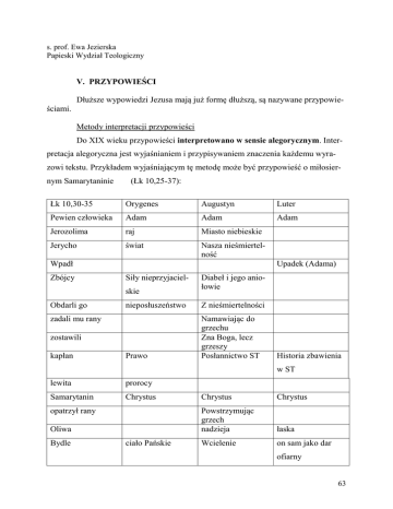 s. prof. Ewa Jezierska Papieski Wydział Teologiczny V. PRZYPOWIEŚCI Dłuższe wypowiedzi Jezusa mają już formę dłuższą, są nazywane przypowieściami. Metody interpretacji przypowieści Do XIX wieku przypowieści interpretowano w sensie alegorycznym. Interpretacja alegoryczna jest wyjaśnianiem i przypisywaniem znaczenia każdemu wyrazowi tekstu. Przykładem wyjaśniającym tę metodę może być przypowieść o miłosiernym Samarytaninie (Łk 10,25-37): Łk 10,30-35 Orygenes Augustyn Luter Pewien człowieka Adam Adam Adam Jerozolima raj Miasto niebieskie Jerycho świat Nasza nieśmiertelność Wpadł Zbójcy Upadek (Adama) Siły nieprzyjacielskie Obdarli go nieposłuszeństwo Z nieśmiertelności Prawo Namawiając do grzechu Zna Boga, lecz grzeszy Posłannictwo ST zadali mu rany zostawili kapłan Diabeł i jego aniołowie Historia zbawienia w ST lewita prorocy Samarytanin Chrystus opatrzył rany Oliwa Bydle ciało Pańskie Chrystus Chrystus Powstrzymując grzech nadzieja łaska Wcielenie on sam jako dar ofiarny 63 Kościół Gospoda Kościół Kościół Interpretacja alegoryczna jest spuścizną kulturową świata hellenistycznego. Komentatorzy greccy stosowali ją dla odnalezienia właściwego, głębokiego, duchowego sensu mitów greckich. Ta interpretacja przejęta została przez Filona Aleksandryjskiego (I w. n.e.), który zastosował ją do Biblii. Dla ludzi intelektu tamtego czasu nie do pomyślenia było mówić o rękach, ramionach , sercu, wnętrznościach Boga. Stąd uważano, że ręce i ramiona wyrażają potęgę Boga, serce i wnętrzności – Jego mądrość i miłosierdzie. W samych Ewangeliach znaleźć można interpretacje alegoryczną, która występuje np. w wyjaśnieniu przez Jezusa przypowieści o siewcy: Przypowieść podana przez Mateusza (13,24-30 to tekst: „Królestwo niebieskie podobne jest do człowieka, który nasiał dobre nasienie na swojej roli. Lecz gdy ludzie spali, przyszedł jego nieprzyjaciel, nasiał chwastu miedzy pszenice i odszedł. A gdy zboże wyrosło i nie wypuściło kłosy, wtedy pojawił się i chwast. Słudzy gospodarza przyszli i zapytali go: <Panie, czy nie posiałeś dobrego nasienia na swej roli? Skąd więc wziął się na niej chwast?> Odpowiedział im: <Nieprzyjazny człowiek to sprawił>. Rzekli mu słudzy: <Chcesz więc, żebyśmy poszli i zebrali go?> A on im odrzekł: <Nie, byście zbierając chwast, nie wyrwali razem z nim i pszenicy. Pozwólcie obojgu róść aż do żniwa; w czasie żniwa powiem żeńcom: <Zbierzcie najpierw chwast i powiążcie go w snopki na spalenie; pszenicę zaś zwieźcie do mego spichlerza>”. Wyjaśnienie przypowieści przez Jezusa na prośbę uczniów „<Wyjaśnij nam przypowieść o chwaście>. On im odpowiedział: 37 Tym, który sieje dobre nasienie jest Syn Człowieczy rolą jest świat dobrym nasieniem są synowie królestwa chwastem są synowie Złego 39 jest diabeł żniwami jest koniec świata żeńcami są aniołowie nieprzyjacielem, który posiał 64 (końcowe słowa Jezusa podane przez Mateusza; 40 Jak więc zbiera się chwast i spala ogniem, tak będzie przy końcu świata. 41Syn Człowieczy pośle aniołów swoich: ci zbiorą z Jego królestwa wszystkie zgorszenia i tych, którzy dopuszczają się niesprawiedliwości, 42i wrzuca ich w piec rozpalony; tam będzie płac z i zgrzytanie zębów. 43Wtedy sprawiedliwi jaśnieć będą jak słońce w królestwie Ojca swego”.). Podobnie przypowieść Markowa o siewcy (Mk 4,3-8), w wyjaśnieniu (Mk 414-20), stosuje alegoryczny sposób objaśniania: ziarno jest „Słowem”, każdy z czterech rodzajów terenów obrazuje inny rodzaj słuchaczy słowa, „ptaki”, które wyjadły ziarno, to szatan, „słońce”, które wypaliło ziemię, to „prześladowania i ucisk”, a „ciernie” określają „ułudę bogactwa, troski światowe, różne żądze”. Ciekawe, że św.Paweł nie wprowadza przypowieści w swoje nauczanie, jak to czynią Ewangeliści, ale posługuje się alegorią. Występuje ona w liście do Efezjan 6,10-17, w interpretacji podanej w.ww.14-17. „10Na koniec bądźcie mocni w Panu – siłą Jego potęgi. 11Przyobleczcie pełną zbroją Bożą, byście mogli się ostać wobec podstępnych zakusów diabła. 12Nie toczymy bowiem walki przeciw krwi i ciału, lecz przeciw Zwierzchnościom, przeciw Władzom, przeciw rządcom świata tych ciemności, przeciw duchowym pierwiastkom zła na wyżynach niebieskich. 13Dlatego przywdziejcie pełna zbroję Bożą, abyście się zdołali przeciwstawić w dzień zły i ostać, zwalczywszy wszystko. 14Stańcie więc do walki mając: prawdę sprawiedliwość a za buty wiara (trzymając zawsze ręku za pas za pancerz zapał głoszenia Ewangelii pokoju; tarczą tarczę wiary ) dzięki której zdołacie zgasić wszystkie rozżarzone pociski Złego), zbawienie hełmem (weźcie też hełm zbawienia i miecz ducha:) Słowo Boże miecz ducha”. 65 Elementy alegorii występują też w liście św.Pawła do Rzymian w rozdziale XI, gdzie Apostoł mówi o „odciętych gałęziach”, którymi są Żydzi, nie uznający Chrystusa, o „wszczepionych dziczkach” – poganach, o „korzeniu” drzewa jakim są patriarchowie i prorocy ST1. Około. XIXw. rozwinęła się egzegeza historyczno-krytyczna przy badaniu tekstów biblijnych, zwłaszcza przypowieści. Ta metoda badań 1) koncentruje się na znaczeniu przypowieści w odniesieniu do jednego punktu przekazu, w relacji do wyjątkowej sytuacji przekazu, 2) chce dotrzeć do oryginalnego tekstu przypowieści (pierwotnego), takiego, jaki głosił Jezus i chce odnaleźć kontekst historyczny przypowieści badanej, 3) docenia tekst pierwotny, jego prostotę, 4) jako „balast”, wypaczający tekst oryginalny, traktuje to, co pochodzi od Ewangelisty czy pierwotnego kościoła. [przedstawiciele tego kierunku badań przypowieści: Adolf Liche, Charle Herold Dodd, Joachim Jeremias]2. Egzegeza współczesna tekstu biblijnego dąży do odczytania t