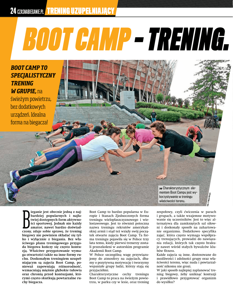 24 czasnabieganie.pl TRENING UZUPEŁNIAJĄCY BOOT CAMP – TRENING. B ieganie jest obecnie jedną z najbardziej popularnych i najłatwiej dostępnych form aktywności sportowej. Jednak nie każdy amator, nawet bardzo doświadczony, zdaje sobie sprawę, że trening biegowy nie powinien składać się tylko i wyłącznie z biegania. Bez właściwego planu treningowego przygoda biegowa kończy się często kontuzją. Właściwe przygotowanie wymaga otwartości także na inne formy ruchu. Doskonałym treningiem uzupełniającym są zajęcia Boot Camp, ponieważ zapewniają różnorodność, wzmacniają mięśnie głębokie tułowia oraz chronią przed kontuzjami, którymi często skutkują powtarzalne ruchy biegacza. Charakterystycznym elementem Boot Campu jest wykorzystywanie w treningu właściwości terenu. Boot Camp to bardzo popularna w Europie i Stanach Zjednoczonych forma treningu wielopłaszczyznowego i wielostawowego. Jest to również potoczna nazwa treningu rekrutów amerykańskiej armii i stąd też wzięły swój początek otwarte zajęcia Boot Camp. Ta forma treningu pojawiła się w Polsce trzy lata temu, kiedy pierwsi trenerzy zostali przeszkoleni w autorskim programie Akademii Boot Camp. W Polsce szczególną wagę przywiązujemy do atmosfery na zajęciach, dbamy o pozytywną motywację i tworzymy wspaniałe grupy ludzi, którzy stają się przyjaciółmi. Charakterystyczne cechy treningu Boot Camp to praca na świeżym powietrzu, w parku czy w lesie, oraz trening foto © M arek Bicz yk BOOT CAMP TO SPECJALISTYCZNY TRENING W GRUPIE, na świeżym powietrzu, bez dodatkowych urządzeń. Idealna forma na biegacza! zespołowy, czyli ćwiczenia w parach i grupach, a także wzajemne motywowanie się uczestników. Jest to więc alternatywa dla zamkniętych sal siłowni i doskonały sposób na zahartowanie organizmu. Dodatkowo specyfika zajęć, która często wymaga współpracy trenujących, prowadzi do nawiązania relacji, których tak często brakuje nawet wśród stałych bywalców klubów fitness. Każde zajęcia są inne, dostosowane do możliwości i zdolności grupy oraz właściwości terenu, więc nuda i powtarzalność nikomu nie grozi. W jaki sposób najlepiej zaplanować trening biegowy, żeby uniknąć kontuzji i prawidłowo przygotować organizm do wysiłku? ENERGIA. ZABAWA Budowanie wytrzymałości (m.in. mające na celu podniesienie maksymalnego poboru tlenu – dzięki czemu organizm jest w stanie pracować efektywniej). W miarę postępów jesteśmy w stanie biec dłużej i szybciej, stosuje się środki treningowe, takie jak: – podstawowy trening wytrzymałościowy na poziomie ok. 60–75 procent HR max (dłuższy, 1 raz w tygodniu), – sesje tempowe (dłuższe odcinki z intensywnością ok. 75-85 procent HR max), – sesje interwałowe (krótsze odcinki, np. ok. 2 km, 80 procent HR max, przeplatane odcinkami regenerującymi, np. 1 km przy tętnie ok. 60 procent HR max – do 2 razy w tygodniu), – dla zaawansowanych biegaczy do 2 razy w miesiącu stosuje się trening sprinterski, czyli krótkie odcinki sięgające naszego tętna maksymalnego. 2. TRENING NERWOWO– –MIĘŚNIOWY Trening nerwowo-mięśniowy – który uczy nasz układ nerwowy prawidłowego sterowania mięśniami, czyli zachowania odpowiedniej długości i rytmu kroku. Środkami do osiągnięcia tego celu są ćwiczenia zawierające elementy plyometryczne, poprawiania techniki i podnoszenia siły biegowej oraz podbiegi. 3. ĆWICZENIA UZUPEŁNIAJĄCE Ćwiczenia uzupełniające, w tym trening funkcjonalny, uwzględniający indywidualny sposób poruszania się i ewentualnie występujące kompensacje u biegacza. Według Remigiusza Rzepki trening funkcjonalny to „ciąg ćwiczeń o charakterze zarówno lokalnym, jak i globalnym, którego efektem jest poprawa motoryczności ćwiczącego”. Zazwyczaj tego rodzaju trening jest realizowany na poziomie motoryczności podstawowej, czyli fundamentalnych wzorców 3. ĆWICZENIA W GRUPIE Treningi Boot Camp realizują po części również założenia treningu nerwowo-mięśniowego – na zajęciach znaleźć można mnóstwo kontrolowanych zmian kierunku, rytmu ruchu, pracy na różnych podłożach, z obciążeniem własnego ciała bądź ciała partnera, a także w warunkach odciążenia. Dzięki pracy w grupie i w parach, obserwując, pomagając bądź zwiększając innym obciążenie, uczymy się słuchać swojego ciała, świadomości kierunku ruchu i jego pożądanej dynamiki. Urozmaicony teren pozwala na aktywizację większej ilości włókien mięśniowych, co powoduje wzrost wytrzymałości. Kiedy już znamy założenia treningu Boot Camp, narzuca się pytanie, jaki rodzaj ćwiczeń jest dla nas najodpowiedniejszy i kiedy go planować? Intuicja podpowiada, żeby tego typu trening wykonywać w tzw. dni regeneracji, wolne od treningu biegowego. Okazuje się jednak, że nie jest to najlepszy pomysł. Następnego dnia po ciężkim treningu wzmacniającym będziemy bowiem odczuwać ból w bardziej obciążonych partiach mięśni. Warto więc decydować się na wykonywanie ciężkiego treningu wzmacniającego w dniu najcięższego treningu biegowego, po którym następuje dzień lub dwa regeneracji. Tak więc polecamy: Boot Camp Hard – dla zaawansowanych, w dniu najcięższego treningu biegowego; Boot Camp Standard/dla biegaczy – w dniu zwykłego, średnio- i niskointensywnego biegu; Boot Camp Light – w dni wolne od biegania. Taki rozkład zajęć pozwoli wam optymalnie wykorzystać zgromadzoną energię na poprawę formy biegowej. Żeby dostrzec wyjątkowość zajęć Boot Camp, wystarczy wziąć w nich udział, poćwiczyć na świeżym powietrzu, nawiązać kontakt ze swoim ciałem i doświadczyć reakcji swoich i współtowarzyszy, czyli poznać kwintesencję Boot Camp, znaną z hasła „Trening. Energia. Zabawa”. O skuteczności tych zajęć świadczą uśmiechnięte twarze uczestników. Marka Boot Camp Polska wciąż zyskuje popularność w