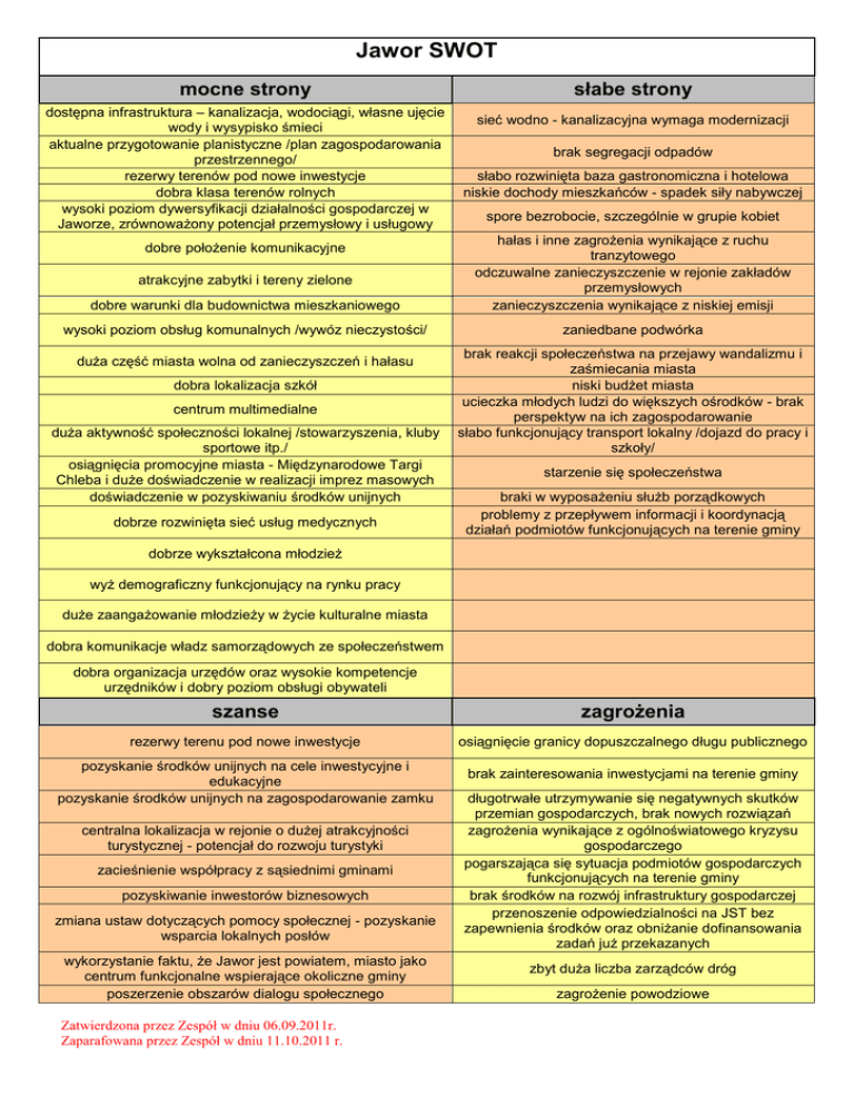 Jawor SWOT mocne strony dostępna infrastruktura – kanalizacja, wodociągi, własne ujęcie wody i wysypisko śmieci aktualne przygotowanie planistyczne /plan zagospodarowania przestrzennego/ rezerwy terenów pod nowe inwestycje dobra klasa terenów rolnych wysoki poziom dywersyfikacji działalności gospodarczej w Jaworze, zrównoważony potencjał przemysłowy i usługowy słabe strony sieć wodno - kanalizacyjna wymaga modernizacji brak segregacji odpadów słabo rozwinięta baza gastronomiczna i hotelowa niskie dochody mieszkańców - spadek siły nabywczej spore bezrobocie, szczególnie w grupie kobiet dobre warunki dla budownictwa mieszkaniowego hałas i inne zagrożenia wynikające z ruchu tranzytowego odczuwalne zanieczyszczenie w rejonie zakładów przemysłowych zanieczyszczenia wynikające z niskiej emisji wysoki poziom obsług komunalnych /wywóz nieczystości/ zaniedbane podwórka dobre położenie komunikacyjne atrakcyjne zabytki i tereny zielone duża część miasta wolna od zanieczyszczeń i hałasu dobra lokalizacja szkół centrum multimedialne duża aktywność społeczności lokalnej /stowarzyszenia, kluby sportowe itp./ osiągnięcia promocyjne miasta - Międzynarodowe Targi Chleba i duże doświadczenie w realizacji imprez masowych doświadczenie w pozyskiwaniu środków unijnych dobrze rozwinięta sieć usług medycznych brak reakcji społeczeństwa na przejawy wandalizmu i zaśmiecania miasta niski budżet miasta ucieczka młodych ludzi do większych ośrodków - brak perspektyw na ich zagospodarowanie słabo funkcjonujący transport lokalny /dojazd do pracy i szkoły/ starzenie się społeczeństwa braki w wyposażeniu służb porządkowych problemy z przepływem informacji i koordynacją działań podmiotów funkcjonujących na terenie gminy dobrze wykształcona młodzież wyż demograficzny funkcjonujący na rynku pracy duże zaangażowanie młodzieży w życie kulturalne miasta dobra komunikacje władz samorządowych ze społeczeństwem dobra organizacja urzędów oraz wysokie kompetencje urzędników i dobry poziom obsługi obywateli szanse zagrożenia rezerwy terenu pod nowe inwestycje osiągnięcie granicy dopuszczalnego długu publicznego pozyskanie środków unijnych na cele inwestycyjne i edukacyjne pozyskanie środków unijnych na zagospodarowanie zamku centralna lokalizacja w rejonie o dużej atrakcyjności turystycznej - potencjał do rozwoju turystyki zacieśnienie współpracy z sąsiednimi gminami pozyskiwanie inwestorów biznesowych zmiana ustaw dotyczących pomocy społecznej - pozyskanie wsparcia lokalnych posłów wykorzystanie faktu, że Jawor jest powiatem, miasto jako centrum funkcjonalne wspierające okoliczne gminy poszerzenie obszarów dialogu społecznego Zatwierdzona przez Zespół w dniu 06.09.2011r. Zaparafowana przez Zespół w dniu 11.10.2011 r. brak zainteresowania inwestycjami na terenie gminy długotrwałe utrzymywanie się negatywnych skutków przemian gospodarczych, brak nowych rozwiązań zagrożenia wynikające z ogólnoświatowego kryzysu gospodarczego pogarszająca się sytuacja podmiotów gospodarczych funkcjonujących na terenie gminy brak środków na rozwój infrastruktury gospodarczej przenoszenie odpowiedzialności na JST bez zapewnienia środków oraz obniżanie dofinansowania zadań już przekazanych zbyt duża liczba zarządców dróg zagrożenie powodziowe