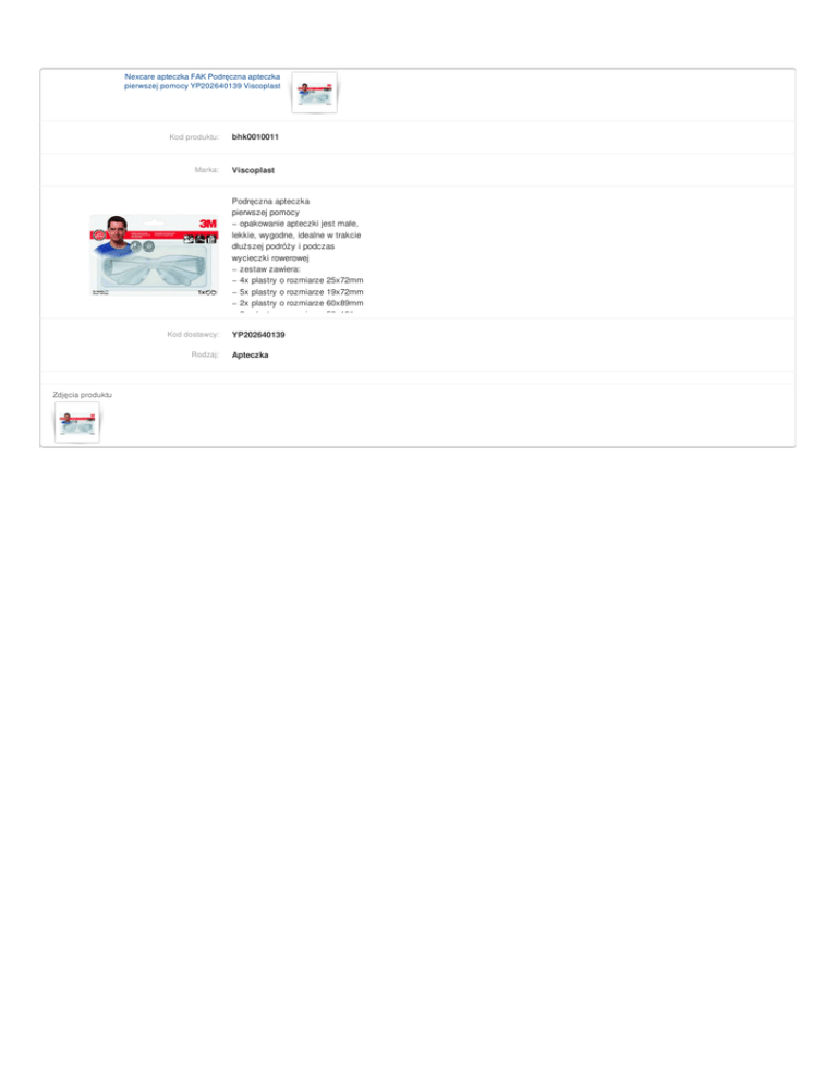Nexcare apteczka FAK Podręczna apteczka pierwszej pomocy YP202640139 Viscoplast Kod produktu: Marka: bhk0010011 Viscoplast Podręczna apteczka pierwszej pomocy − opakowanie apteczki jest małe, lekkie, wygodne, idealne w trakcie dłuższej podróży i podczas wycieczki rowerowej − zestaw zawiera: − 4x plastry o rozmiarze 25x72mm − 5x plastry o rozmiarze 19x72mm − 2x plastry o rozmiarze 60x89mm − 2x plastry o rozmiarze 50x101mm Kod dostawcy: Rodzaj: Zdjęcia produktu YP202640139 Apteczka