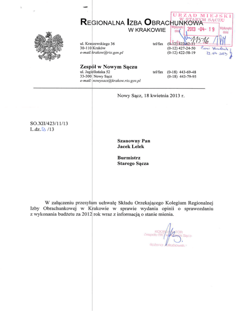 Wedlug przedloho ch do Regionalnej lzby Obrachunkowej w Krakowie