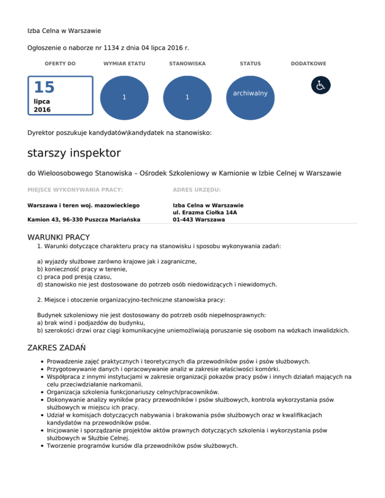 Izba Celna w Warszawie Ogłoszenie o naborze nr 1134 z dnia 04 lipca 2016 r. OFERTY DO WYMIAR ETATU STANOWISKA 1 1 15 lipca 2016 STATUS DODATKOWE archiwalny Dyrektor poszukuje kandydatów\kandydatek na stanowisko: starszy inspektor do Wieloosobowego Stanowiska – Ośrodek Szkoleniowy w Kamionie w Izbie Celnej w Warszawie MIEJSCE WYKONYWANIA PRACY: ADRES URZĘDU: Warszawa i teren woj. mazowieckiego Izba Celna w Warszawie ul. Erazma Ciołka 14A 01-443 Warszawa Kamion 43, 96-330 Puszcza Mariańska WARUNKI PRACY 1. Warunki dotyczące charakteru pracy na stanowisku i sposobu wykonywania zadań: a) wyjazdy służbowe zarówno krajowe jak i zagraniczne, b) konieczność pracy w terenie, c) praca pod presją czasu, d) stanowisko nie jest dostosowane do potrzeb osób niedowidzących i niewidomych. 2. Miejsce i otoczenie organizacyjno-techniczne stanowiska pracy: Budynek szkoleniowy nie jest dostosowany do potrzeb osób niepełnosprawnych: a) brak wind i podjazdów do budynku, b) szerokości drzwi oraz ciągi komunikacyjne uniemożliwiają poruszanie się osobom na wózkach inwalidzkich. ZAKRES ZADAŃ Prowadzenie zajęć praktycznych i teoretycznych dla przewodników psów i psów służbowych. Przygotowywanie danych i opracowywanie analiz w zakresie właściwości komórki. Współpraca z innymi instytucjami w zakresie organizacji pokazów pracy psów i innych działań mających na celu przeciwdziałanie narkomanii. Organizacja szkolenia funkcjonariuszy celnych/pracowników. Dokonywanie analizy wyników pracy przewodników i psów służbowych, kontrola wykorzystania psów służbowych w miejscu ich pracy. Udział w komisjach dotyczących nabywania i brakowania psów służbowych oraz w kwalifikacjach kandydatów na przewodników psów. Inicjowanie i sporządzanie projektów aktów prawnych dotyczących szkolenia i wykorzystania psów służbowych w Służbie Celnej. Tworzenie programów kursów dla przewodników psów służbowych. WYMAGANIA NIEZBĘDNE Wykształcenie: średnie doświadczenie zawodowe: 5 lat w obszarze szkolenia psów Nieposzlakowana opinia Komunikatywność Umiejętność działania w sytuacjach stresujących Umiejętność pracy w zespole Umiejętność analitycznego myślenia Posiadanie obywatelstwa polskiego Korzystanie z pełni praw publicznych Nieskazanie prawomocnym wyrokiem za umyślne przestępstwo lub umyślne przestępstwo skarbowe DOKUMENTY I OŚWIADCZENIA NIEZBĘDNE Kopie dokumentów potwierdzających spełnienie wymagania niezbędnego w zakresie wykształcenia Kopie dokumentów potwierdzających spełnienie wymagania niezbędnego w zakresie doświadczenia zawodowego / stażu pracy List motywacyjny z określeniem ogłoszenia, na które składana jest oferta (numer ogłoszenia, nazwa komórki organizacyjnej oraz stanowisko pracy) Życiorys lub CV Wypełniony kwestionariusz osobowy Oświadczenie o posiadaniu obywatelstwa polskiego albo kopia dokumentu potwierdzającego posiadanie polskiego obywatelstwa Oświadczenie o wyrażeniu zgody na przetwarzanie danych osobowych do celów naboru Oświadczenie o korzystaniu z pełni praw publicznych Oświadczenie o nieskazaniu prawomocnym wyrokiem za umyślne przestępstwo lub umyślne przestępstwo skarbowe DOKUMENTY I OŚWIADCZENIA DODATKOWE kopia dokumentu potwierdzającego niepełnosprawność - w przypadku kandydatek/kandydatów, zamierzających skorzystać z pierwszeństwa w zatrudnieniu w przypadku, gdy znajdą się w gronie najlepszych kandydatek/kandydatów TERMINY I MIEJSCE SKŁADANIA DOKUMENTÓW Dokumenty należy złożyć do: 15 lipca 2016 r. Decyduje data: stempla pocztowego / osobistego dostarczenia oferty do urzędu Miejsce składania dokumentów: Izba Celna w Warszawie Wydział Kadr i Szkolenia ul. Erazma Ciołka 14 A 01-443 Warszawa INNE INFORMACJE: W miesiącu poprzedzającym datę upublicznienia ogłoszenia wskaźnik zatrudnienia osób niepełnosprawnych w urzędzie, w rozumieniu przepisów o rehabilitacji zawodowej i społecznej oraz zatrudnianiu osób niepełnosprawnych, nie wynosi co najmniej 6%. 1. Kwestionariusz osobowy i wzory oświadczeń są do pobrania w siedzibie Izby Celnej w Warszawie ul. Erazma Ciołka 14 A lub ze strony internetowej – www.warszawa.scelna.gov.pl 2. Zasady trybu i naboru kandydatów do przyjęcia w Służbie Celnej znajdują się na stronie internetowej – www.warszawa.scelna.gov.pl 3. W przypadku osobistego składania ofert należy je złożyć w Izbie Celnej w Warszawie w Punkcie Obsługi Klienta, ul. Erazma Ciołka 14 A. 4. Informacje dotyczące wyników naboru zostaną umieszczone na powyższej stronie internetowej. 5. Sprawdzeniu testem wiedzy będą podlegały zagadnienia z zakresu szkolenia psów. Jednocześnie informujemy, że: 1. Nie będą rozpatrywane oferty, jeżeli: - wpłynęły po terminie, - nie spełniają wymogów określonych w ogłoszeniu (w tym: min. list motywacyjny nie będzie zawierał numeru ogłoszenia oraz kandydat nie wskaże w nim jednoznacznie nazwy komórki organizacyjnej i stanowiska pracy), - są niekompletne, - zawierają niewłaściwy lub błędnie wypełniony kwestionariusz osobowy, - nie zostały podpisane przez kandydata ubiegającego się o zatrudnienie w Izbie Celnej w Warszawie. 2. Oferty odrzucone zostaną zniszczone komisyjnie. 3. Nadesłanych dokumentów nie odsyłamy. Legenda Pierwszeństwo dla osób z niepełnosprawnościami Ogłoszenie z tym symbolem oznacza, że pierwszeństwo w zatrudnieniu mają osoby z niepełnosprawnościami, które spełniają wszystkie następujące warunki: • złożyły w terminie ofertę wraz z dokumentem potwierdzającym niepełnosprawność, • spełniają warunki wymienione w ogłoszeniu, • po rekrutacji znalazły się w gronie najlepszych kandydatów. Zastępstwo Ogłoszenie z tym symbolem oznacza, że urząd poszukuje kandydatów do pracy na czas przewidywanej nieobecności swojego pracownika. Jeśli w ogłoszeniu nie wskazano okresu zastępstwa, możesz o to spytać w urzędzie. Osoba zatrudniona