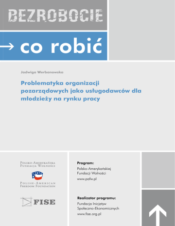 Jadwiga Werbanowska Problematyka organizacji pozarządowych jako usługodawców dla młodzieży na rynku pracy 0ROGRAM 0OLSKO!MERYKAÎSKIEJ &UNDACJI7OLNOyCI WWWPAFWPL 2EALIZATORPROGRAMU &UNDACJA)NICJATYW 3POECZNO%KONOMICZNYCH WWWFISEORGPL Jadwiga Werbanowska Problematyka organizacji pozarządowych jako usługodawców dla młodzieży na rynku pracy Warszawa 2006 a Spis treści Problemy młodzieży na rynku pracy Istotne instytucje 5 7 Powiatowe Urzędy Pracy 7 Centra Informacji i Planowania Kariery Zawodowej 7 Gminne Centra Informacji 8 Akademickie Biura Karier 8 Kluby Prac 8 Centra Edukacji i Pracy Młodzieży 8 Mobilne Centra Informacji Zawodowej 9 Instytucje niepubliczne 9 Organizacje pozarządowe jako usługodawcy 10 Przykładowe inicjatywy i wzory działań organizacji pozarządowych 13 Towarzystwo Altum 13 Fundacja na Rzecz Rozwoju Polskiego Rolnictwa (FDPA) 13 Fundacja „Bez Względu Na Niepogodę” 14 Wnioski i rekomendacje 16 a Problemy młodzieży na rynku pracy Statystyki urzędowe nie odzwierciedlają wystarczająco problemu bezrobocia wśród młodzieży. Młodzi ludzie, szczególnie jeśli nie posiadają prawa do zasiłku (vide absolwenci), mają małą motywację do rejestrowania się. Niechętnie poddają się rygorom wymogów i procedur urzędów. Możliwość ubezpieczenia zdrowotnego czy korzystania z instrumentów rynku pracy, takich jak, np. staże, przygotowanie zawodowe w miejscu pracy, szkolenia, nie dla wszystkich są wystarczającym powodem do rejestracji. Wychodząc z tego założenia można przypuszczać, że bezrobotna młodzież w większym stopniu niż ludzie o starszych kategoriach wiekowych, stanowi tzw. ciemną liczbę. Termin „bezrobotna” jest rozumiany w wymiarze życiowo-społecznym, a nie w formalno-prawnym czy statystycznym. Z drugiej strony trudno oszacować, jaki jest udział zarejestrowanych młodych bezrobotnych w nieoficjalnym zatrudnieniu. Dlatego też diagnozując bezrobocie jako problem społeczny, należy mieć na uwadze nie tyle statystyki, co złożoność tego problemu w sensie społecznym i psychologicznym, a także zagrożenia specyfiki terenu oraz rejonu zamieszkania. Bezrobocie młodzieży nie jest jedynie problemem braku pracy, ale braku możliwości prawidłowego funkcjonowania społecznego i udziału w życiu społeczności lokalnej. Młody człowiek nie posiadający pracy, w większym stopniu jest narażony na demoralizację i uleganie różnym patologiom. To osoba potencjalnie zagrożona wykluczeniem społecznym. Jednak odwołując się do wskaźników liczbowych, stopa bezrobocia wśród młodzieży utrzymuje się nieprzerwanie na wysokim poziomie. Jednocześnie wysoki udział młodzieży wśród osób bezrobotnych jest cechą charakterystyczną zjawiska bezrobocia w Polsce od początku lat 90-tych. Młodzi ludzie mają trudności z podjęciem pracy nie tylko z powodu nieodpowiednich kwalifikacji. Równie często brakuje im umiejętności szukania pracy oraz generalnie poruszania się w świecie instytucji społecznych, a także właściwości psychologicznych pozwalających na radzenie sobie na rynku pracy. W zdecydowanej większości młodzi nie rozumieją i nie doceniają znaczenia umiejętności społecznych (komunikatywność, autoprezentacja, pierwsze wrażenie, przygotowanie się i prowadzenie rozmowy kwalifikacyjnej, rozeznanie potrzeb drugiej strony, i in.) w procesie poszukiwania, pozyskiwania i utrzymania zatrudnienia. Przedstawiciele bezrobotnej młodzieży często pochodzą z rodzin niezamożnych, nierzadko tzw. problemowych, w wielu przypadkach jedno z rodziców jest niepracujące (renciści, bezrobotni, itp.) lub zagrożone utratą pracy. Dużym problemem jest, np. usamodzielnianie się wychowanków placówek opiekuńczo-wychowawczych oraz wychowanków rodzin zastępczych. Znaczna część młodzieży z rodzin zastępczych jest pod opieką ludzi starszych (zazwyczaj dziadków), raczej słabo wykształconych, nie mających żadnego pomysłu na dorosłe życie swoich podopiecznych. Wielu z nich po ukończeniu edukacji pozostaje w domu, nie wykazując większej inicjatywy w zakresie własnego usamodzielniania się. Również wychowankowie placówek opiekuńczo-wychowawczych nie bardzo mogą liczyć na wychowawców, czy pracowników socjalnych jako doradców i przewodników po rynku pracy. Czują się zagubieni, nie wykazują potrzebnej aktywności. Przeszkodą są nie tylko niewystarczające kwalifikacje oraz wiedza o rynku pracy, ale także zbyt niska motywacja do działania, wcześniejsze negatywne doświadczenia, brak dostatecznego kontaktu ze środowiskami pozytywnych oddziaływań. Istotną część młodych osób bezrobotnych stanowi także młodzież wywodząca się z rodzin korzystających długotrwale z pomocy społecznej, gdzie mamy do czynienia ze zjawiskami wyuczonej bezradności i bezrobocia dziedziczonego. Stopa bezrobocia w grupie osób mających 15 - 24 lata, które nie uczą się w szkole dziennej, wzrosła w latach 1998 – 2004 o 13 punktów procentowych, z 29% do 42% (M. Grewiński, 2005 r.). W pierwszym kwartale 2005 r. bezrobocie młodzieży do 24 roku życia wyniosło 41,2% (dane GUS, 2005 r., na podstawie BAEL), zaś wśród ogółu bezrobotnych zarejestrowanych przez urzędy pracy ta grupa wiekowa stanowiła 24,3% ( dane MGiP z końca 2004 r.). Tak wysoka stopa bezrobocia jest wyzwaniem dla wszystkich podmiotów gospodarczych oraz społecznych (prywatnych i publicznych), którym nie jest obojętna sytuacja kilkuset tysięcy młodych osób i ich rodzin. W opisanych powyżej środowiskach, rodzina nie stanowi ani wzoru, ani wsparcia w procesie usamodzielniania się i podejmowania zatrudnienia. Wywodzą się z nich nierzadko tzw. osoby przedsiębiorcze inaczej, które nauczyły się funkcjonować w oparciu o źródła finansowe spoza własnego zatrudnienia (np. ciemne interesy, przestępczość, świadczenia pomocy społecznej). Z tych środowisk pochodzi większość młodzieży, która w