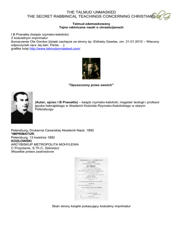 THE TALMUD UNMASKED THE SECRET RABBINICAL TEACHINGS CONCERNING CHRISTIANS Talmud zdemaskowany Tajne rabiniczne nauki o chrześcijanach I B Pranaitis (ksiądz rzymsko-katolicki) Z kościelnym imprimatur tłumaczenie Ola Gordon [dzięki zachęcie ze strony śp. Elżbiety Gawlas, zm. 21.01.2012 – Wieczny odpoczynek racz Jej dać, Panie. . .] grafika tutaj http://www.talmudunmasked.com/ "Opuszczony przez swoich" [Autor, ojciec I B Pranaitis] – ksiądz rzymsko-katolicki; magister teologii i profesor języka hebrajskiego w Akademii Kościoła Rzymsko-Katolickiego w starym Petersburgu Petersburg, Drukarnia Cesarskiej Akademii Nauk, 1892 *IMPRIMATUR: Petersburg, 13 kwietnia 1892 KOZŁOWSKI ARCYBISKUP METROPOLITA MOHYLEWA C Propolanis, S.Th.C, Sekretarz Wszelkie prawa zastrzeżone Skan strony książki pokazujący kościelny imprimatur Spis treści Wstęp Od redaktora Dedykacja autora Antyfona Prolog Opis Talmudu Lista ksiąg talmudycznych Źródła Część I – Nauka talmudyczna o chrześcijanach Rozdział I: Jezus Chrystus w Talmudzie Art. 1. Imiona Chrystusa Art. 2. Życie Chrystusa / Krzyż chrześcijański Art. 3. Nauki Chrystusa Rozdział II: Chrześcijanie w Talmudzie Art. 1 Nazewnictwo chrześcijan Art. 2. Czego Talmud uczy o chrześcijanach Art. 3. Religia chrześcijańska Część II – Nakazy Talmudu wobec chrześcijan Rozdział I: Chrześcijan należy unikać Art. 1. Chrześcijanie nie zasługują na relacje z żydami Art. 2. Chrześcijanie są nieczyści Art. 3. Chrześcijanie są bałwochwalcami Art. 4. Chrześcijanie są źli Rozdział II: Chrześcijan powinno się eksterminować Art. 1. Chrześcijan należy krzywdzić pośrednio 1. Nie udzielać im pomocy 2. Ingerować w ich pracę 3. Oszukiwać w sprawach prawnych 4. Szkodzić im w rzeczach koniecznych do życia Art. 2. Chrześcijan należy krzywdzić bezpośrednio 1. Należy zabijać renegatów 2. Apostaci 3. Należy zgładzić książęta, zwłaszcza Księcia Rzymu (papież) 4. Wszystkich chrześcijan powinno się zabić 5. Zabicie chrześcijanina jest akceptowalną ofiarą dla Boga 6. Niebo obiecane dla tych, którzy zabijają chrześcijan 7. Chrześcijanina można ściąć w najbardziej uroczyste święta 8. Oczekiwany Mesjasz będzie mściwy 9. Żydowskie modlitwy przeciwko chrześcijanom 10. Chrześcijańskie modlitwy za żydów Apendyks – Jak papieże traktowali żydów EPILOG Łaskawy Czytelniku: W niniejszej pracy zacytowałem tylko bardzo niewiele ksiąg talmudycznych odnoszących się do chrześcijan. Dla zachowania zwięzłości tekstu i oszczędzenia wrażliwej duszy, pominąłem wiele innych, które mogłyby zostać włączone. Ale teksty, które zacytowałem, powinny wystarczyć, żeby wykazać, jak fałszywe są twierdzenia żydów, gdy mówią, że w Talmudzie nie ma nic, co uczy nienawiści i wrogości do chrześcijan. Jeśli cię to oburzyło, chrześcijański czytelniku, żeby poznać te straszne bluźnierstwa w niniejszej książce, nie kieruj swojego gniewu na mnie. Nie powiedziałem na początku o tym, że miałem opowiedzieć coś przyjemnego, a tylko żeby pokazać czego naprawdę uczy Talmud o chrześcijanach, i nie uważam żebym mógł to zrobić w bardziej odpowiedniej formie. Ale zdaję sobie sprawę z tego, że jeśli prawda nie jest miła dla każdego, to może być wielu, którzy staną się moimi wrogami za samo świadczenie o prawdzie. I przypominano mi o tym, zarówno przez prawo samego Talmudu, które grozi śmiercią "zdrajcom", a bardziej przez ostrzeżenia tych, którzy doświadczyli działań podejmowanych przez żydów przeciwko tym, którzy ujawniają rzeczy dla nich niekorzystne. Zapowiedzieli, że zginę z rąk żydów. Próbując powstrzymać mnie przed napisaniem tej książki, niektórzy prosili mnie, bym przypomniał sobie o losie profesora Charini, który nagle zginął po tym kiedy podjął się tłumaczenia Talmudu na język lokalny. Inni przypominali mi o losie mnicha Didakusa z Wilna, konwertyty z judaizmu, który został okrutnie zamordowany; jeszcze inni o tych, którzy byli prześladowani za to, że ujawniali tajemnice religii żydowskiej. Jeszcze inni ostrzegali mnie przed niebezpieczeństwem wobec moich bliskich. "Ale ciebie żydzi zabiją", powtarzano mi setki razy. Książka którą trzymasz w rękach jest najlepszym dowodem na to, że nie zważałem na ostrzeżenia przyjaciół. Uznałem, że nie warto milczeć tylko w zamian za moje bezpieczeństwo, podczas gdy szaleje konflikt między dwoma obozami "semitów" i "antysemitów", z których każdy twierdzi, że walczy o prawdę, a ja wiem, że w żadnym z nich nie ma całej prawdy. Ale cokolwiek mi się wydarzy w wyniku tego co zrobiłem, przyjmę z zadowoleniem. Jestem gotów oddać swoje życie – NA TO PRZYSZEDŁEM NA ŚWIAT, ABY DAĆ ŚWIADECTWO PRAWDZIE (J 18:37) I B PRANAITIS OD REDAKTORA Wielu ludzi dzisiaj jest żywotnie zainteresowanych tym by dowiedzieć się, czego naprawdę uczy żydowski Talmud o chrześcijanach, i dla dokładnego autentycznego traktatu na ten temat, nie ma potrzeby szukać dalej niż w pracy naukowej ks B Pranaitisa, zdolnego katolickiego teologa i hebraisty, wcześniej pracownika uczelni rzymskokatolickiej, Carskiej Akademii w starym Petersburgu. Jego praca jest po hebrajsku i po łacinie i nosi imprimatur jego kościelnego przełożonego. Jest to dokładny przekład łacińskiego tekstu o. Pranaitisa, i według nas docenią go ci, których interesuje to co napisał ten wielki uczony na ten istotny temat, posługując się oryginalnymi źródłami talmudycznymi. O. Pranaitis był jednym z tych "zlikwidowanych" przez Czekę podczas rewolucji bolszewickiej w Rosji. Wielu czytelników pamięta, że w 1934 roku opublikowaliśmy książkę zatytułowaną "Are These Things So?" [Czy tak wyglądają te sprawy?], o której liczni powiedzieli, że ujawnia wiele nieznanych im rzeczy. Żaden czytelnik mający otwarty umysł mógłby odpowiedzieć przecząco na to tytułowe pytanie. Uważam