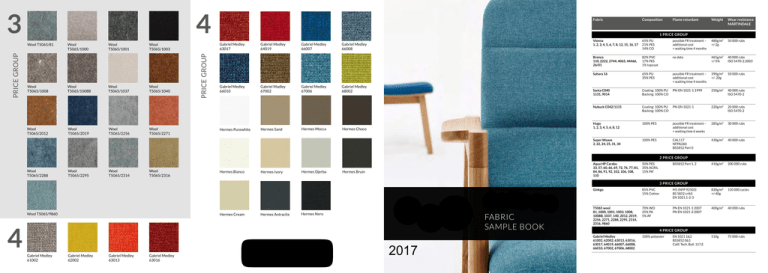 price group Wool T5065/81 Wool T5065/1000 Wool T5065/1001 4 Wool T5065/1003 Gabriel Medley 63017 Gabriel Medley 66007 Gabriel Medley 66008 Gabriel Medley Gabriel Madley Gabriel Medley 67006 68002 67002 Wool T5065/2019 Gabriel Medley 64019 Wool T5065/2012 Medley Wool Wool Gabriel T5065/1037 T5065/1040 66010 Wool T5065/1008B Hermes Wool Mocca Hermes Choco Hermes Sand Hermes Purewhite T5065/2271 Wool T5065/2256 Composition Flame retardant Weight Wear resistance MARTINDALE 1 PRICE GROUP Fabric Wool T5065/1008 price group 3 Vienna 1, 2, 3, 4, 5, 6, 7, 8, 12, 15, 16, 17 65% PU 21% PES 14% CO possible FR treatment – additional cost + waiting time 4 months 480g/m² +/-2g 50 000 rubs Bronco 110, 2222, 2744, 4065, 44466, 26/01 82% PVC 17% PES 1% topcoat no data 465g/m² +/-5% 40 000 rubs ISO 5470-2:2003 Sahara 16 65% PU 35% PES possible FR treatment – additional cost + waiting time 4 months 390g/m² +/- 20g 50 000 rubs Santa C040 1131, 9014 Coating: 100% PU Backing: 100% CO PN-EN 1021-1:1999 250g/m² 40 000 rubs ISO 5470-2 Nubuck C042/1131 Coating: 100% PU Backing: 100% CO PN-EN 1021-1 220g/m² 20 000 rubs ISO 5470-2 Hugo 1, 2, 3, 4, 5, 6, 8, 12 100% PES possible FR treatment – additional cost + waiting time 6 weeks 285g/m² 30 000 rubs Super Weave 2, 22, 24, 25, 31, 34 100% PES CAL117 NFPA260 BS5852 Part 0 430g/m² 40 000 rubs 410g/m² 200 000 rubs 2 PRICE GROUP Wool T5065/2288 Wool T5065/2295 Wool T5065/2314 Wool T5065/2316 Hermes Bruin Hermes Bianco Djerba Ivory Hermes Hermes Aqua HP Carabu 33, 57, 60, 66, 69, 72, 76, 77, 81, 84, 86, 91, 92, 102, 106, 108, 110 50% PES 35% ACRIL 15% PA” BS5852 Part 1, 2 3 PRICE GROUP Wool T5065/9860 4 Gabriel Medley 61002 Gabriel Medley 62002 Gabriel Medley 63013 Gabriel Medley 63016 Hermes Nero Hermes Cream Hermes Antracite www.paged.pl 2017 85% PVC 15% Cotton M1 (NFP 92503) BS 5852 crib5 EN 1021.1-2-3 830g/m² +/-40g 150 000 cycles T5065 wool 81, 1000, 1001, 1003, 1008, 1008B, 1037, 140, 2012, 2019, 2256, 2271, 2288, 2295, 2314, 2316, 9860 70% WO 25% PA 5% AF PN EN 1021-1:2007 PN EN 1021-2:2007 400g/m² 40 000 rubs 510g 75 000 rubs PAGED CONTRACT FABRIC SAMPLE BOOK Ginkgo 4 PRICE GROUP Gabriel Medley 61002, 62002, 63013, 63016, 63017, 64019, 66007, 66008, 66010, 67002, 67006, 68002 100% polyester EN 1021 1&2 BS5852 0&1 Calif. Tech. Bull. 117,E Vienna 2 Vienna 3 Vienna 4 Vienna 5 Vienna 6 Vienna 7 Vienna 8 Vienna 10 Vienna 15 Vienna 16 Bronco 110 Bronco 2222 Bronco 2744 3 Carabu 77 Carabu 78 Carabu 81 Carabu 86 Carabu 91 Carabu 92 Carabu 94 Carabu 98 Super Weave 22 Carabu 102 Carabu 107 Carabu 108 Super Weave 31 Super Weave 34 Nordic 101 Nordic 113 Nordic 114 Carabu 57 Carabu 60 Nordic 116 Nordic 117 Nordic 129 Ginkgo Morgon Ginkgo Pivoine Ginkgo Seigle Hugo 1 Hugo 2 Hugo 3 Hugo 5 Hugo 6 Hugo 8 Hugo 11 Hugo 12 Vienna 17 Hugo 13 Hugo 14 Super Weave 10 Bronco 4065 Super Weave 24 Super Weave 25 Carabu 33 Carabu 49 price group Vienna 1 2 Ginkgo Chocolat Ginkgo Dune Ginkgo Mastic Ginkgo Blanc Ginkgo Mirabelle Ginkgo Tomette Ginkgo Citrouille Ginkgo Begonie Carabu 110 Ginkgo Tomate Ginkgo Quetsche Ginkgo Cafe Ginkgo Anthracite Nordic 115 Ginkgo Myrtille Ginkgo Lavande Ginkgo Lilas Ginkgo Nuit Ginkgo Turquoise Ginkgo Pierre Ginkgo Souris Ginkgo Taupe Ginkgo Terre Ginkgo Amande Ginkgo Granny price group 1 price group price group 1 2 Bronco 4466 Bronco 26/01 Sahara 16 Santa 040/1131 3 Santa 040/9014 Nubuk 042/1131 Carabu 69 Carabu 72 Carabu 75 Carabu 76 Ginkgo Groseille